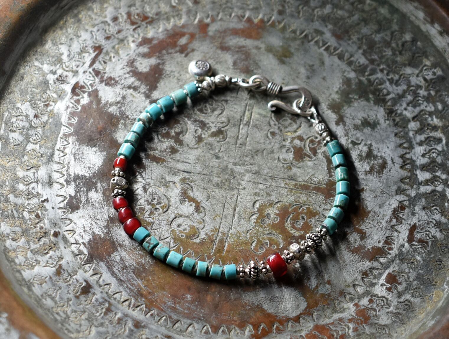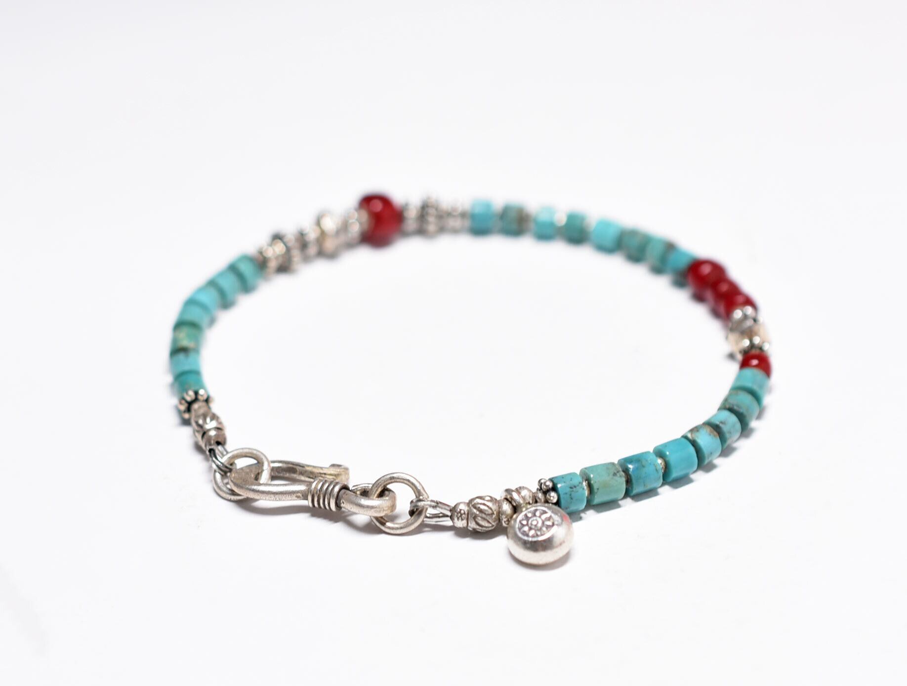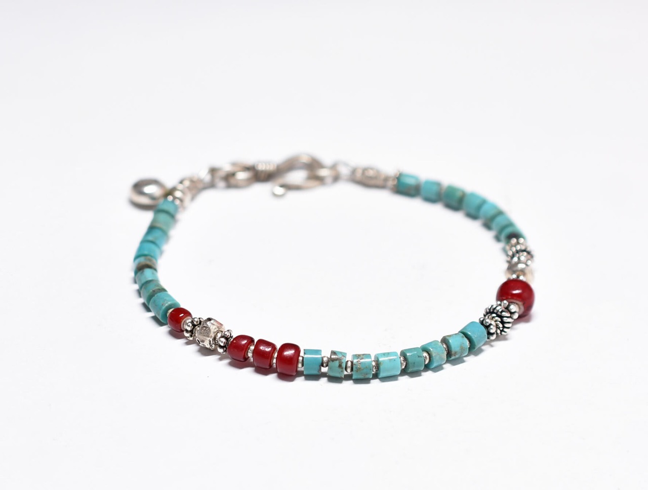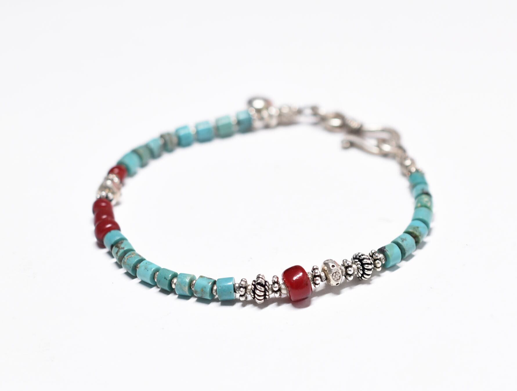 筒型ターコイズと濃赤ホワイトハーツ、カレンシルバーを繋いだブレスです。