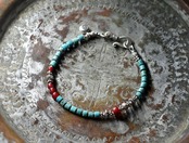 筒型ターコイズと濃赤ホワイトハーツ、カレンシルバーのブレス