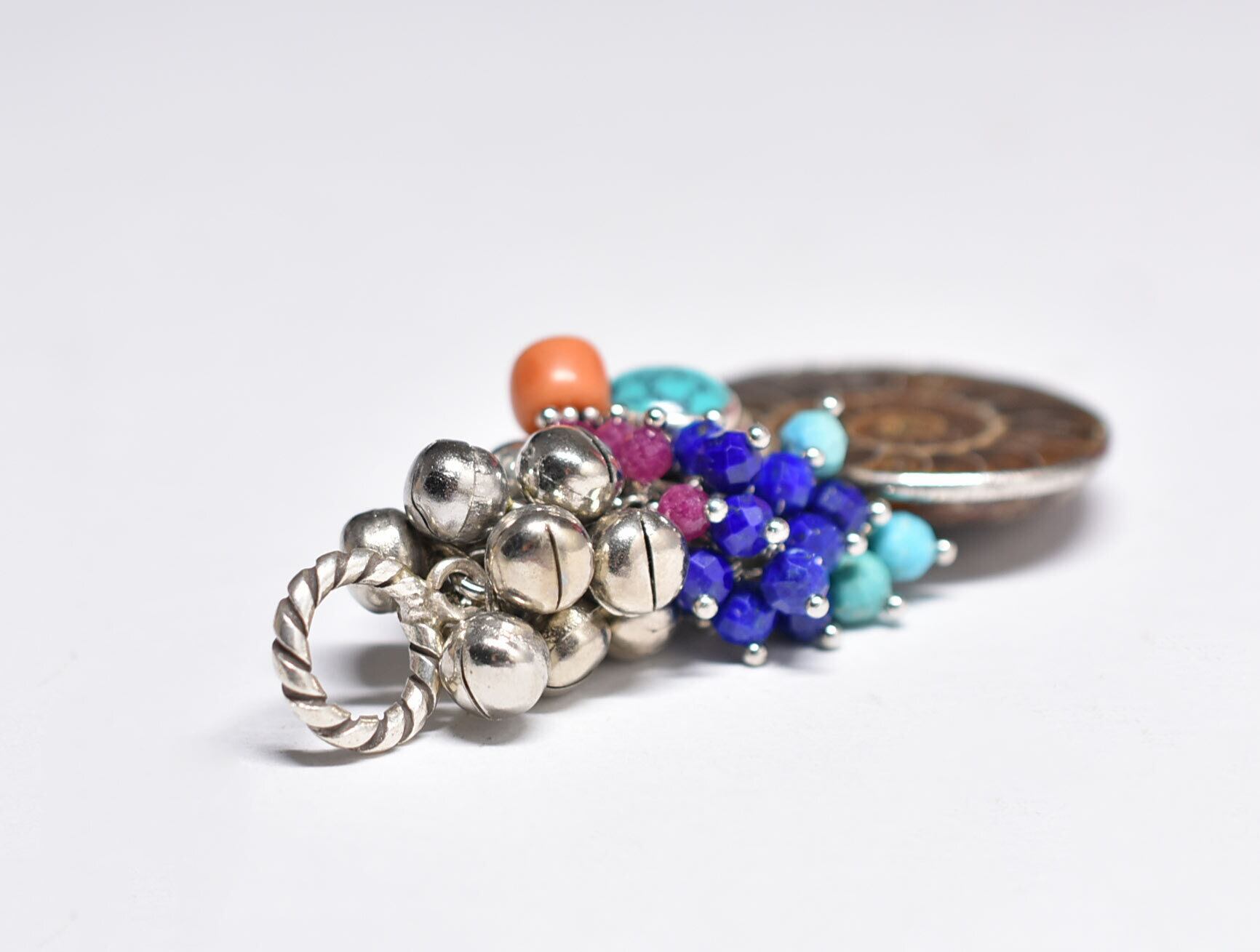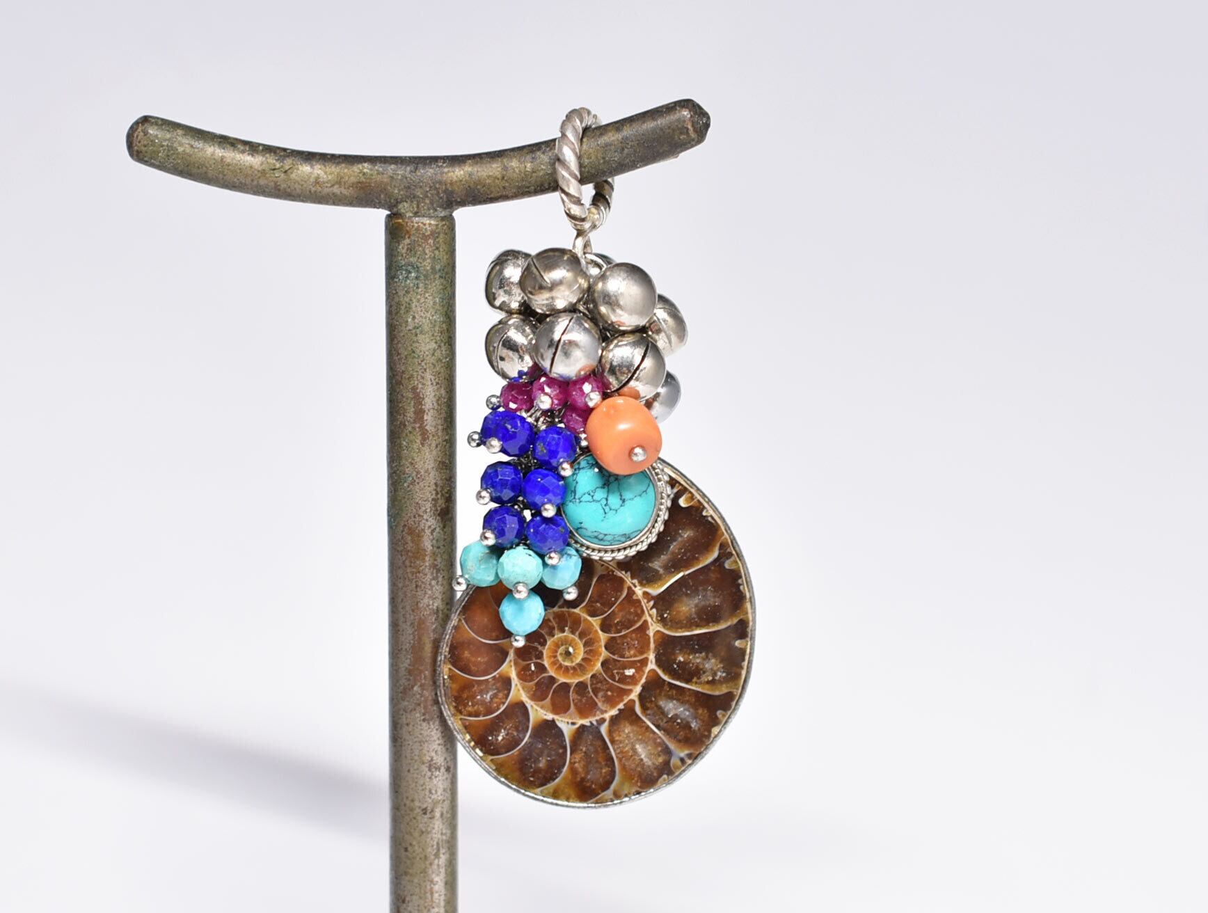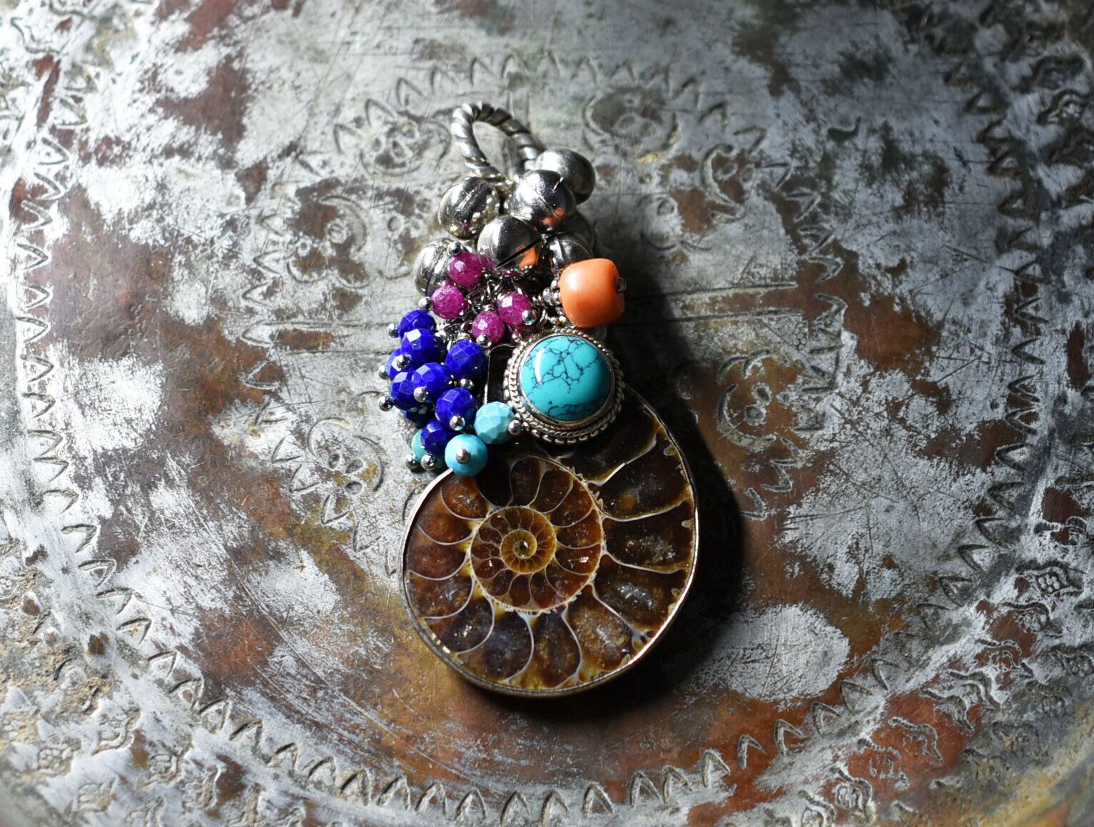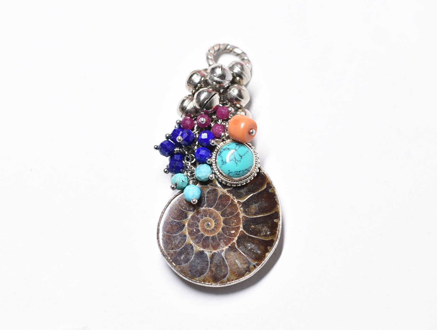 アンモナイトと繊細シルバー装飾ターコイズ、たわわな鈴とターコイズ&ラピス&ルビー、チベタンコーラルを繋いだペンダントトップです。