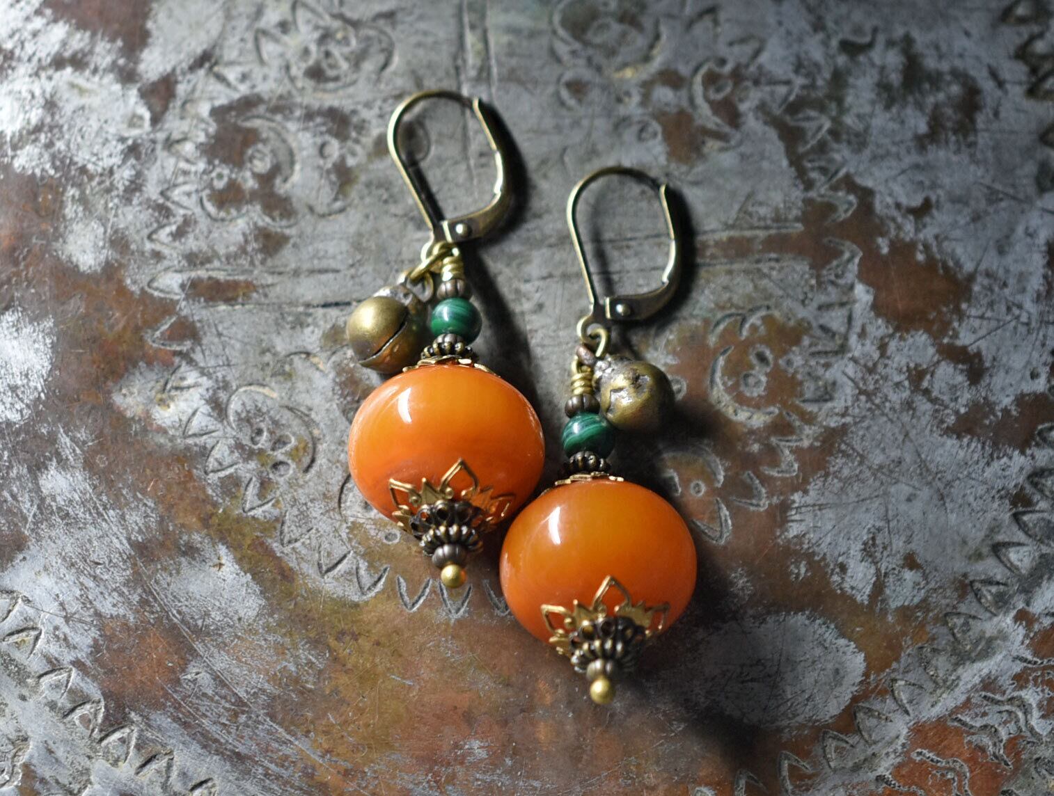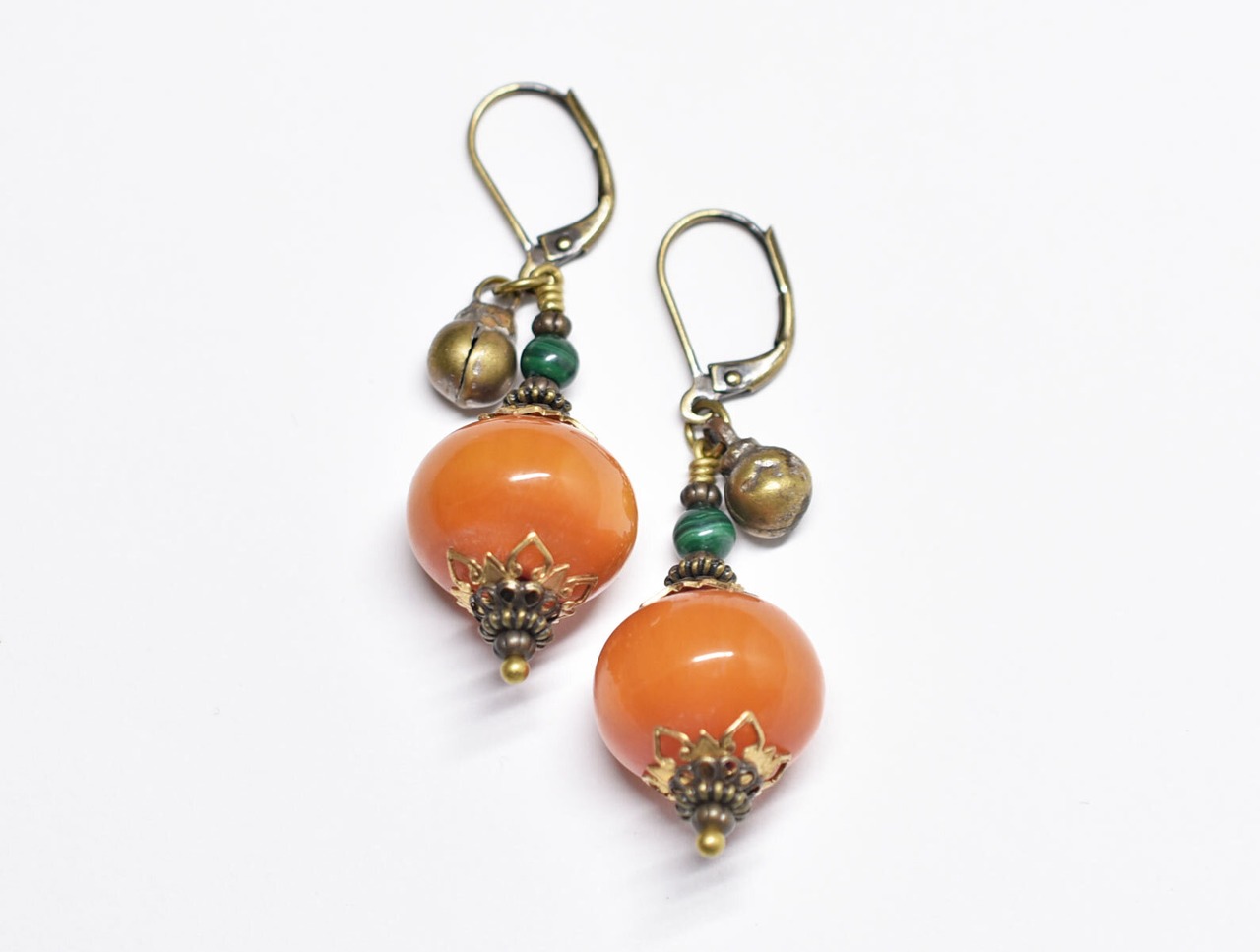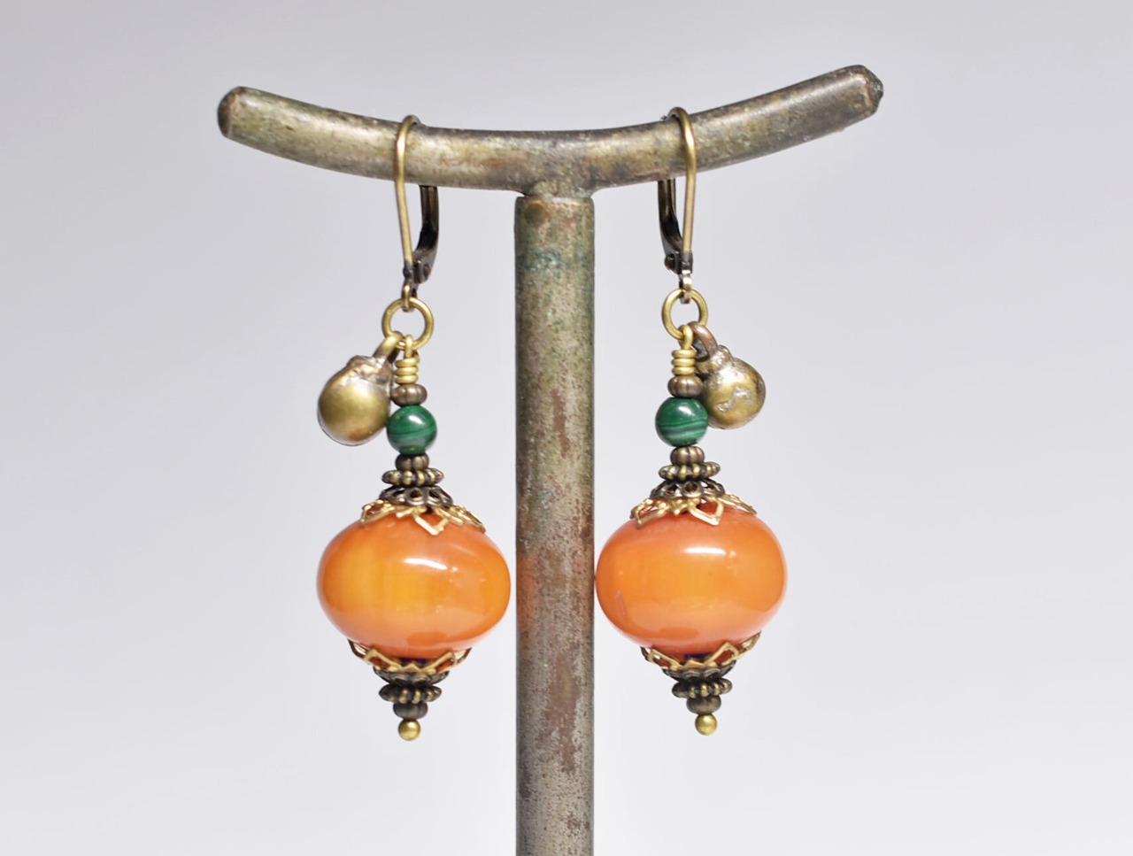 プックリ艶やかなアフリカンアンバーとマラカイト、隠しブルービーズ、民族鈴を繋いだピアスです。