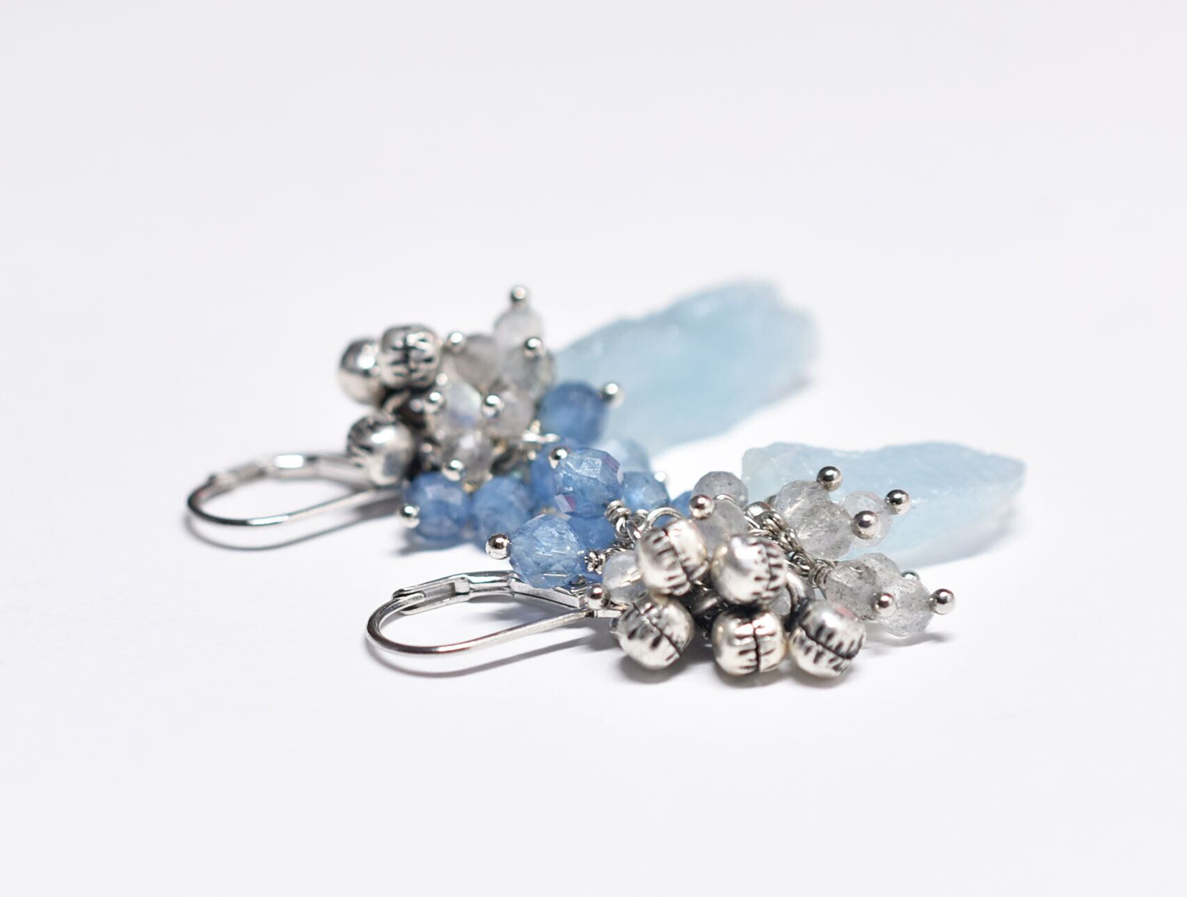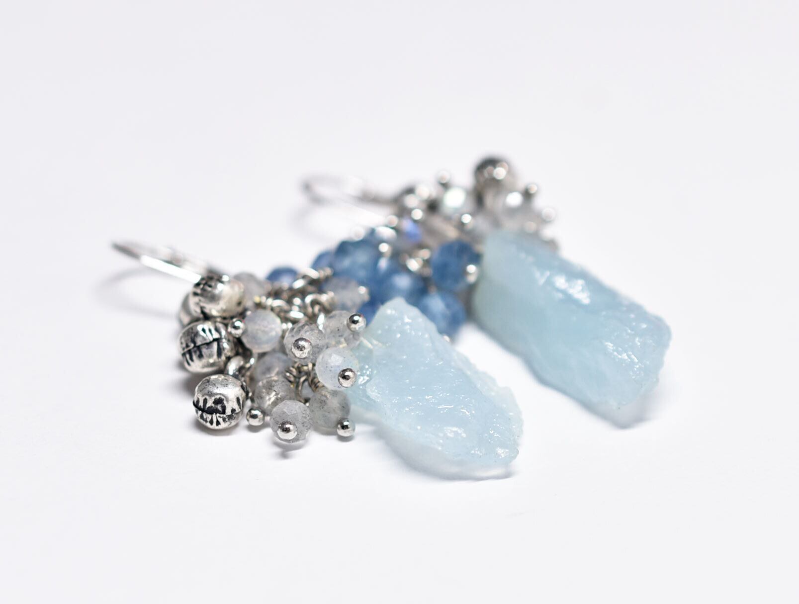 氷柱アクアマリンとたわわなアクアマリン&ラブラドライト&インドシルバー鈴のピアス
