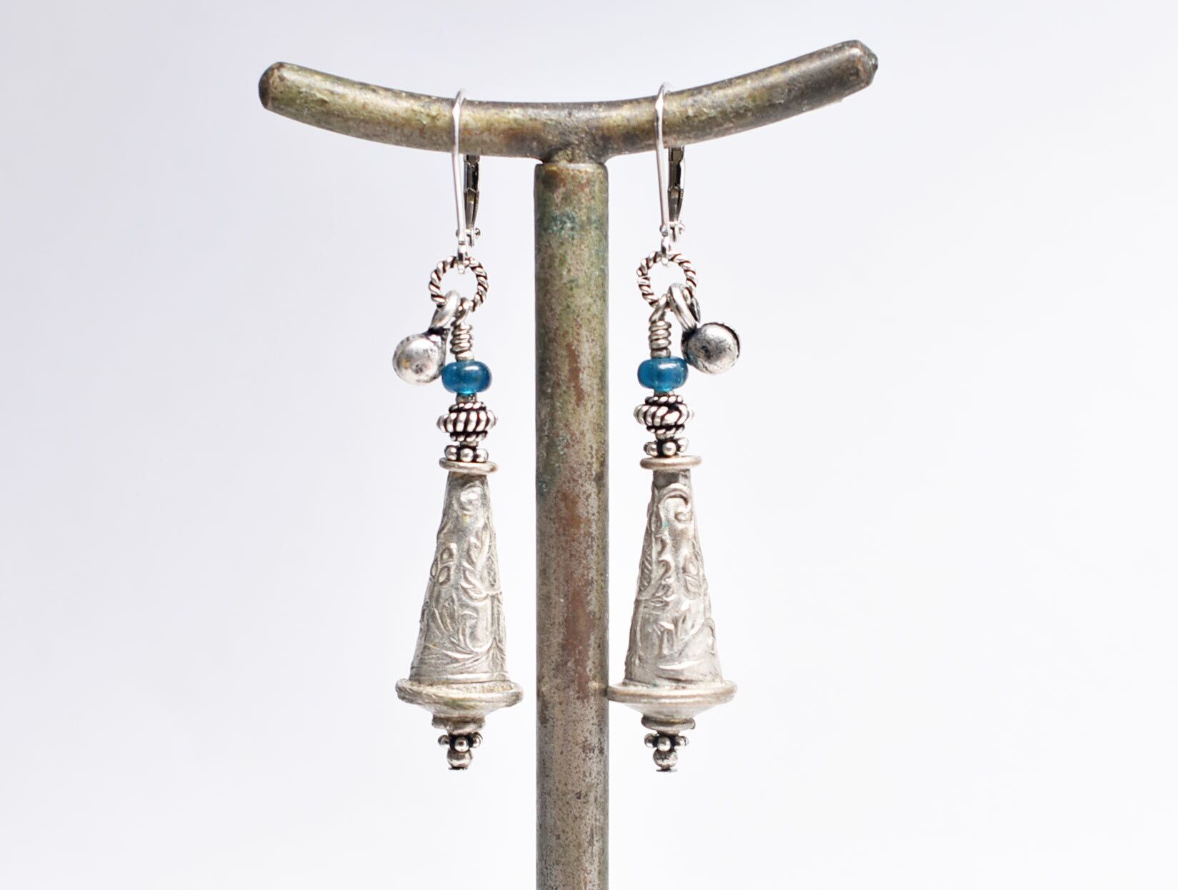 oldアフガンメタルとインディゴブルーアンティークビーズ、インドシルバー鈴を繋いだピアスです。