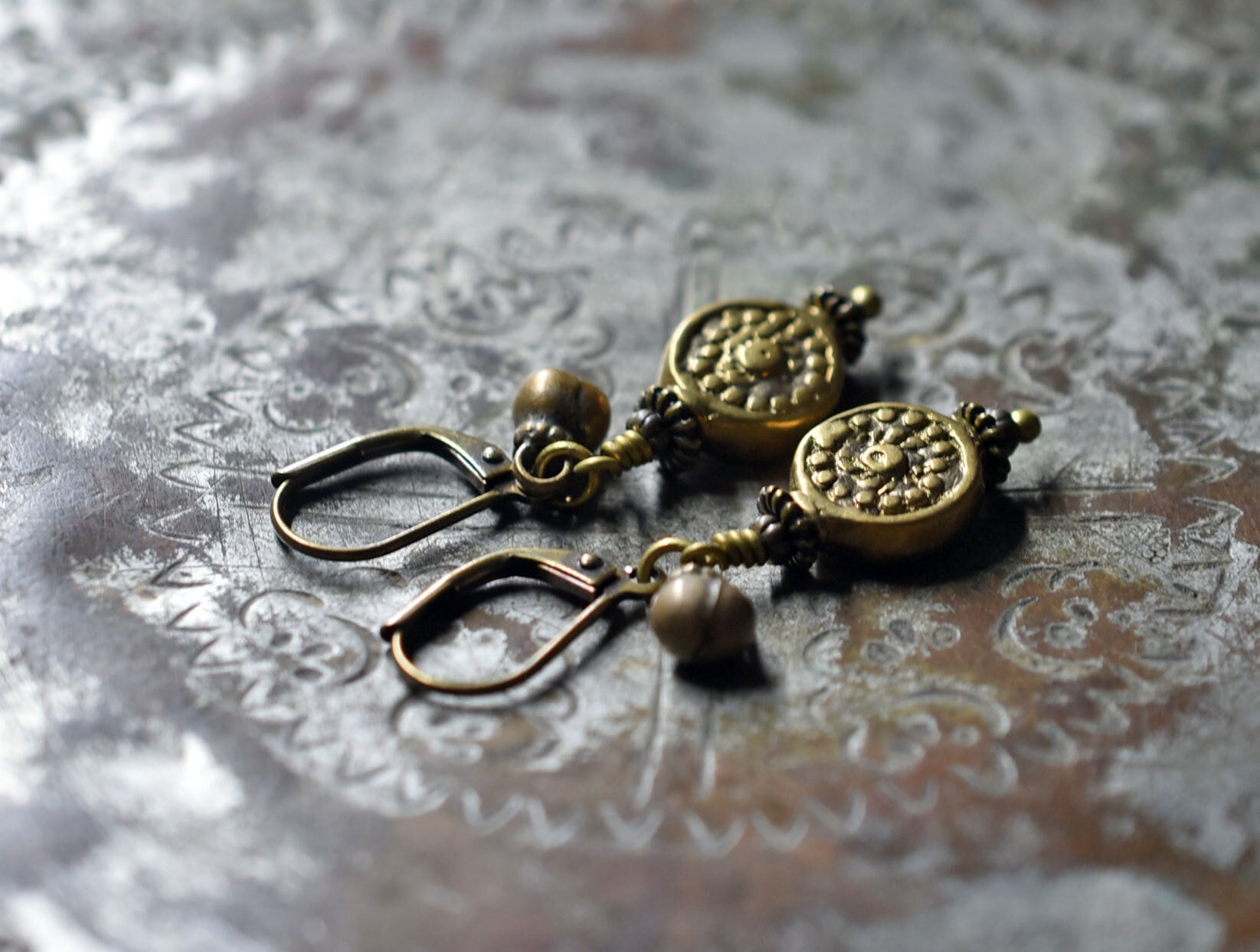 コインの様なインドブラス、小さな民族鈴を繋いだピアスです。