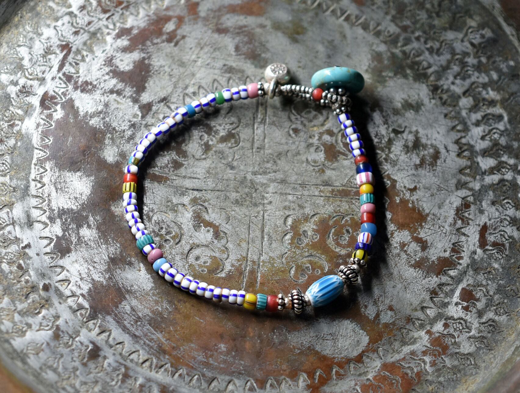 スカイブルーシェブロンビーズと多彩アンティークヴェネチアビーズのブレス(ターコイズ留め金)
