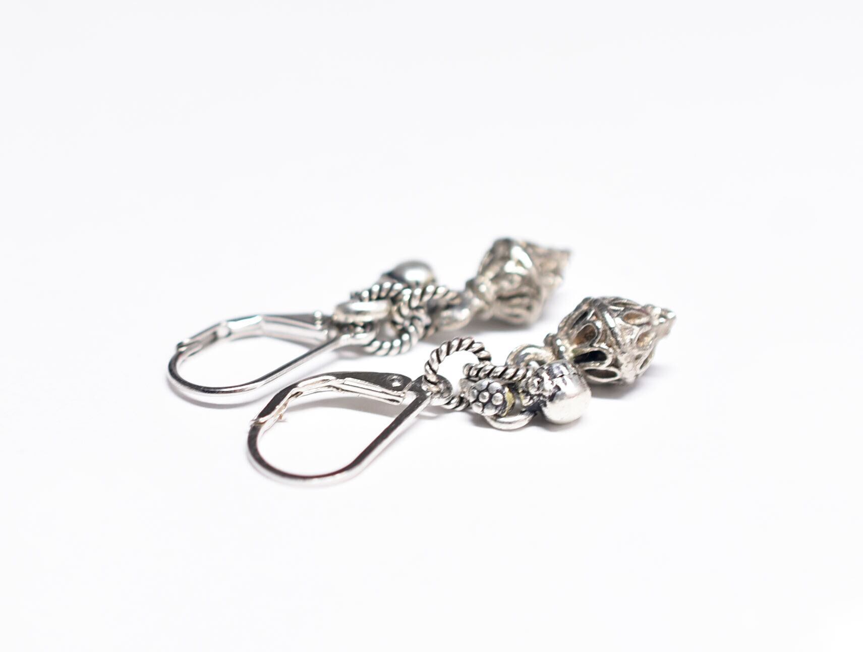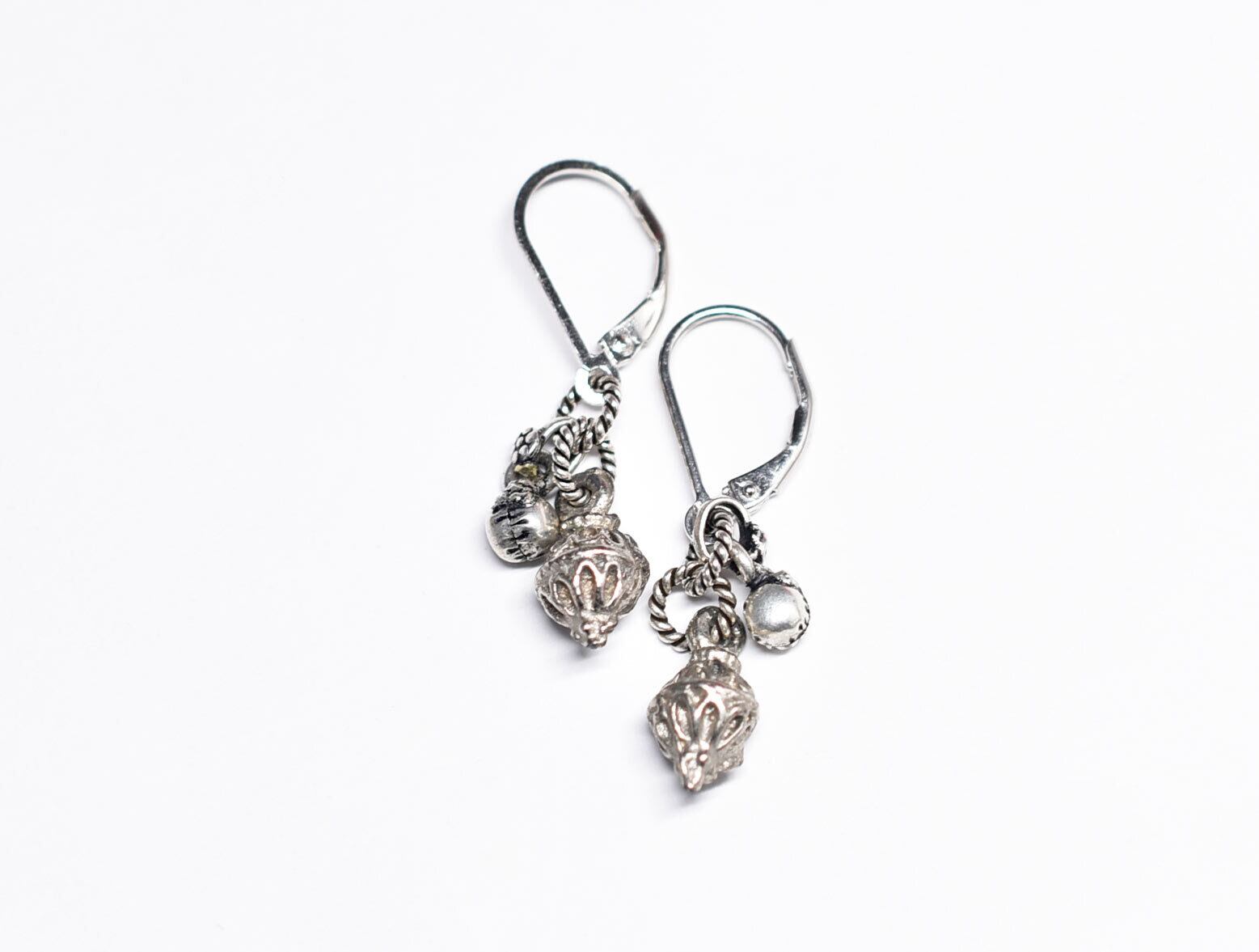 インドピューター繊細細工パーツと花付き小さなインド鈴のピアス