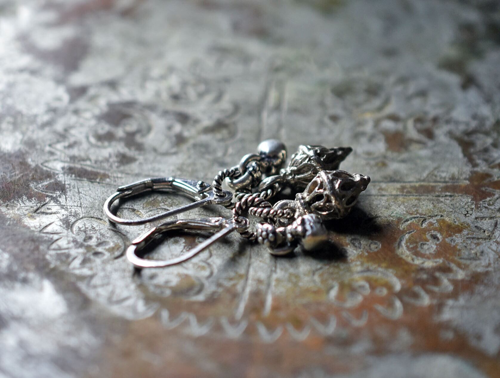 インドピューター繊細細工パーツと花付き小さなインド鈴を繋いだピアスです。