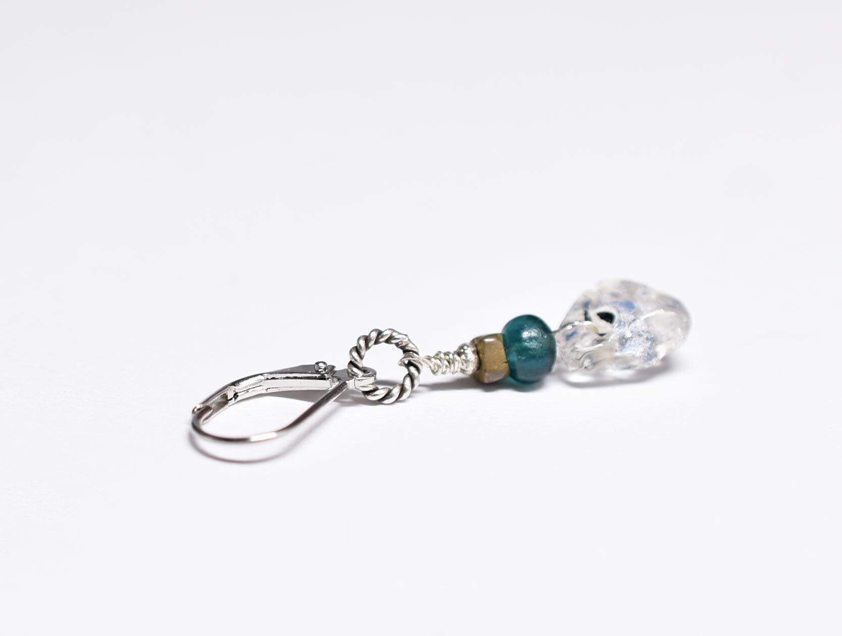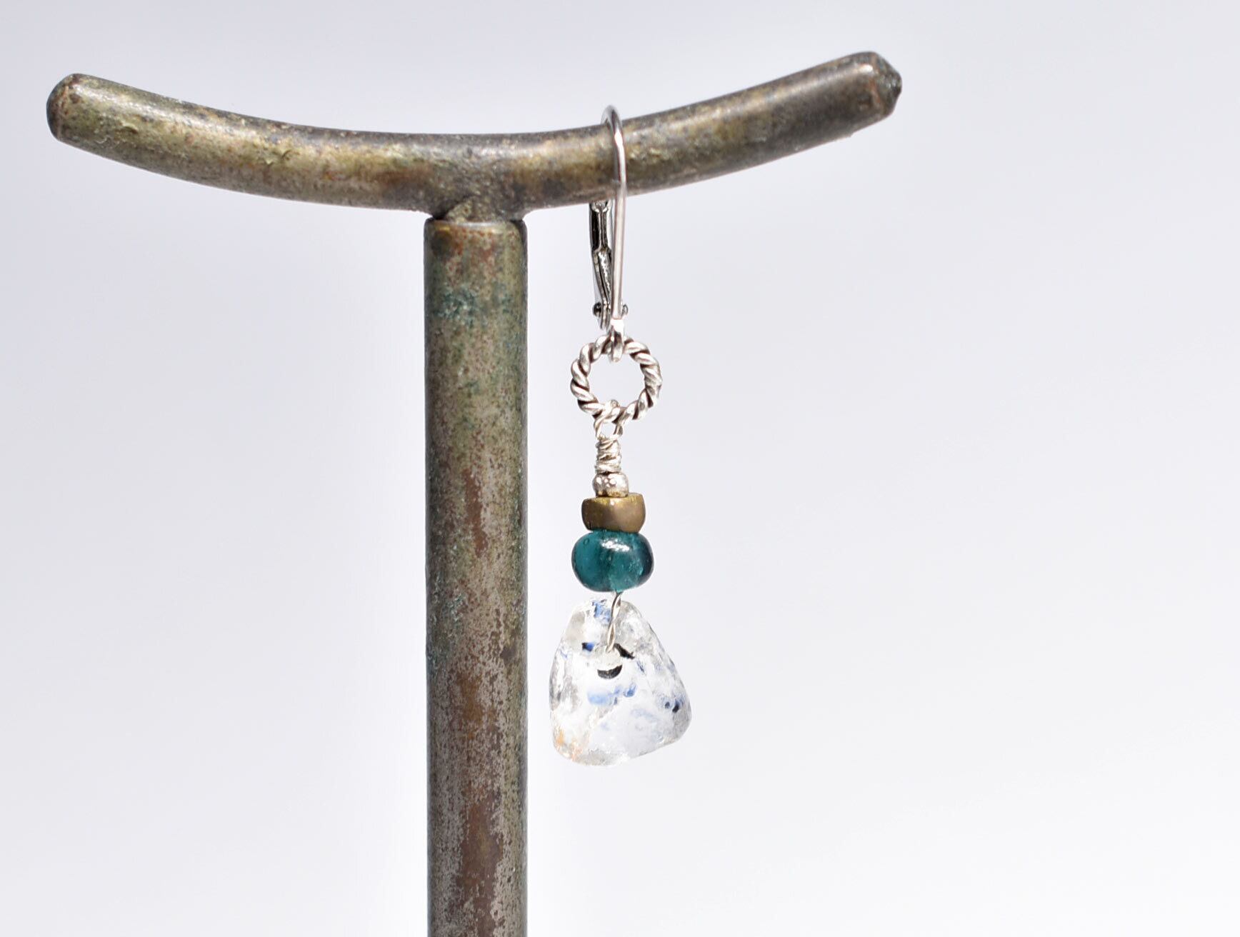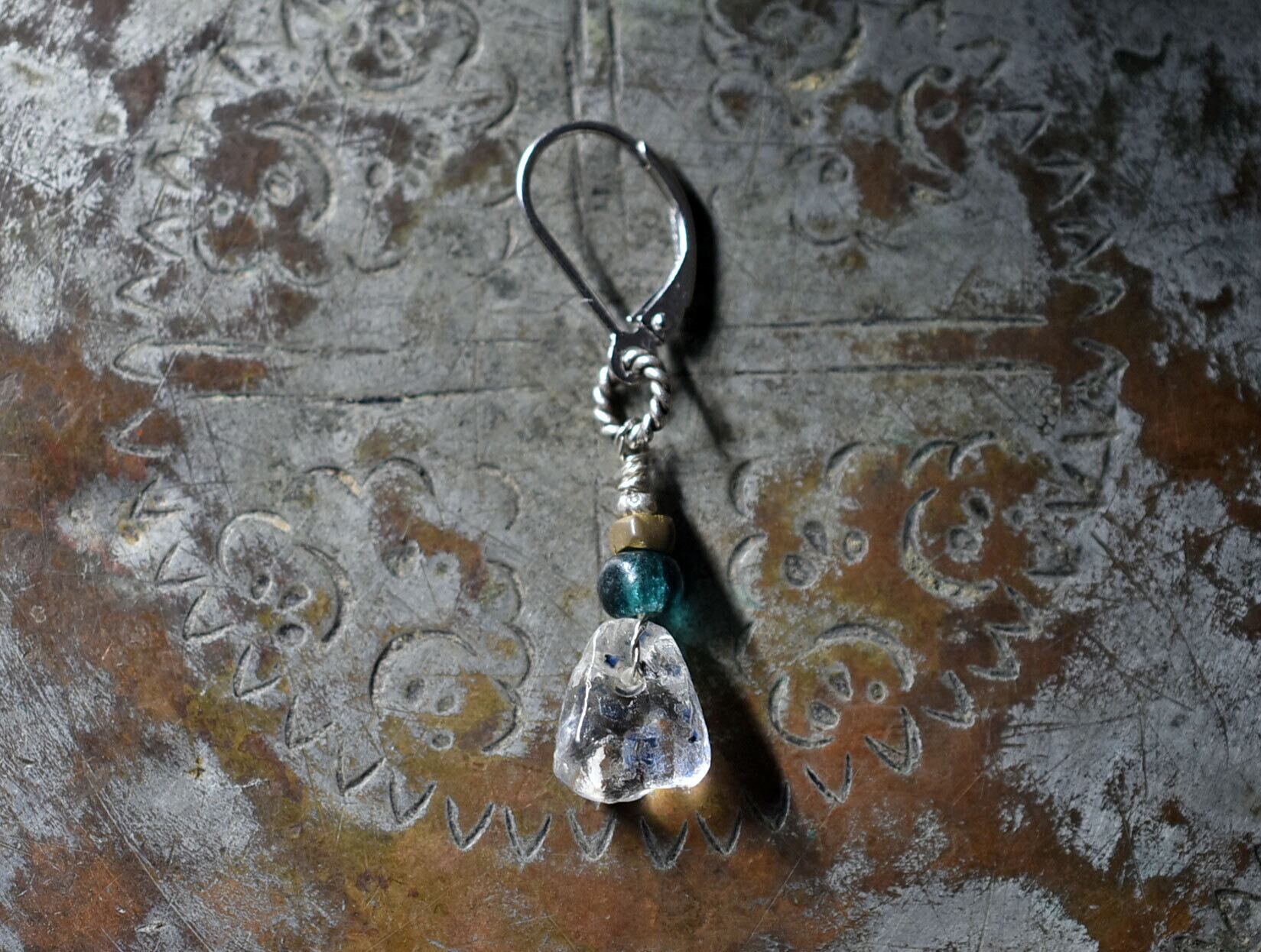 雫型古代施釉水晶とインディゴブルーアンティークビーズ、oldオリッサブラスの片耳ピアス