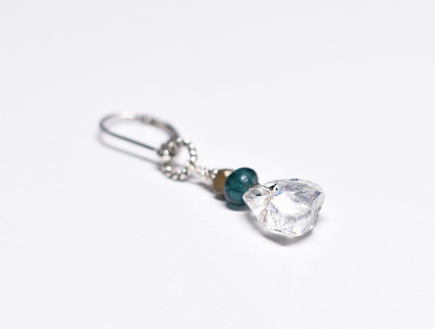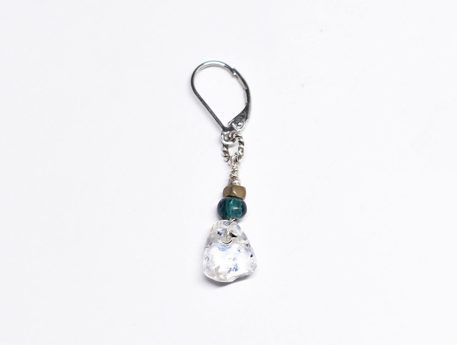 雫型古代施釉水晶とインディゴブルーアンティークビーズ、oldオリッサブラスなどを繋いだ片耳ピアスです。