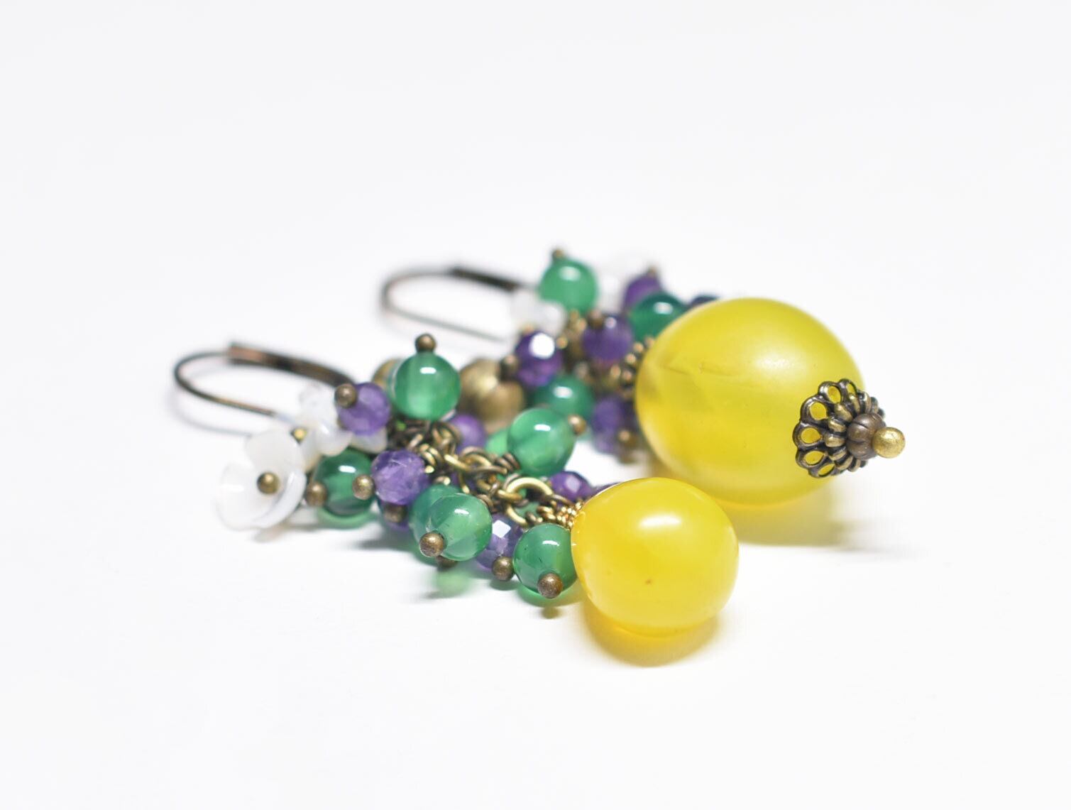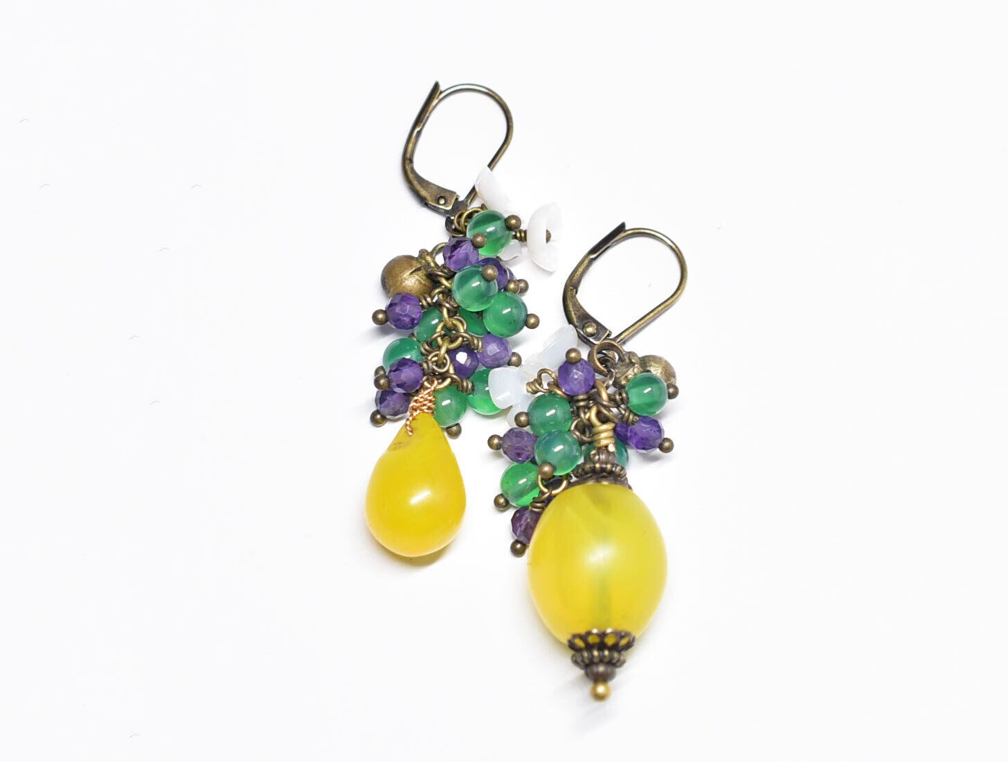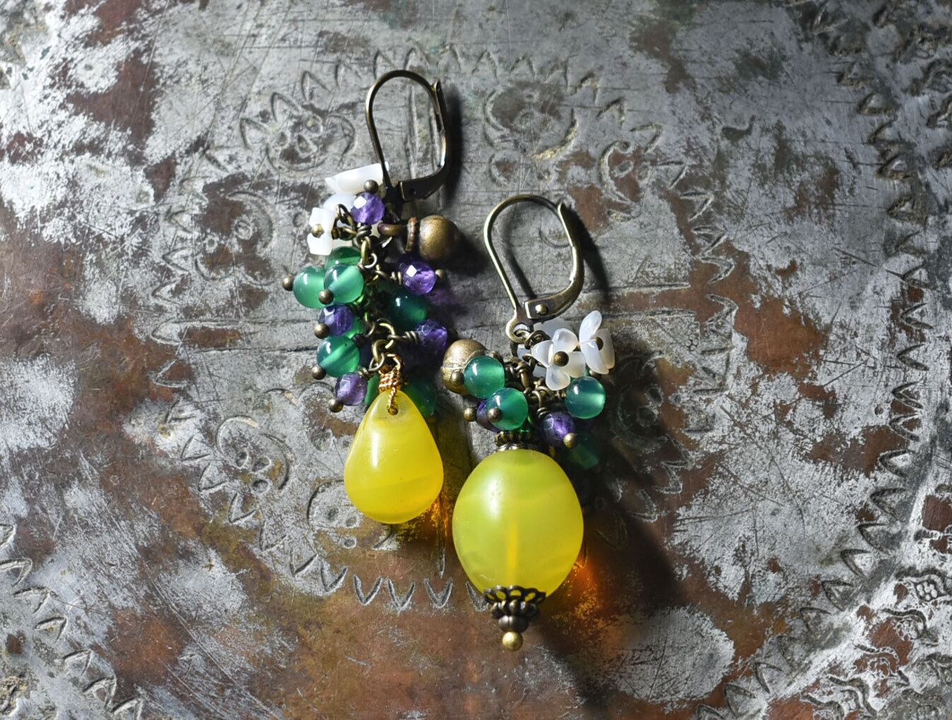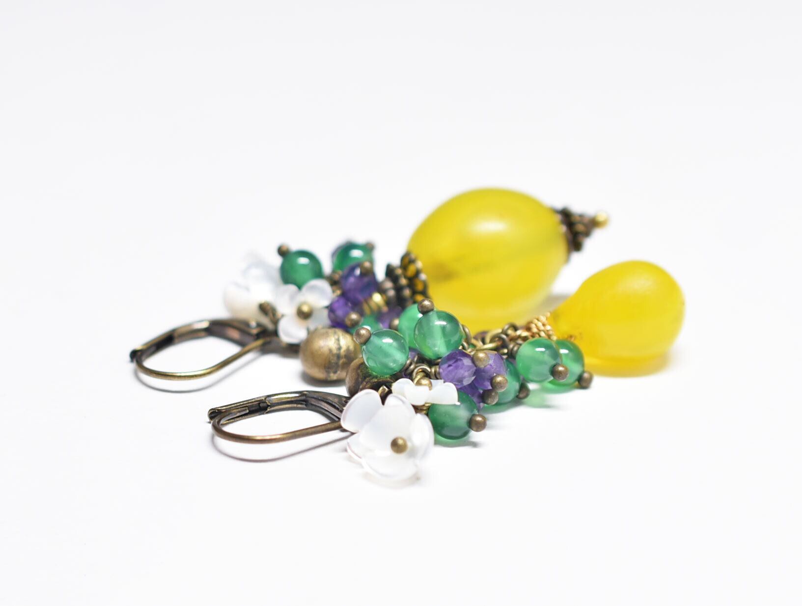 レモンイエローエチオピアンチェリー&ウエディングビーズ、たわわなアメジストとグリーン瑪瑙、白蝶貝の小花、民族鈴を繋いだピアスです。