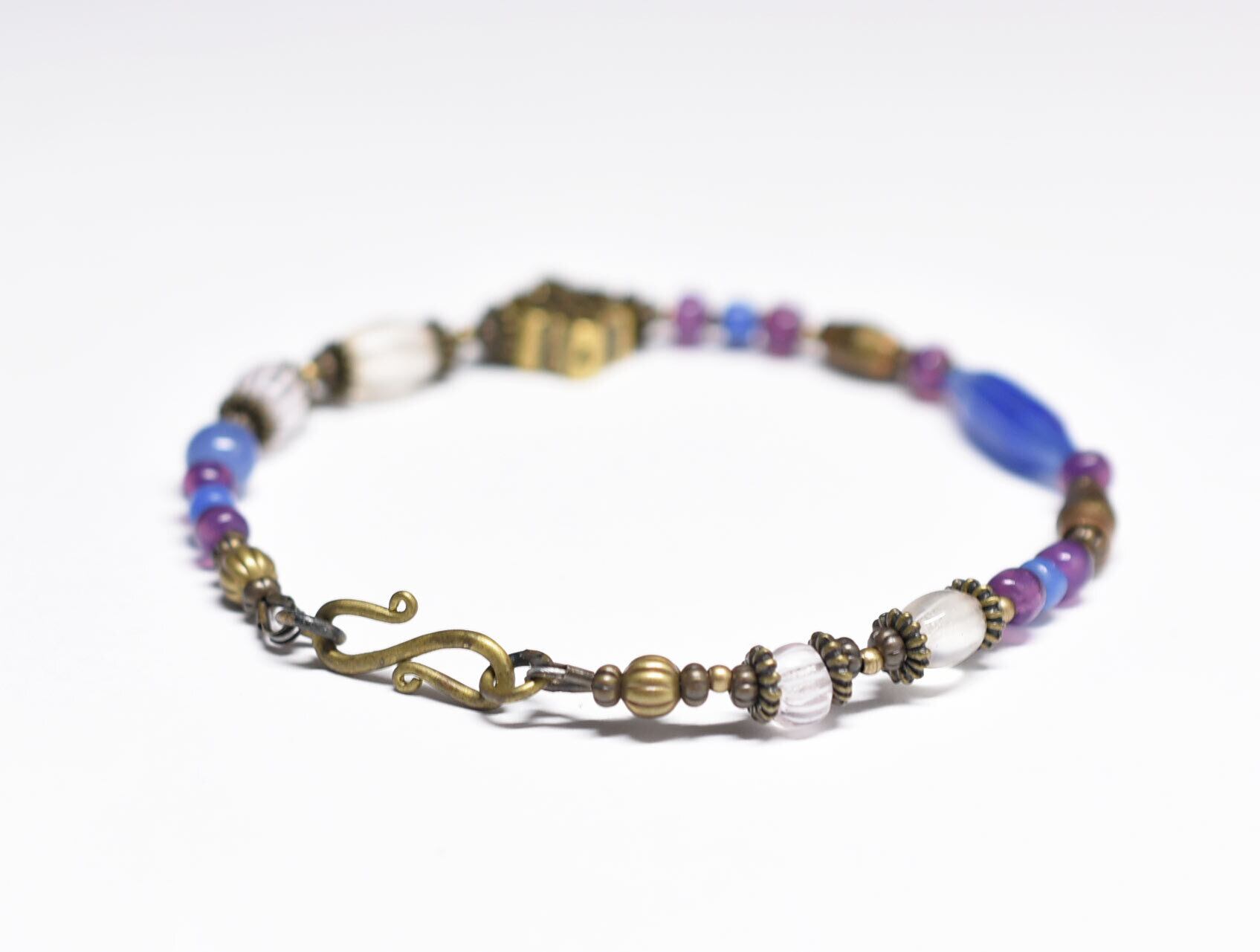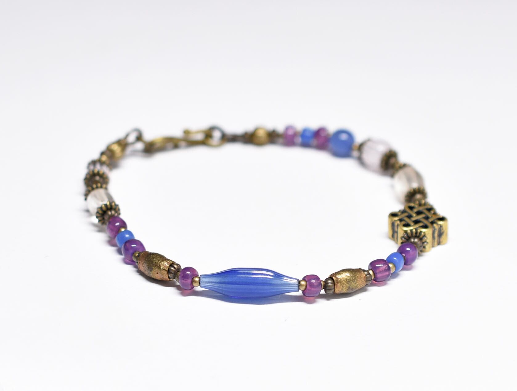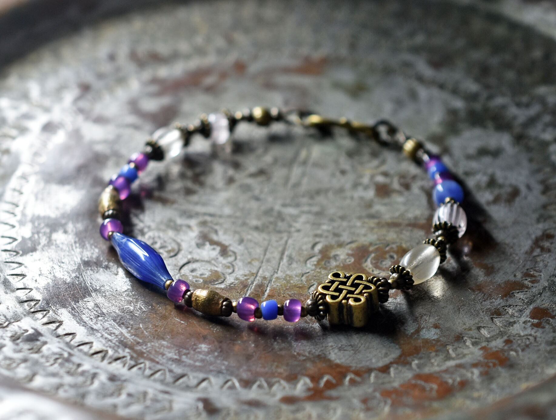エンドレスノットとアンティークボヘミアビーズ、グーズベリー、ロシアンブルー、すみれ色&ブルービーズのブレス