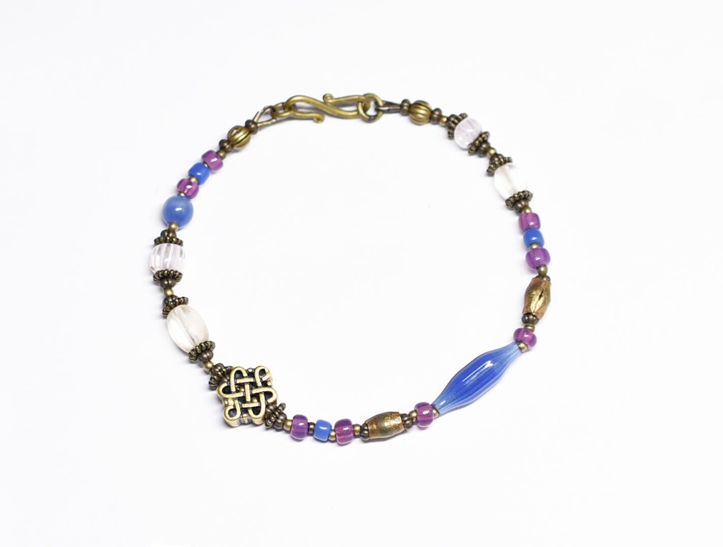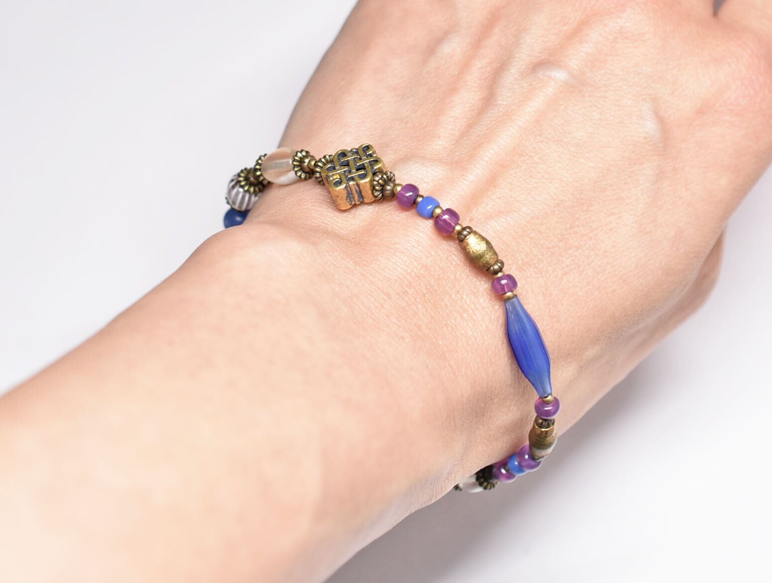 エンドレスノットとアンティークボヘミアビーズ、グーズベリー、ロシアンブルー、すみれ色&ブルービーズなどを繋いだブレスです。