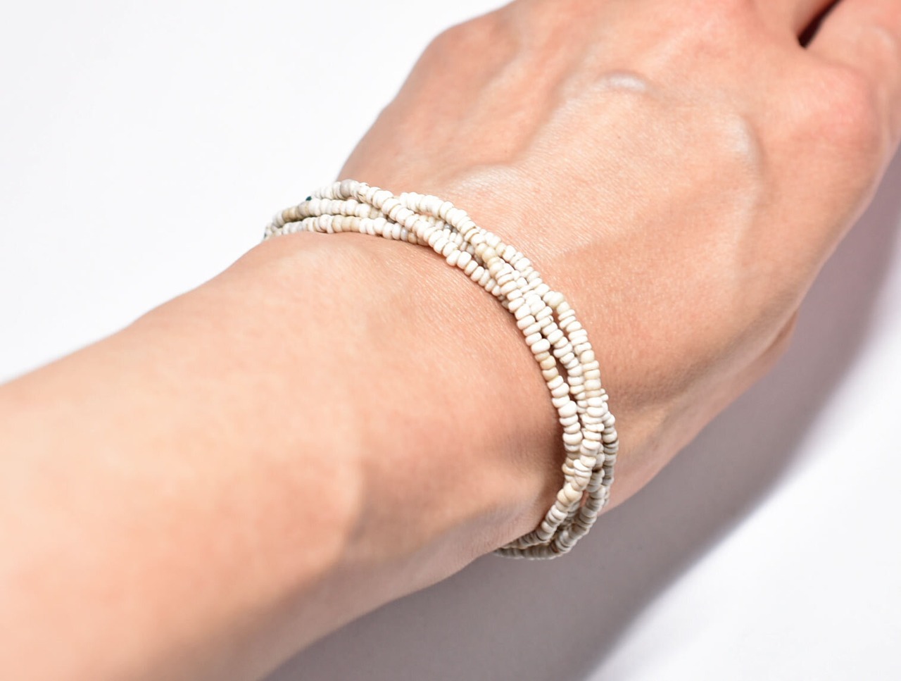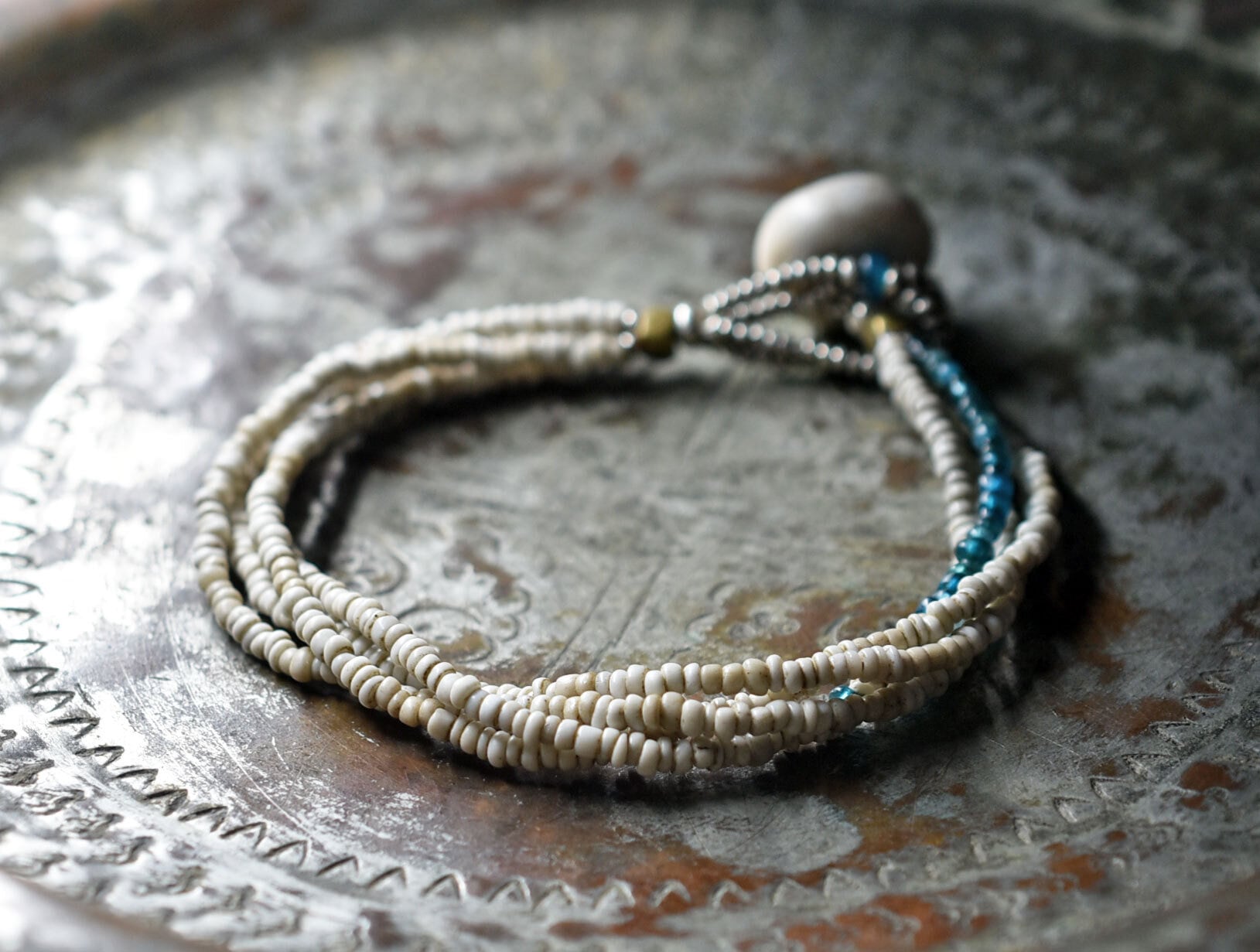 アンティークホワイトシードビーズとエメラルドブルーアンティークビーズを繋いだ4連ブレスです。