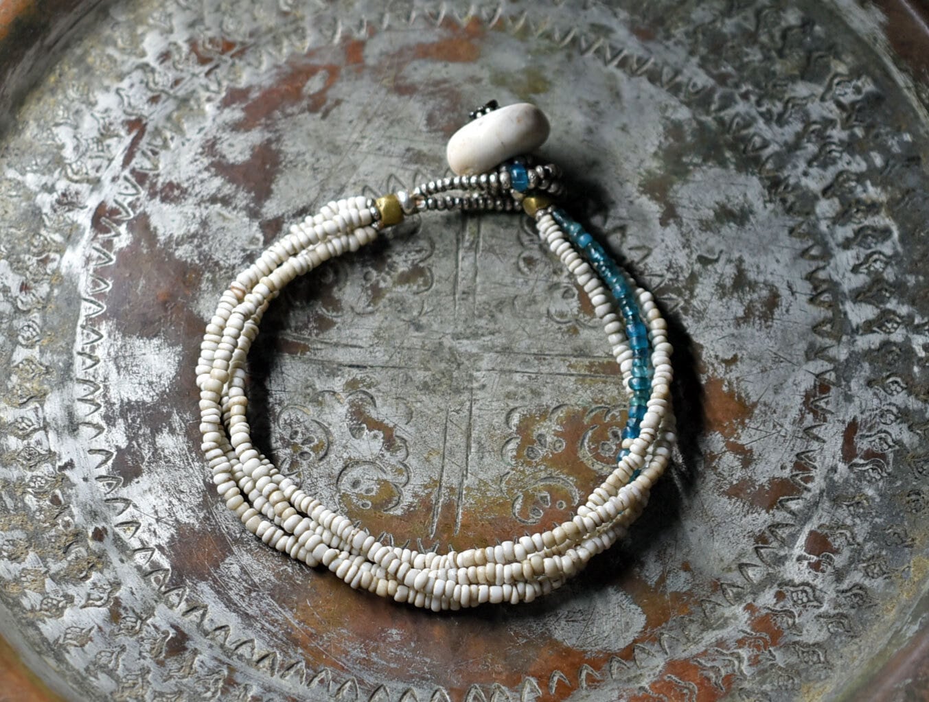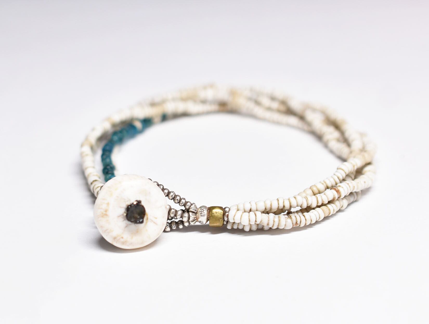 民族の古いネックレスの留め金に使われていた貝をこのブレスも留め金にしました。