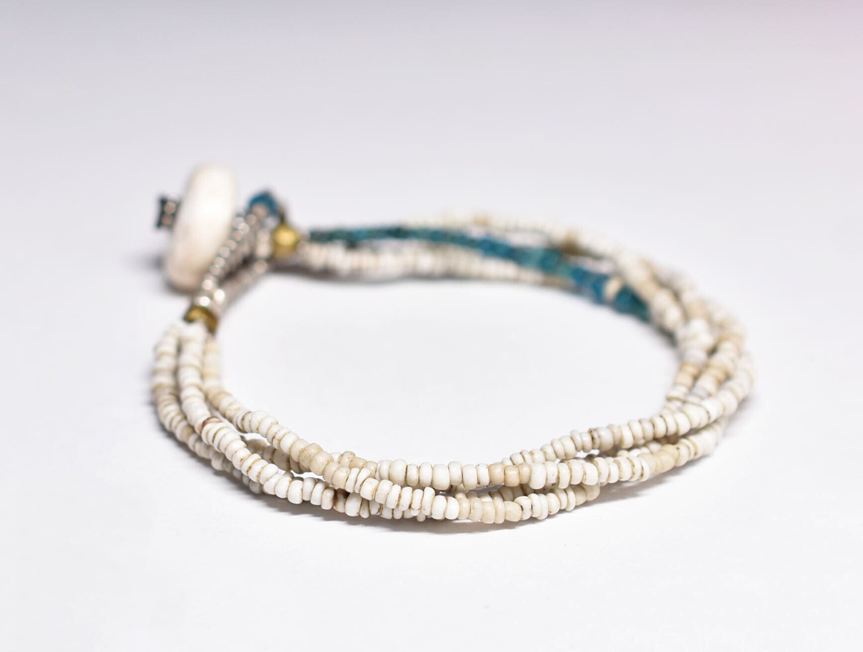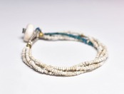 アンティークホワイトシードビーズとエメラルドブルーアンティークビーズの4連ブレス(貝留め金)