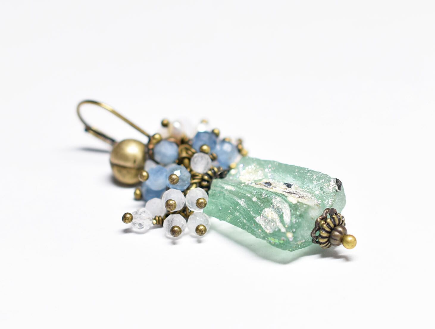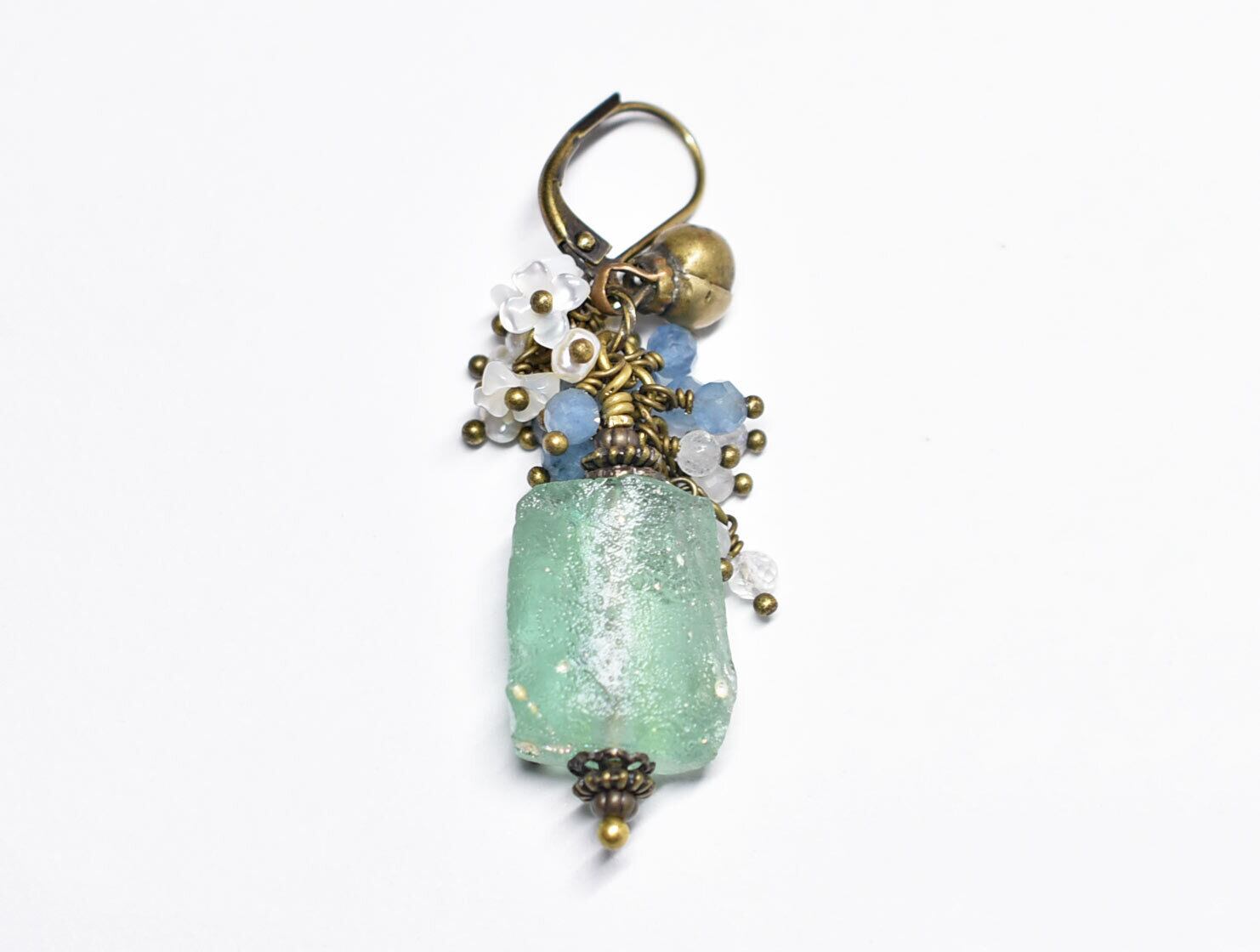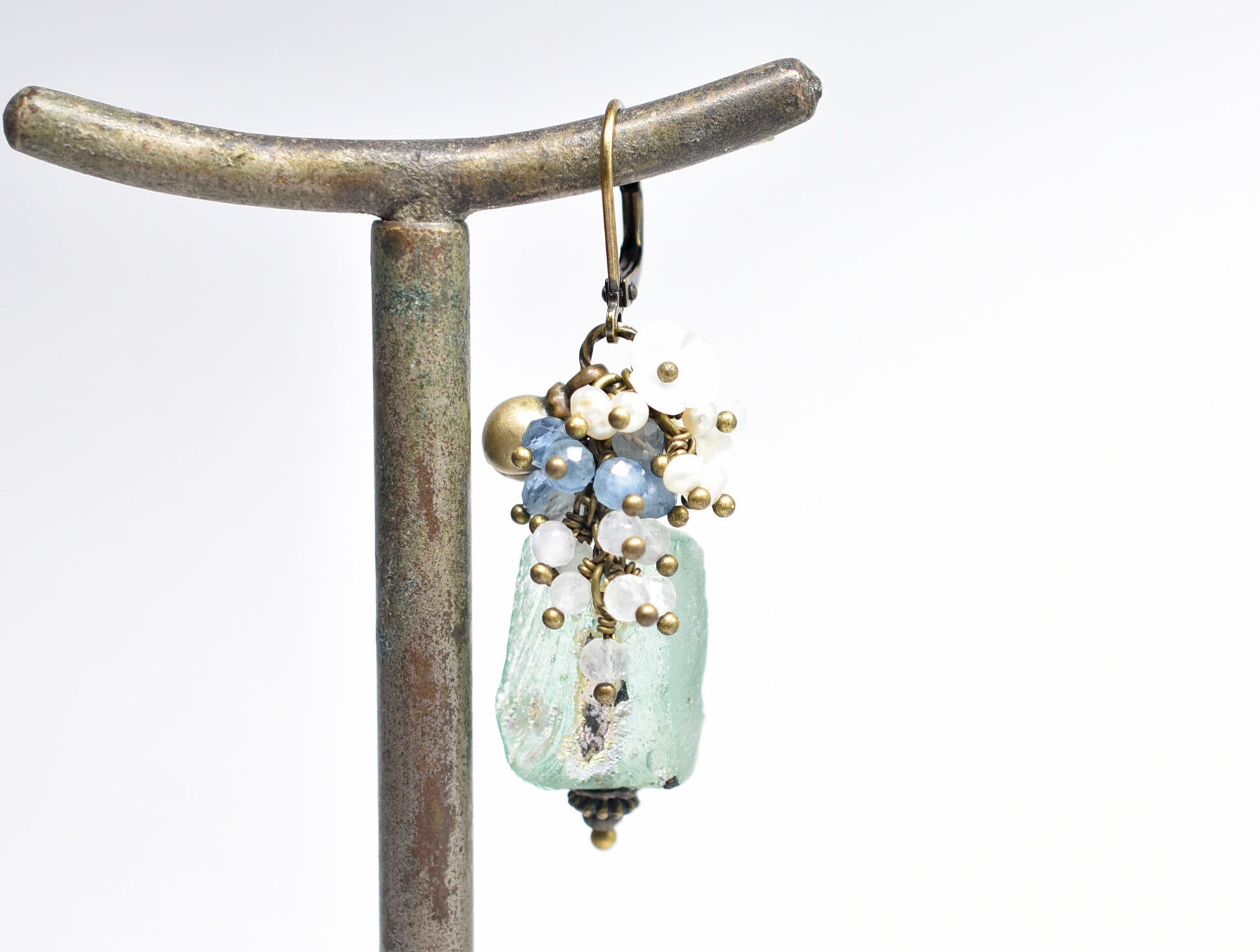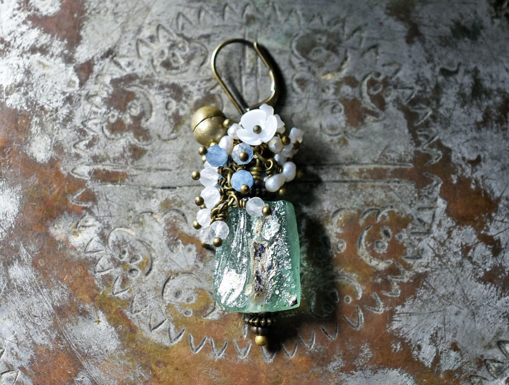 銀化ローマングラスとたわわなアクアマリン&ムーンストーン&淡水パール、白蝶貝の小花、民族を繋いだ片耳ピアスです。