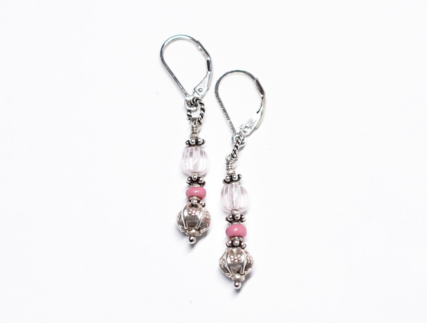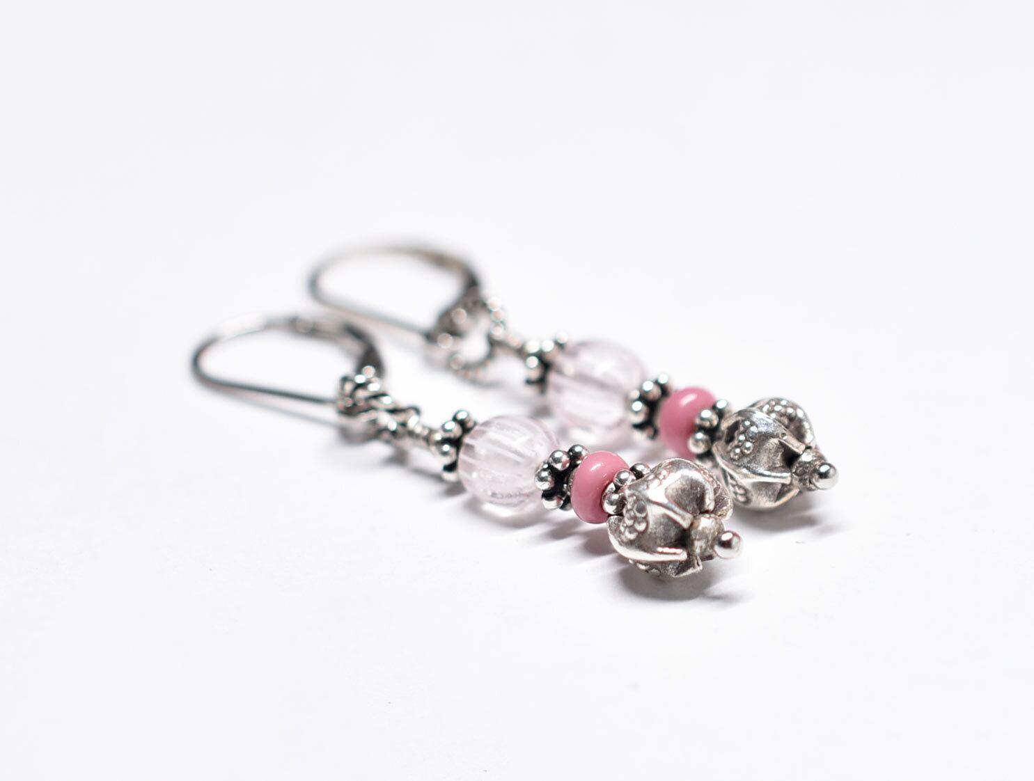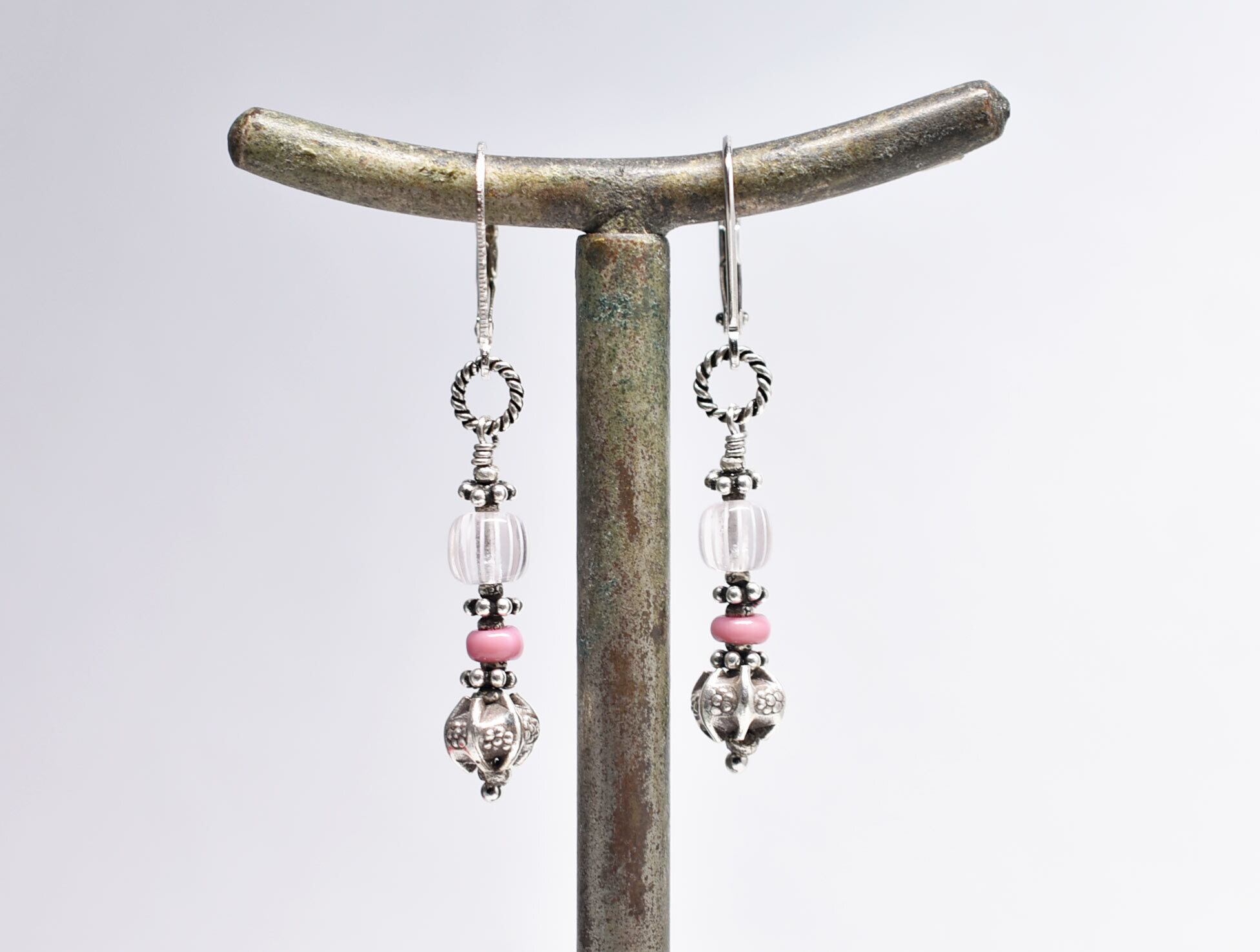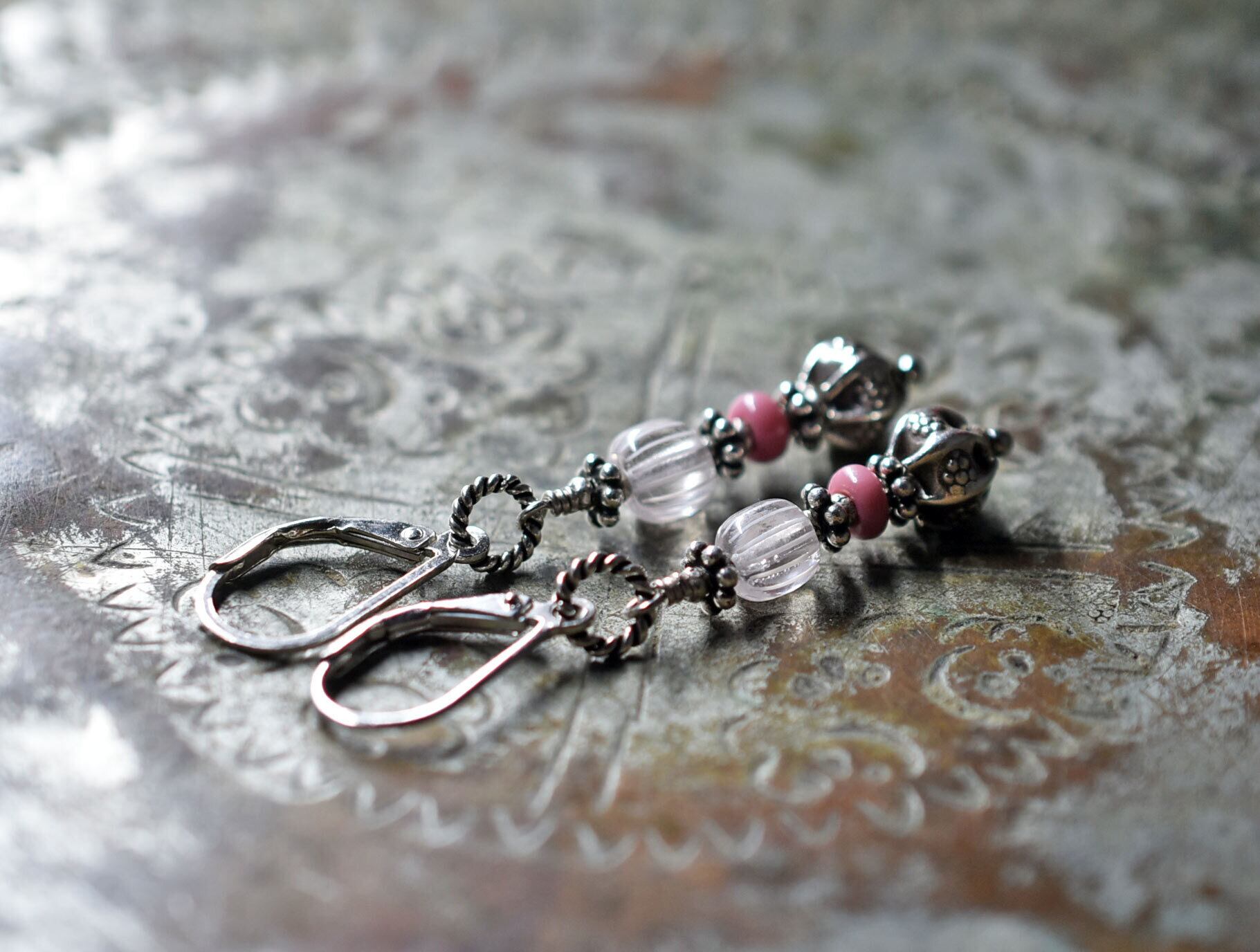アンティークグーズベリーとピンクマサイ、巾着カレンシルバーを繋いだピアスです。