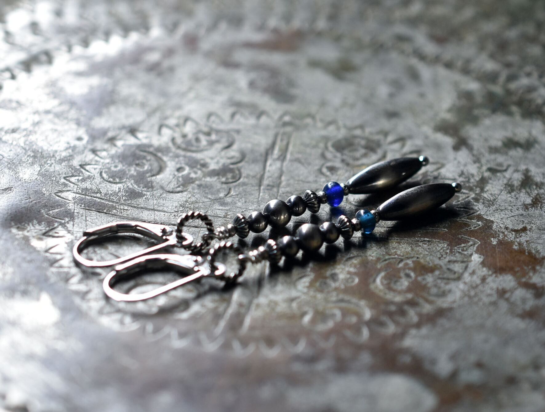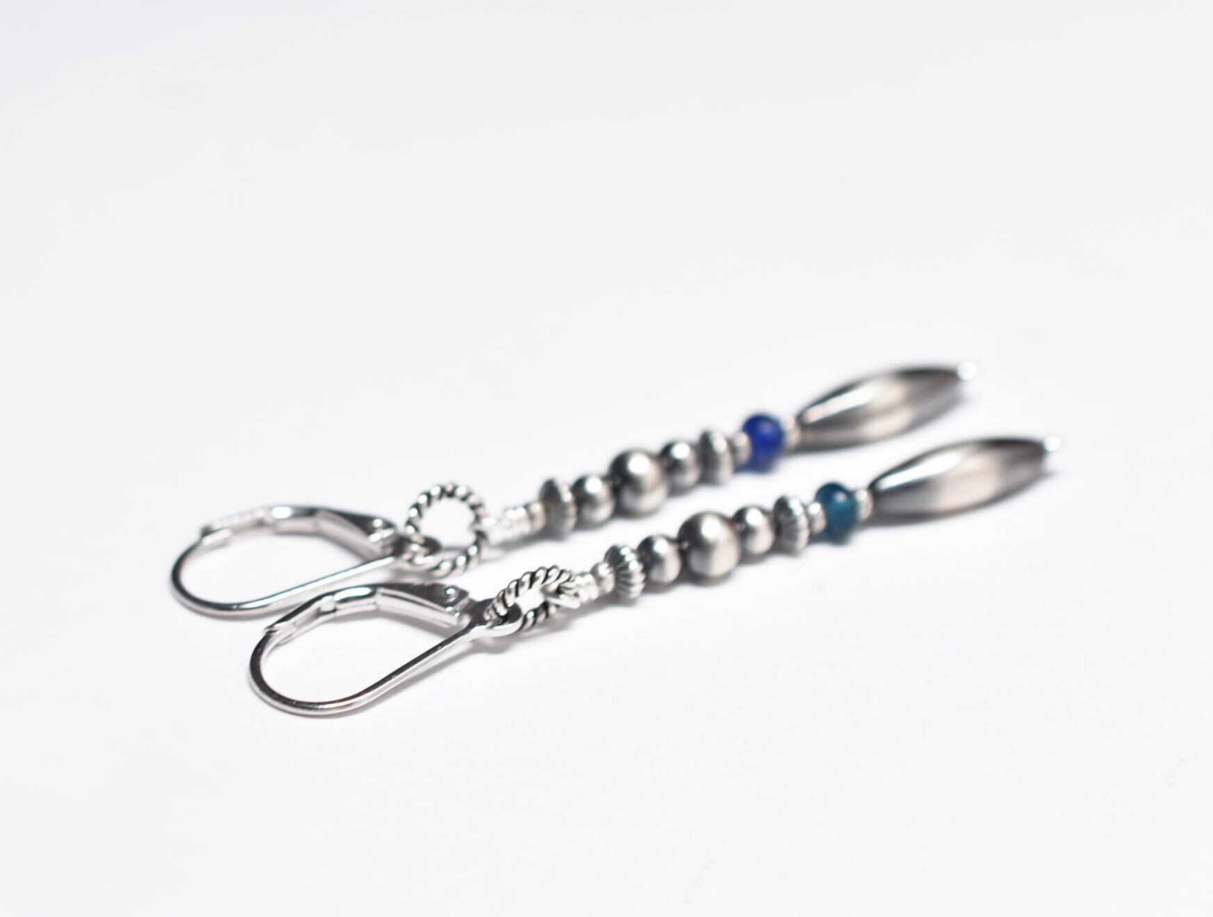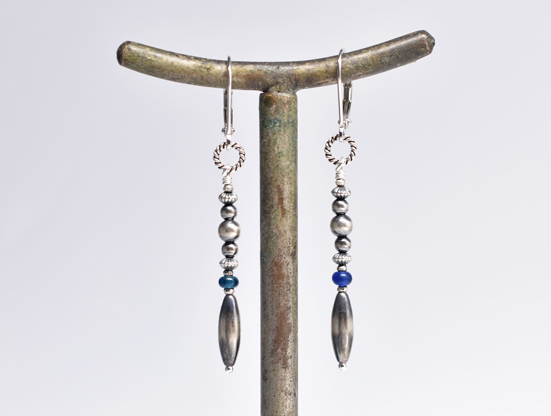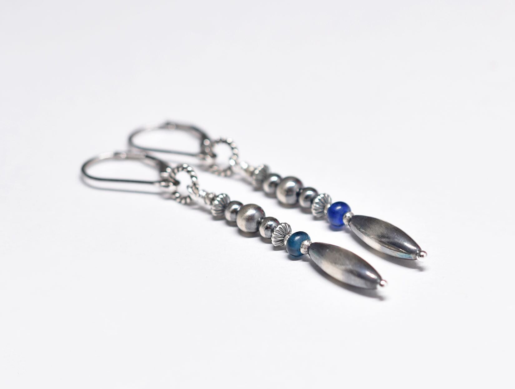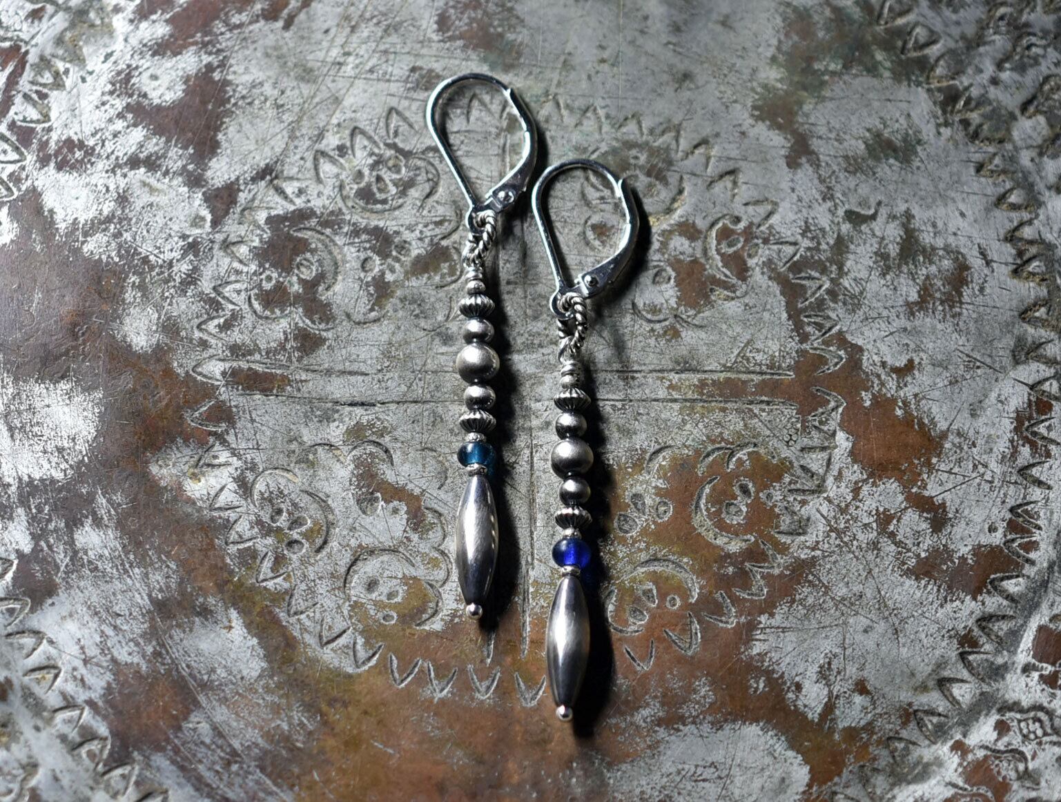 多彩ナバホパールとインディゴブルー&ブルービーズのスリムなピアス