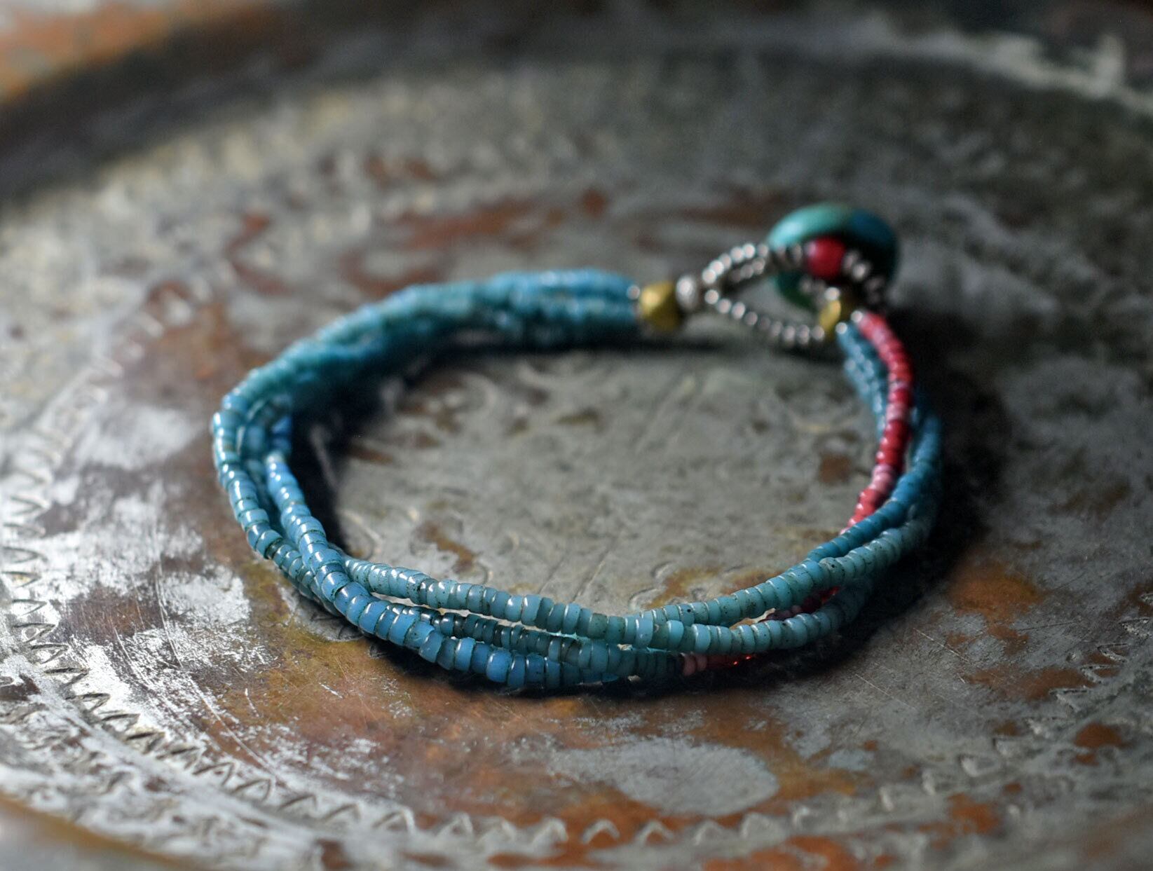 アンティークピーコックブルーシードビーズ、金赤ホワイトハーツ&ピンクマサイを繋いだ4連ブレスです。