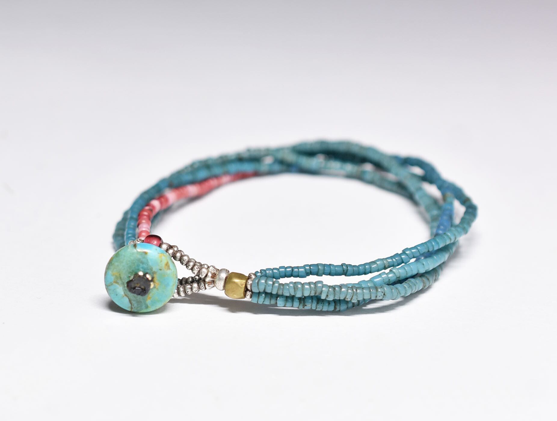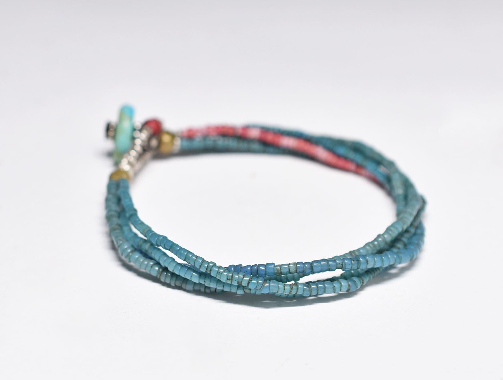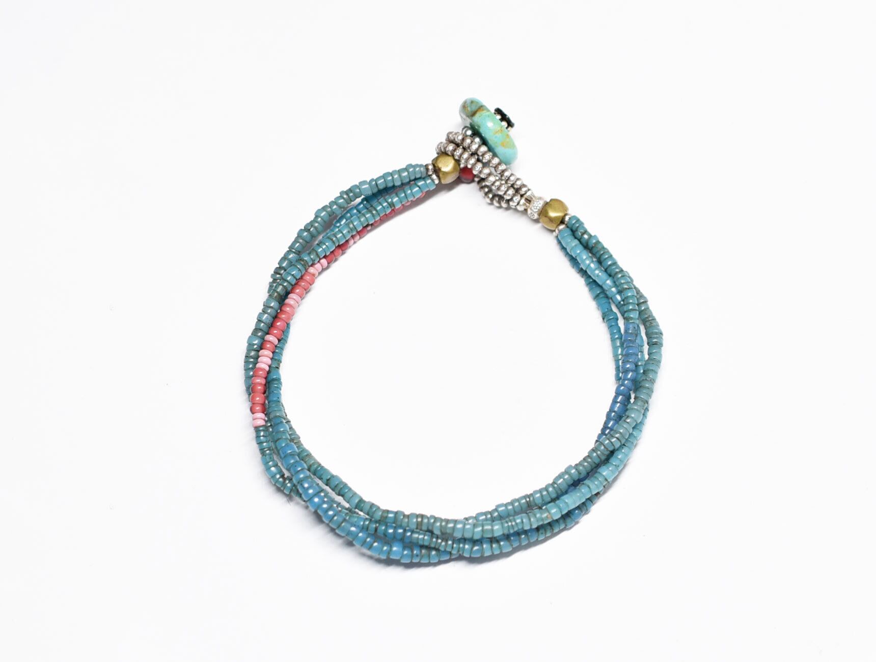 アンティークピーコックブルーシードビーズ、金赤ホワイトハーツ&ピンクマサイの4連ブレス(ターコイズ留め金)