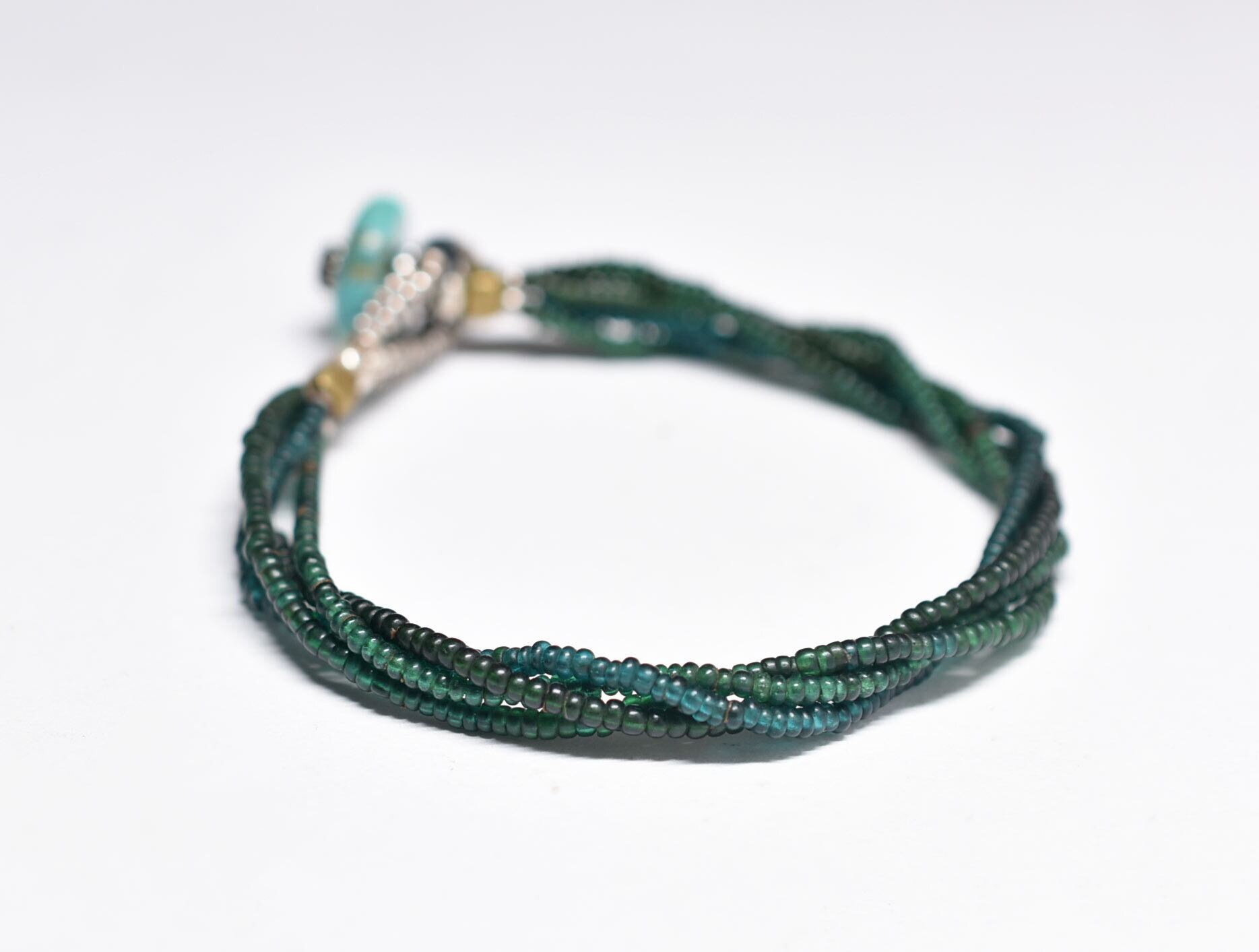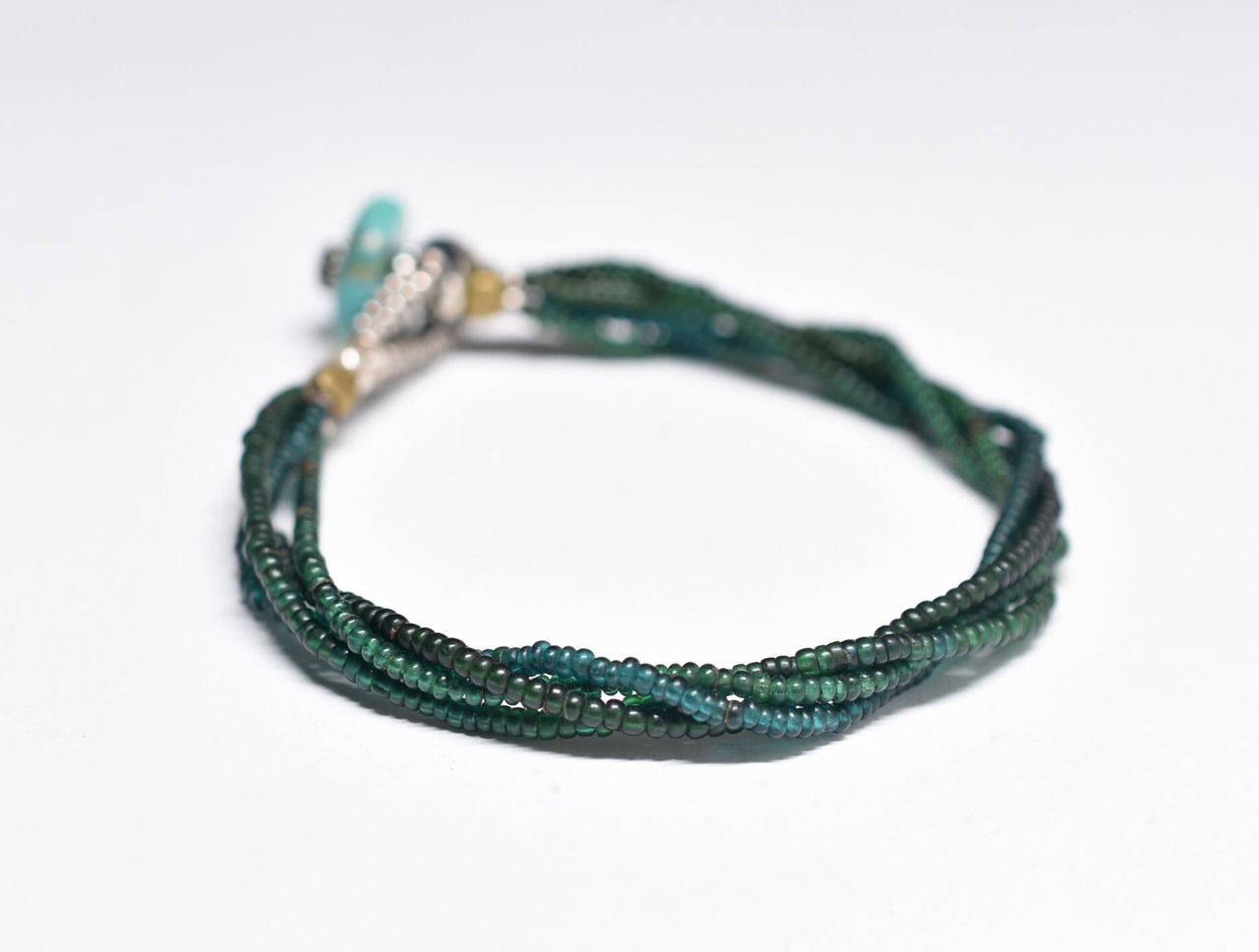 アンティーク多彩グリーンシードビーズの4連ブレス(ターコイズ留め金)