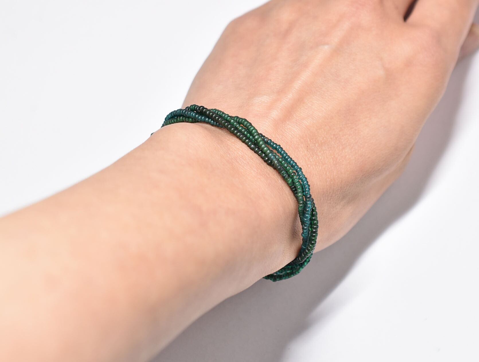 アンティーク多彩グリーンシードビーズを繋いだ4連ブレスです。