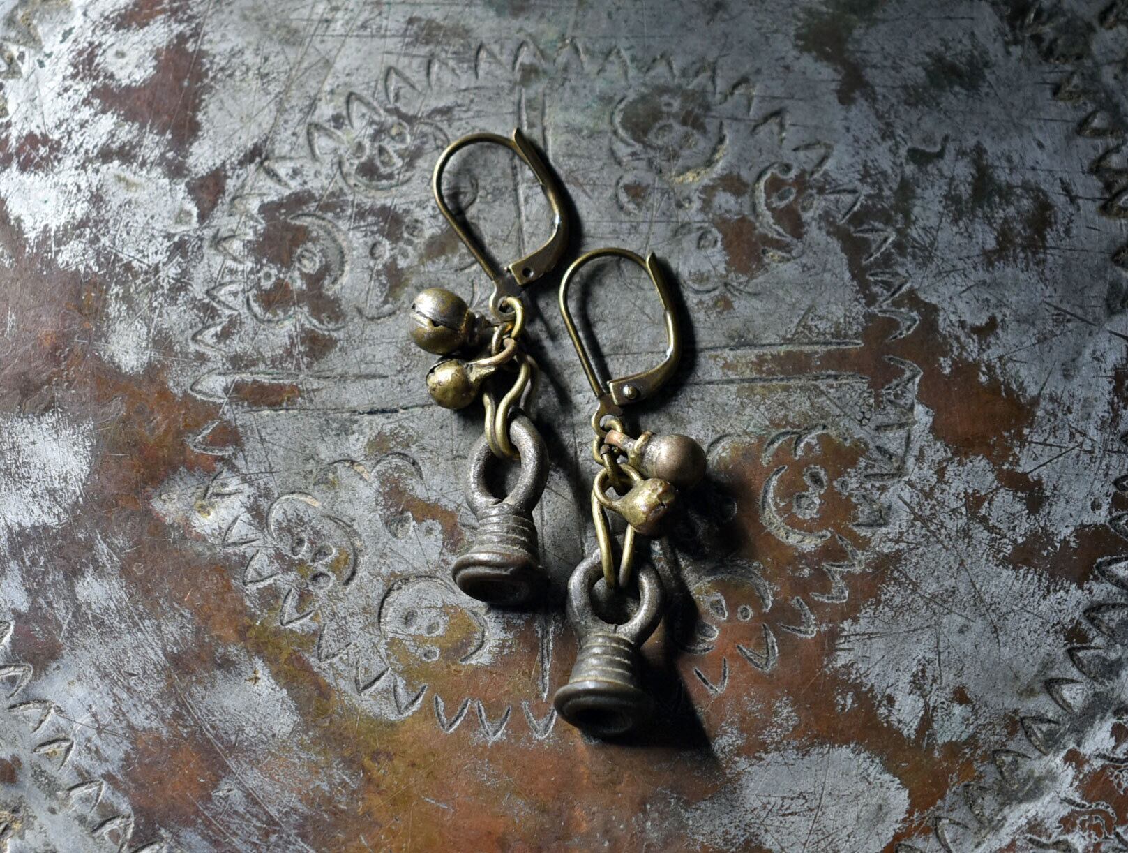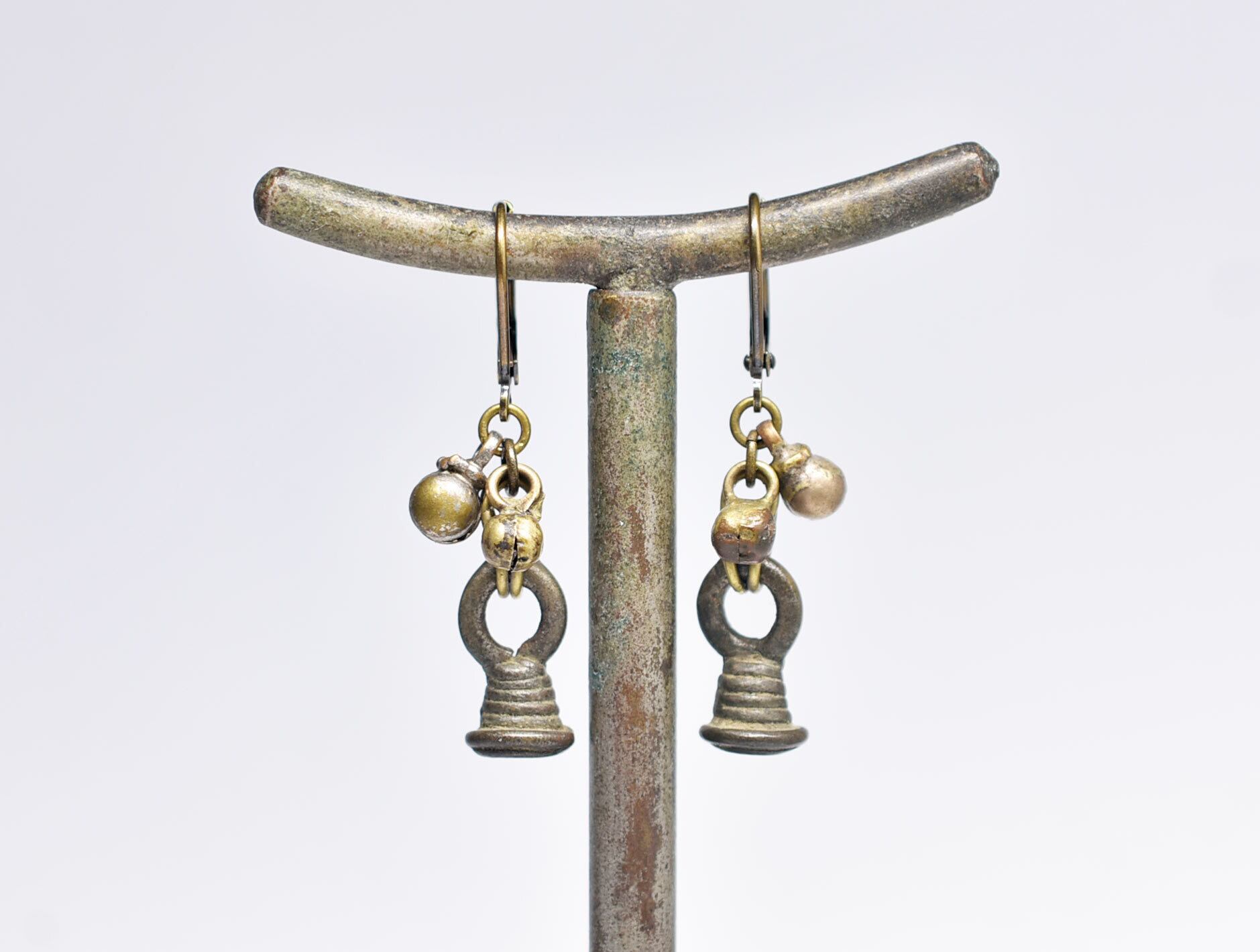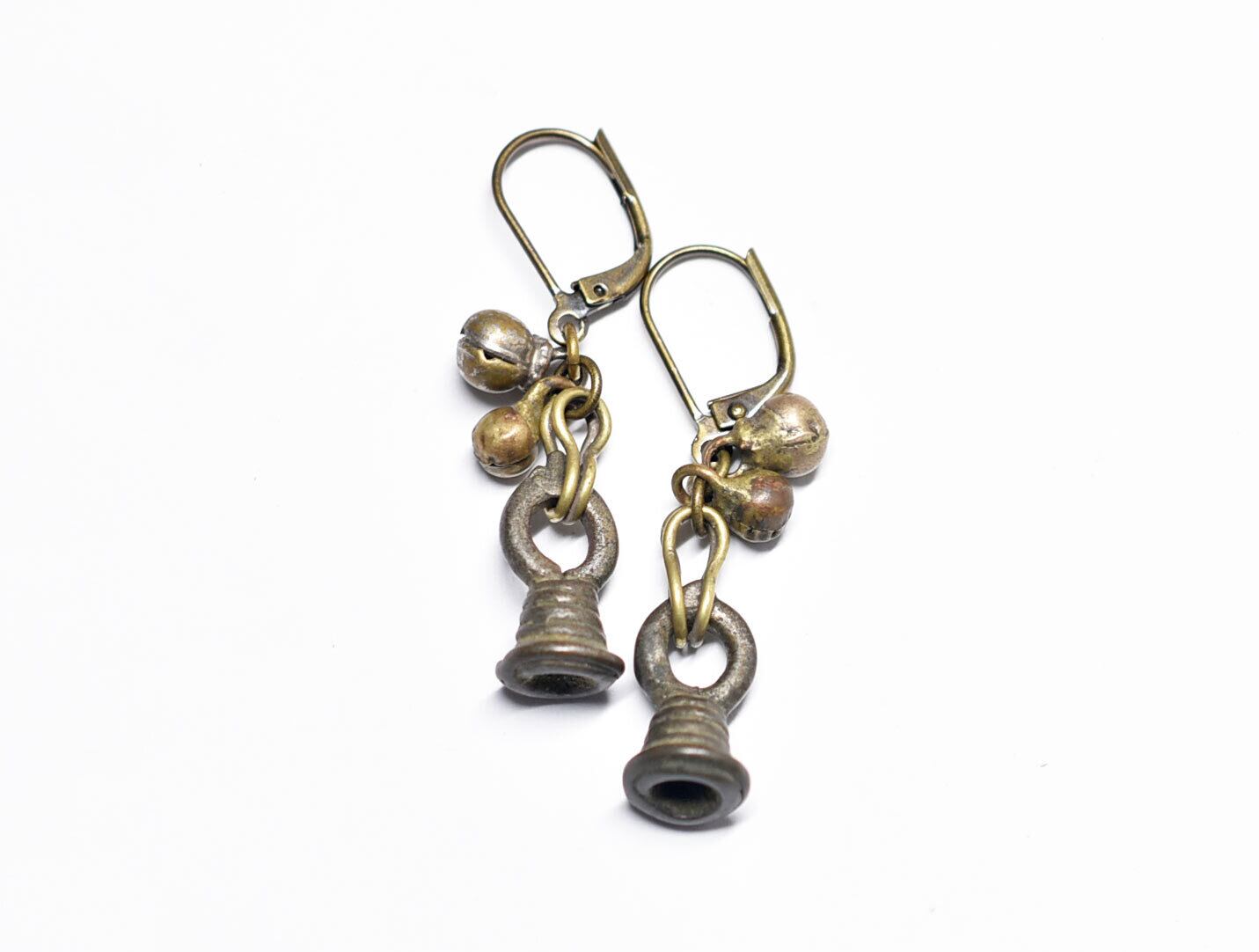 アンティークベル型アフリカンブラスと民族鈴のピアス