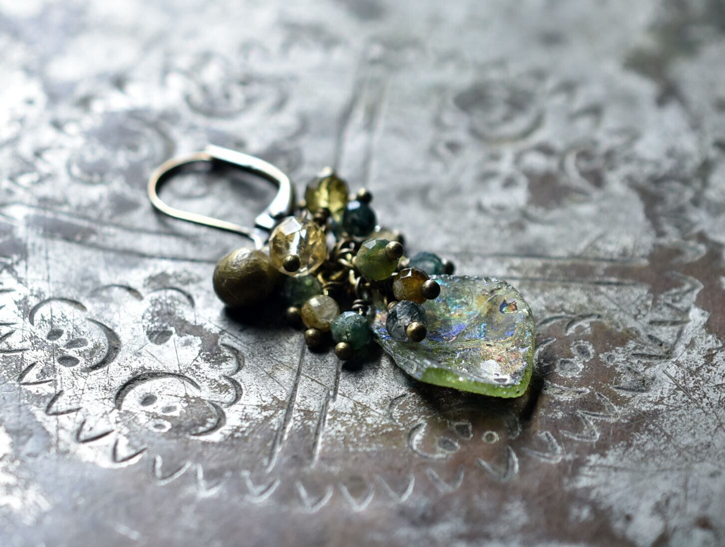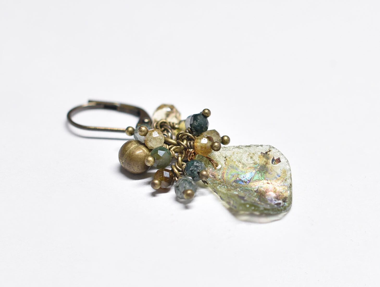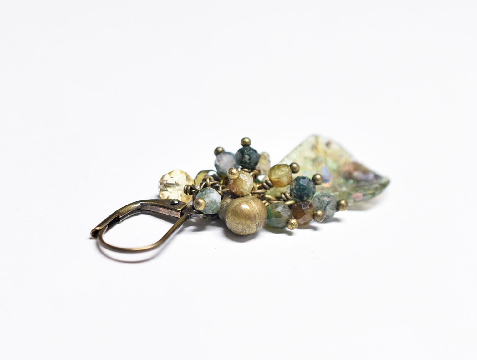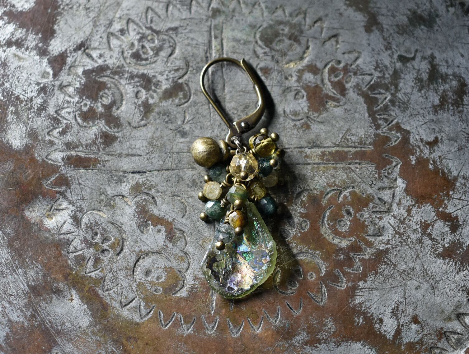アースカラー銀化のローマングラスとたわわなラブラドライト&モスアゲート、シトリン&トルマリン、民族鈴を繋いだ片耳ピアスです。