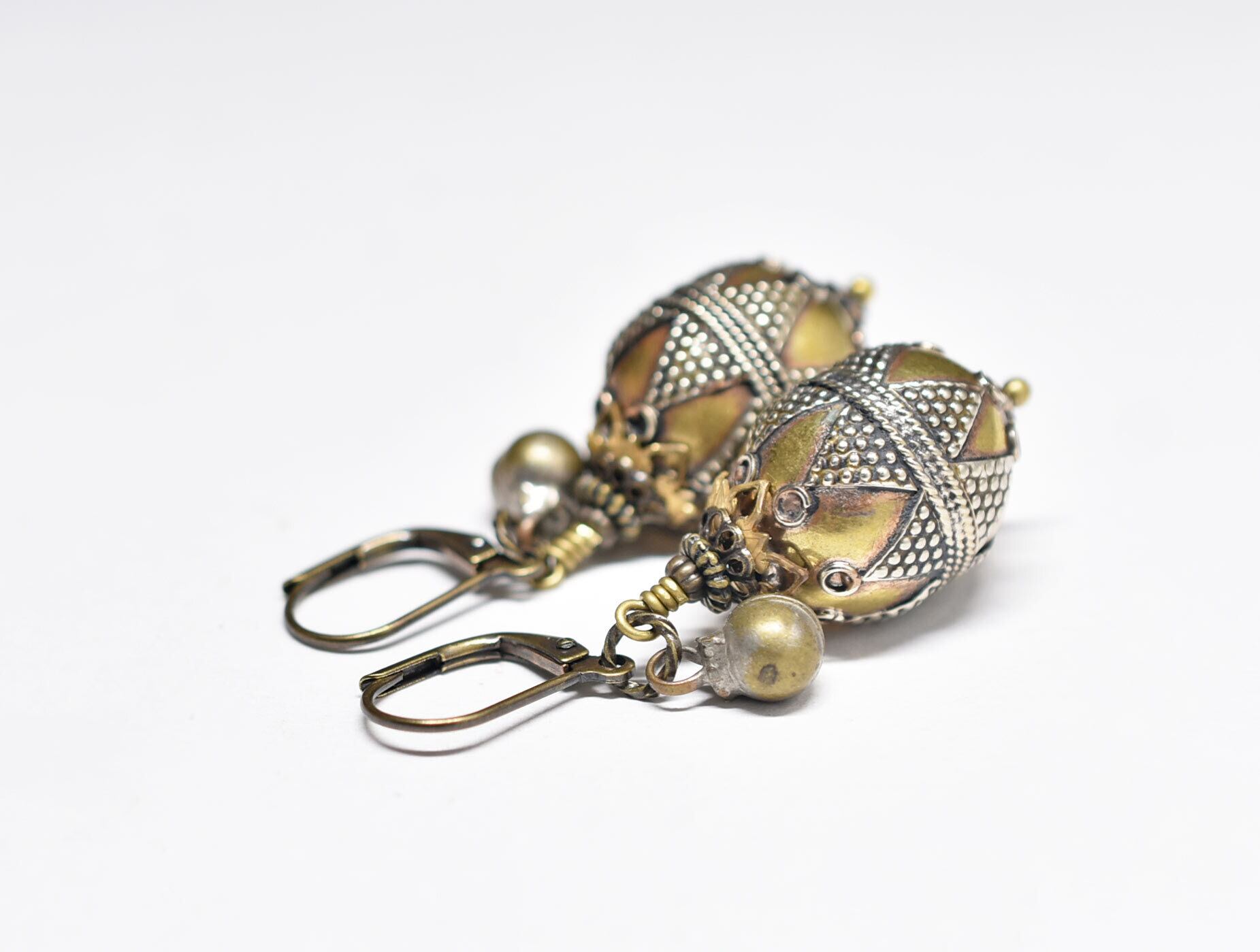 トルクメニスタン細工ビーズと民族鈴を繋いだ少しボリュームのあるピアスです。