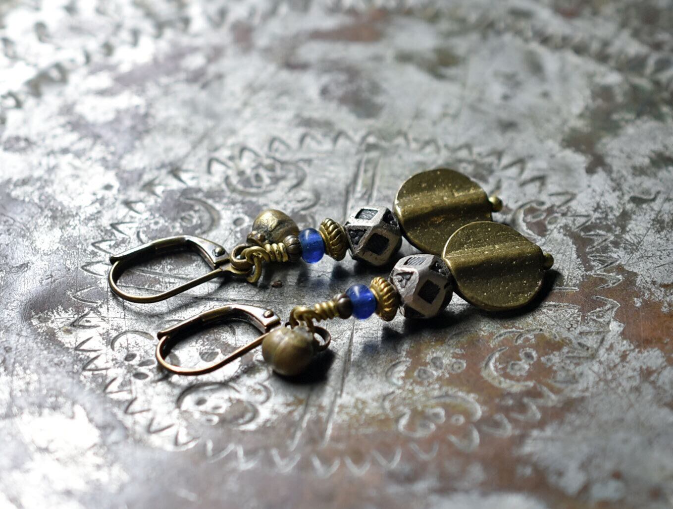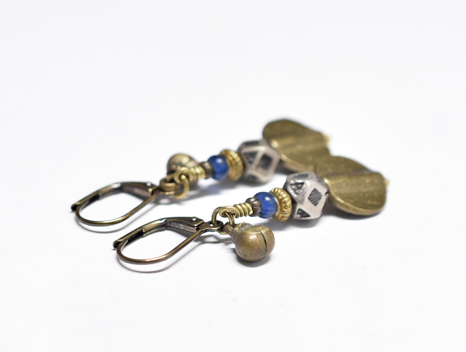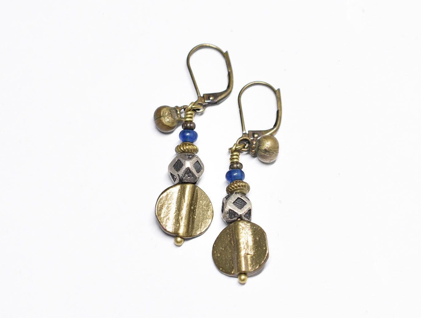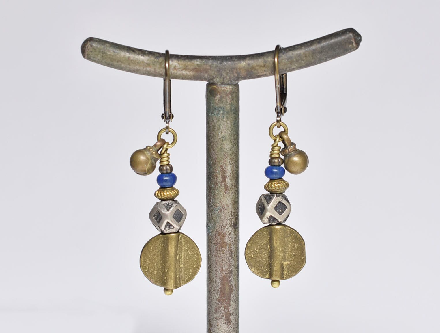 アフリカンブラスとトゥアレグビーズ、ブルービーズ、民族鈴のピアス