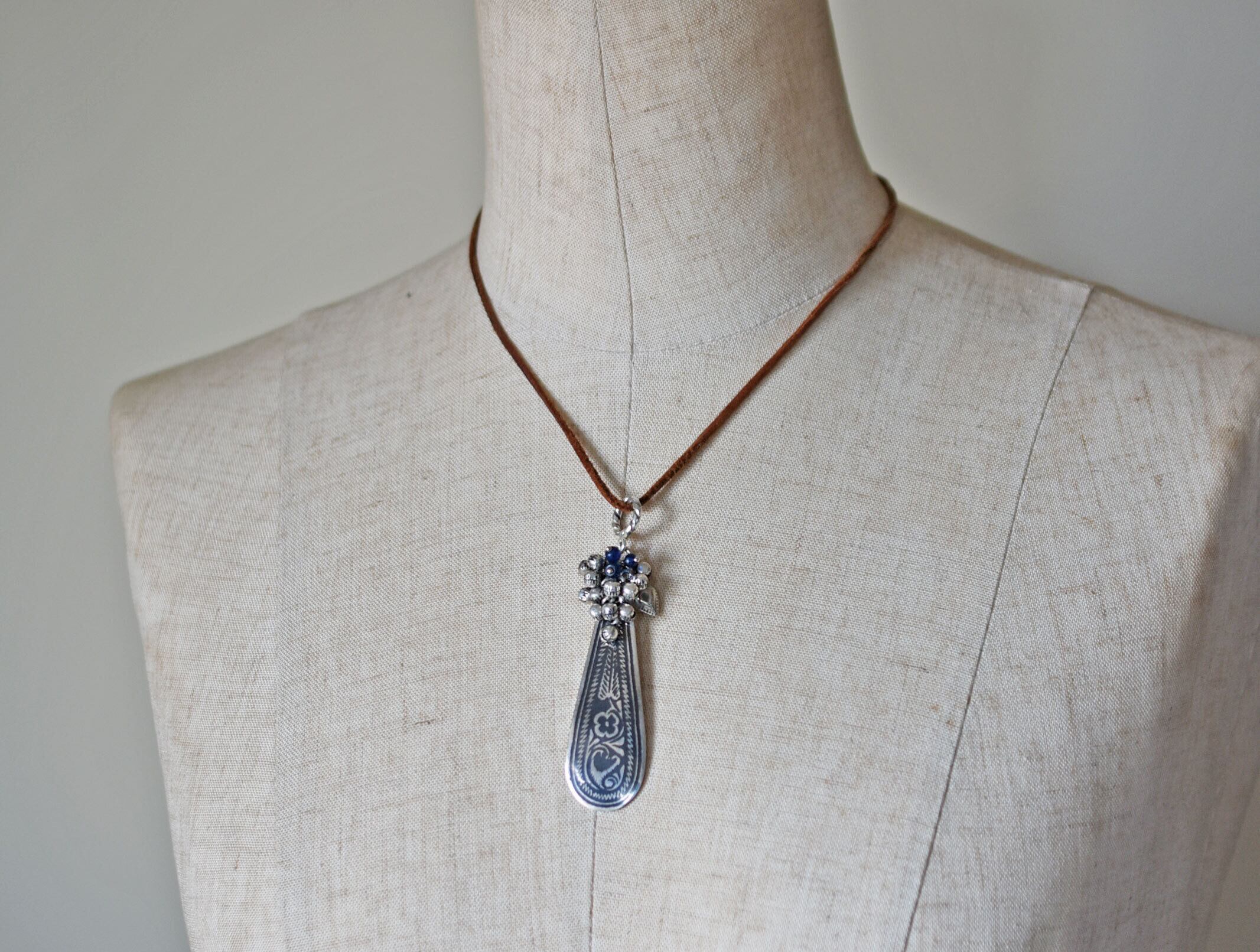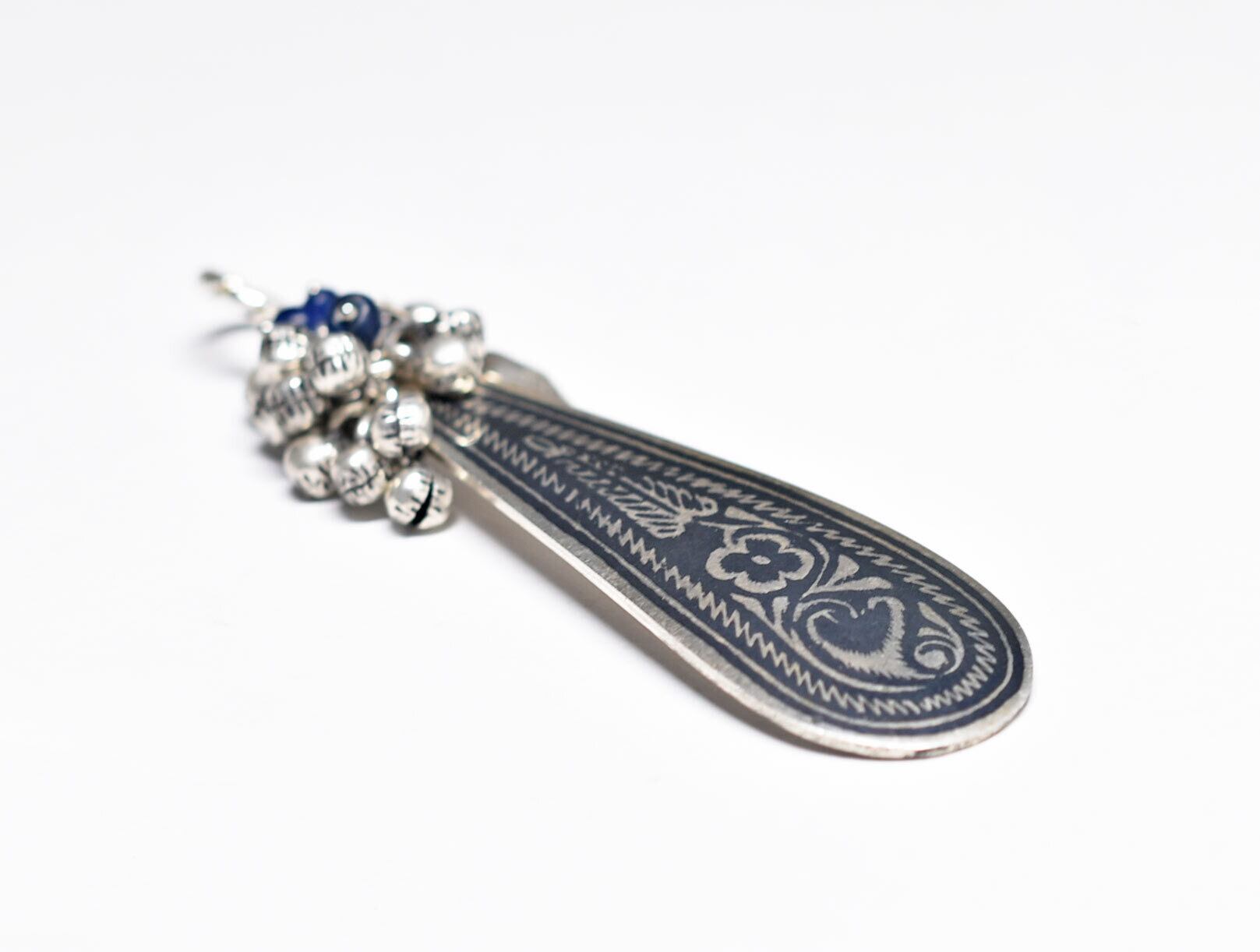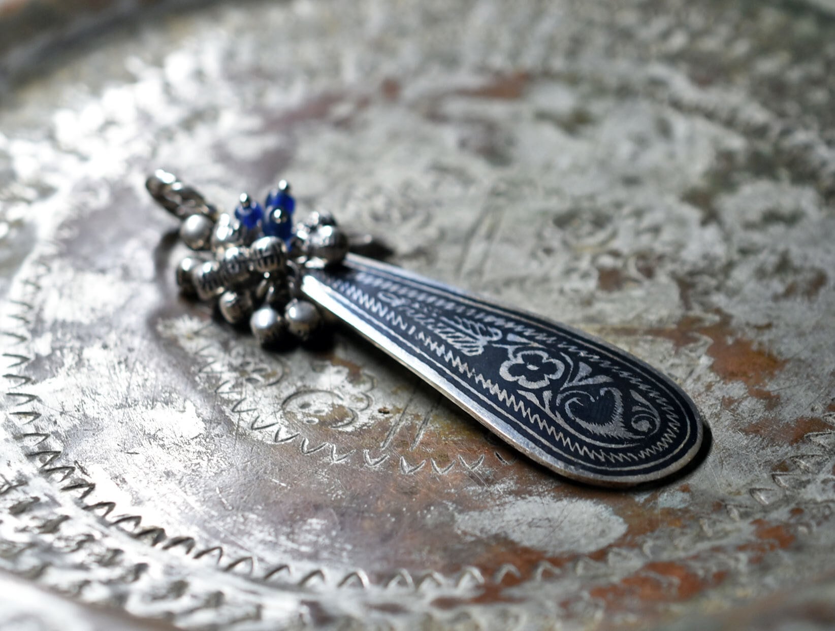 グルジアoldシルバーとたわわなインドシルバー鈴、oldアフガンシルバーパーツ、ブルーアンティークビーズを繋いだペンダントトップです。