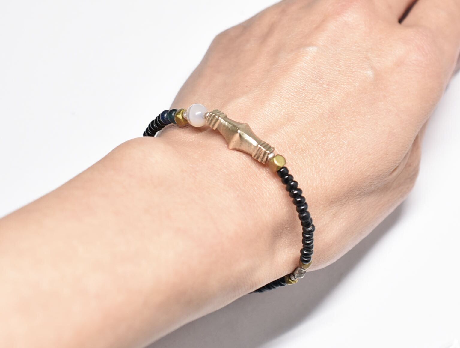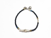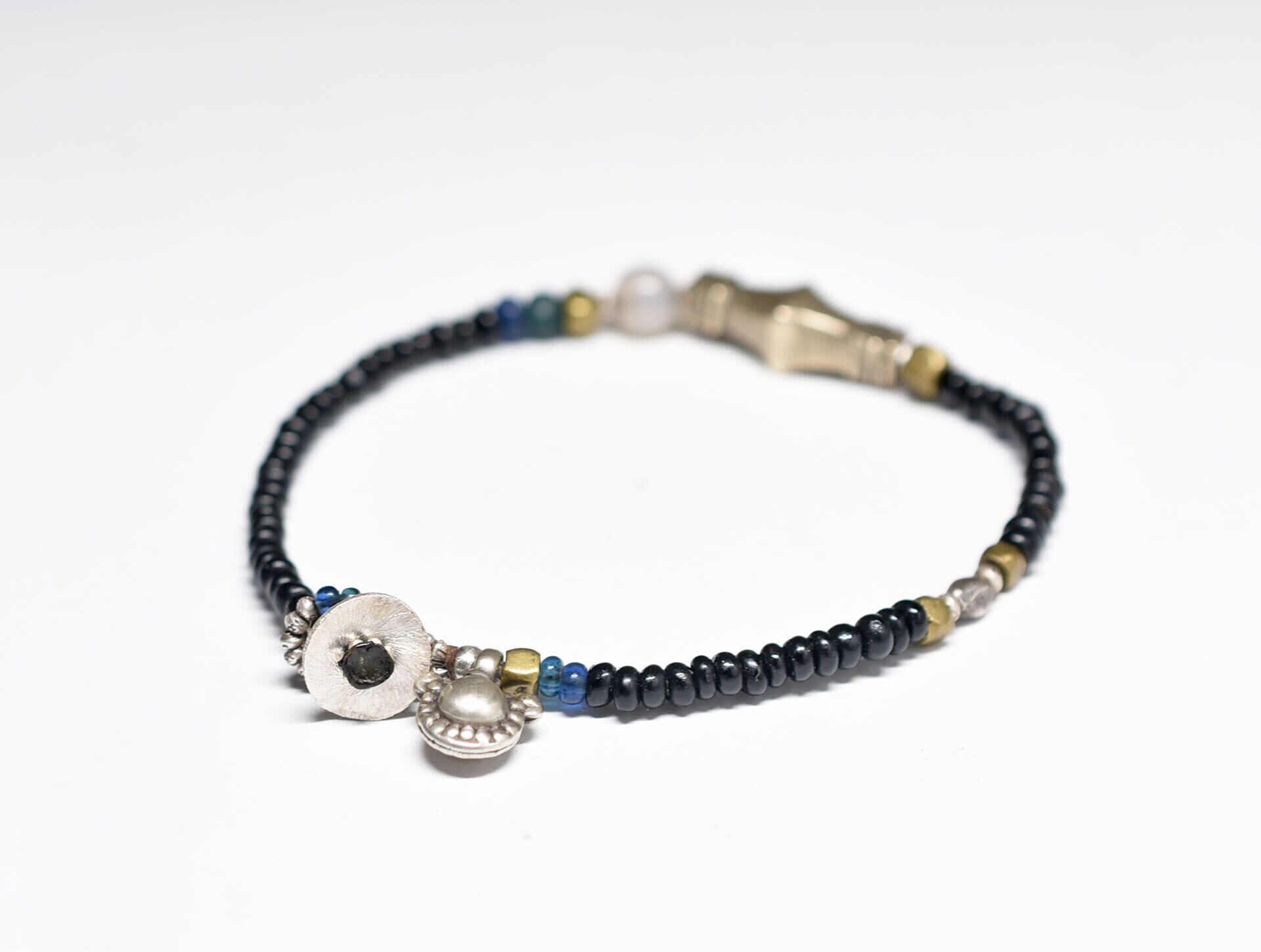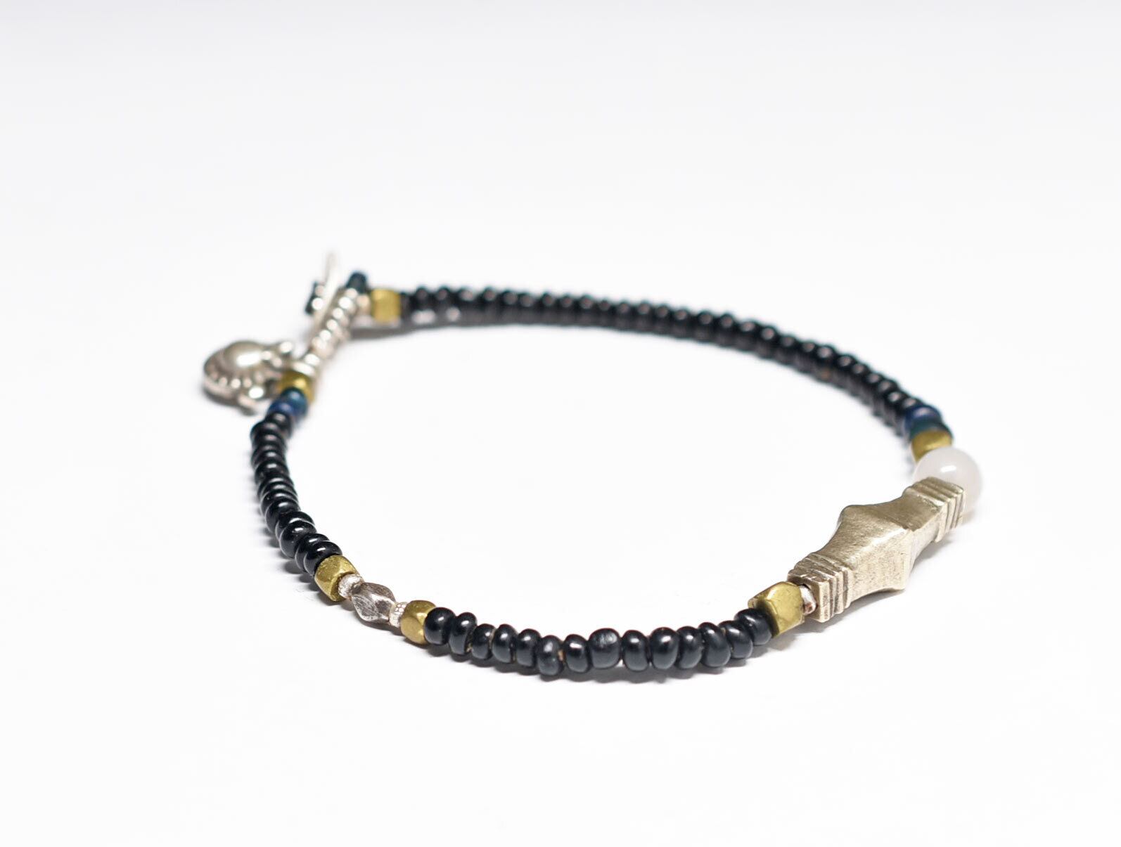 トゥアレグシルバーと古代瑪瑙、oldチンシルバー&oldオリッサブラス、漆黒&インディゴブルー&ブルービーズを繋いだブレスです。