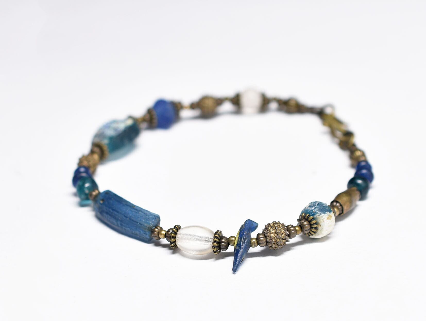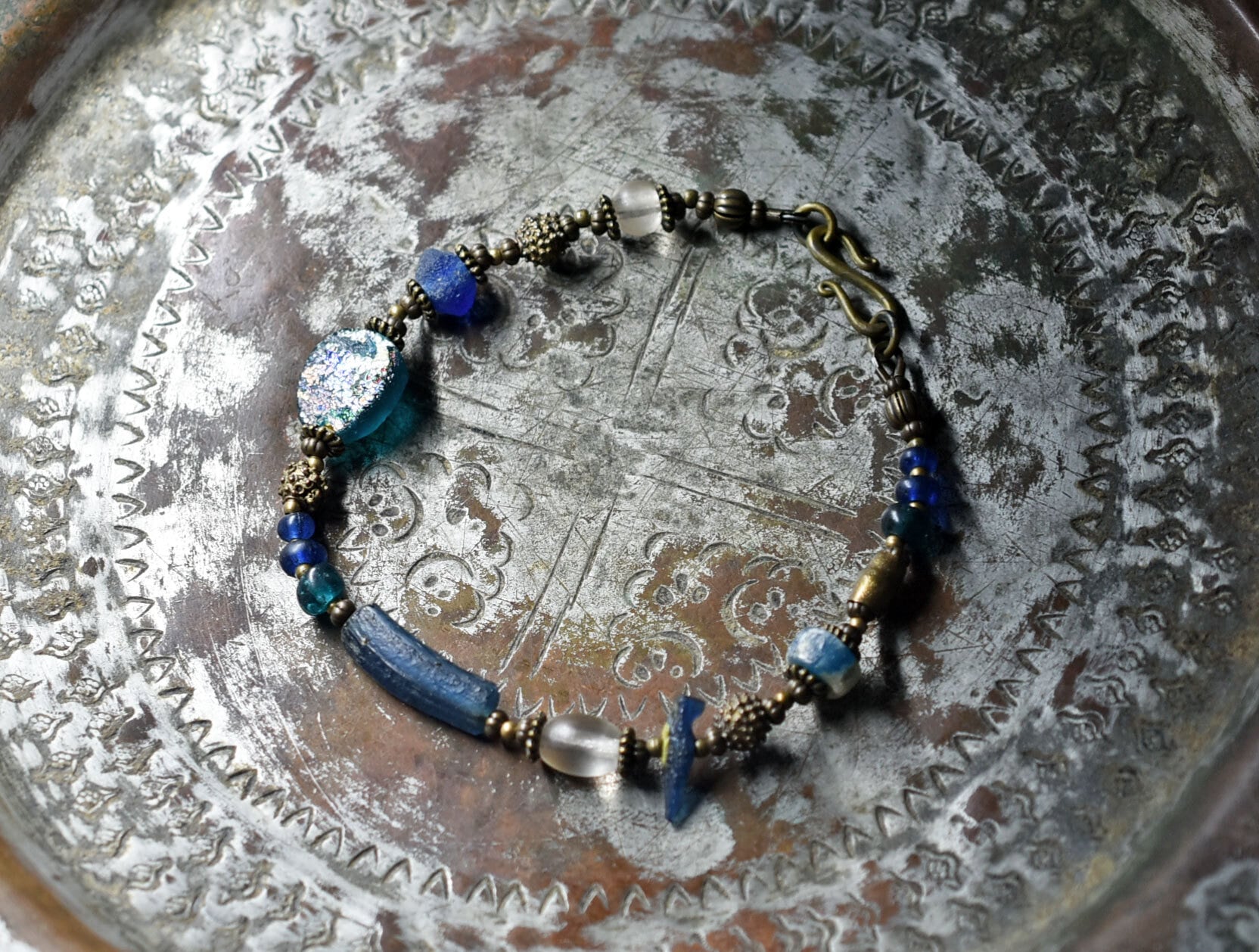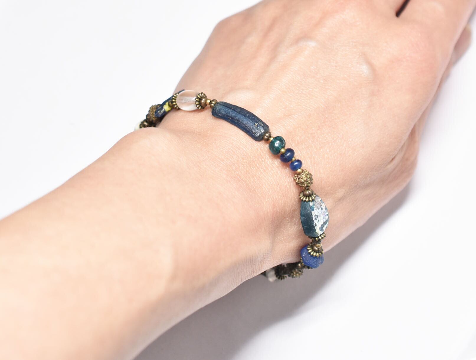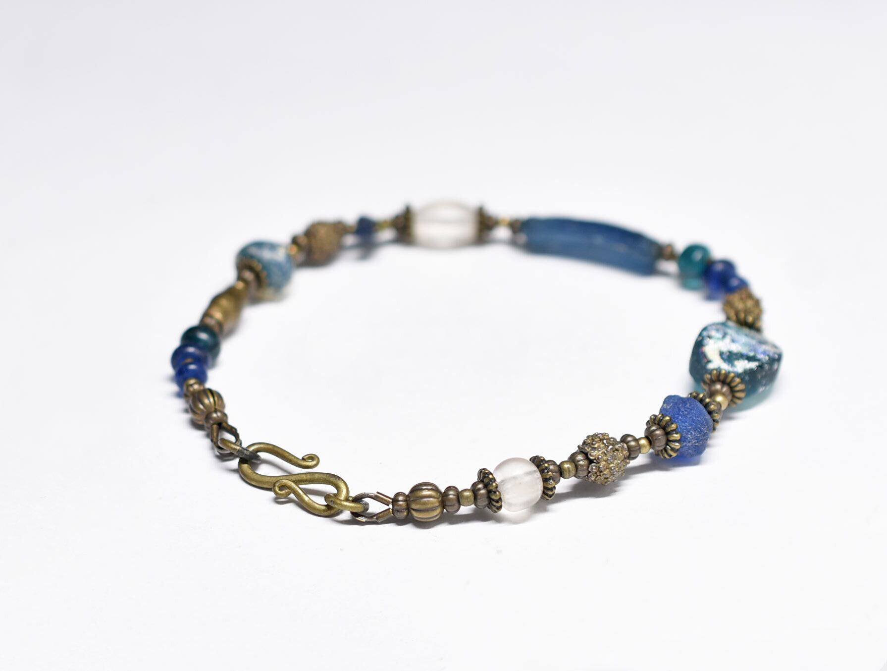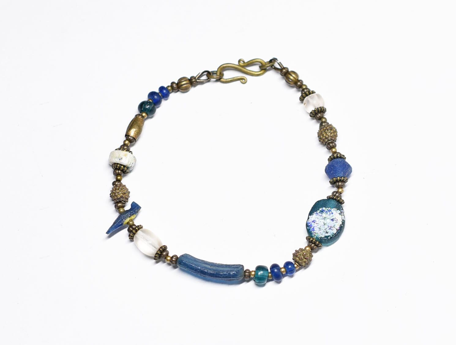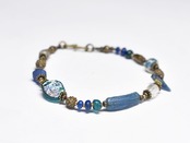 ブルー系ローマングラスとアンティークボヘミアビーズ、発掘&銀化ビーズ、民族族ブラスのブレス