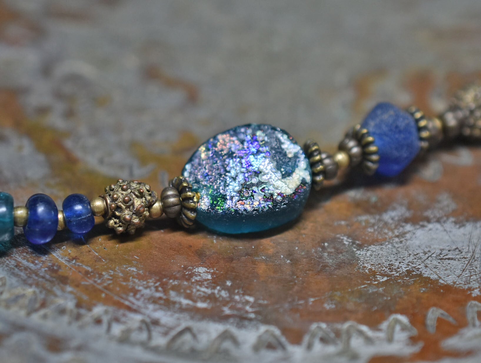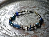 ブルー系ローマングラスとアンティークボヘミアビーズ、発掘&銀化ビーズ、民族族ブラスなどを繋いだブレスです。