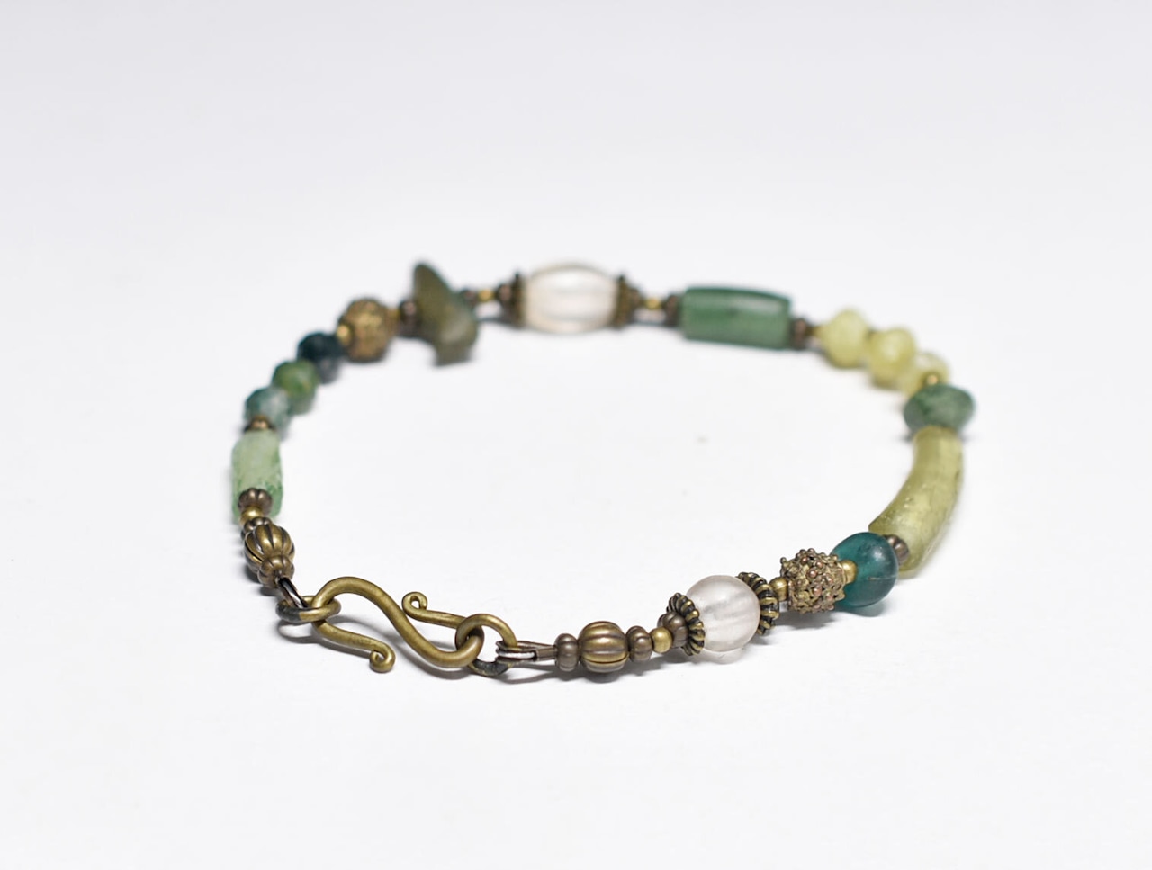 アースカラー多彩ローマングラスとアンティークボヘミアビーズ、つぶつぶブラス、ジェイド、モスアゲートのブレス