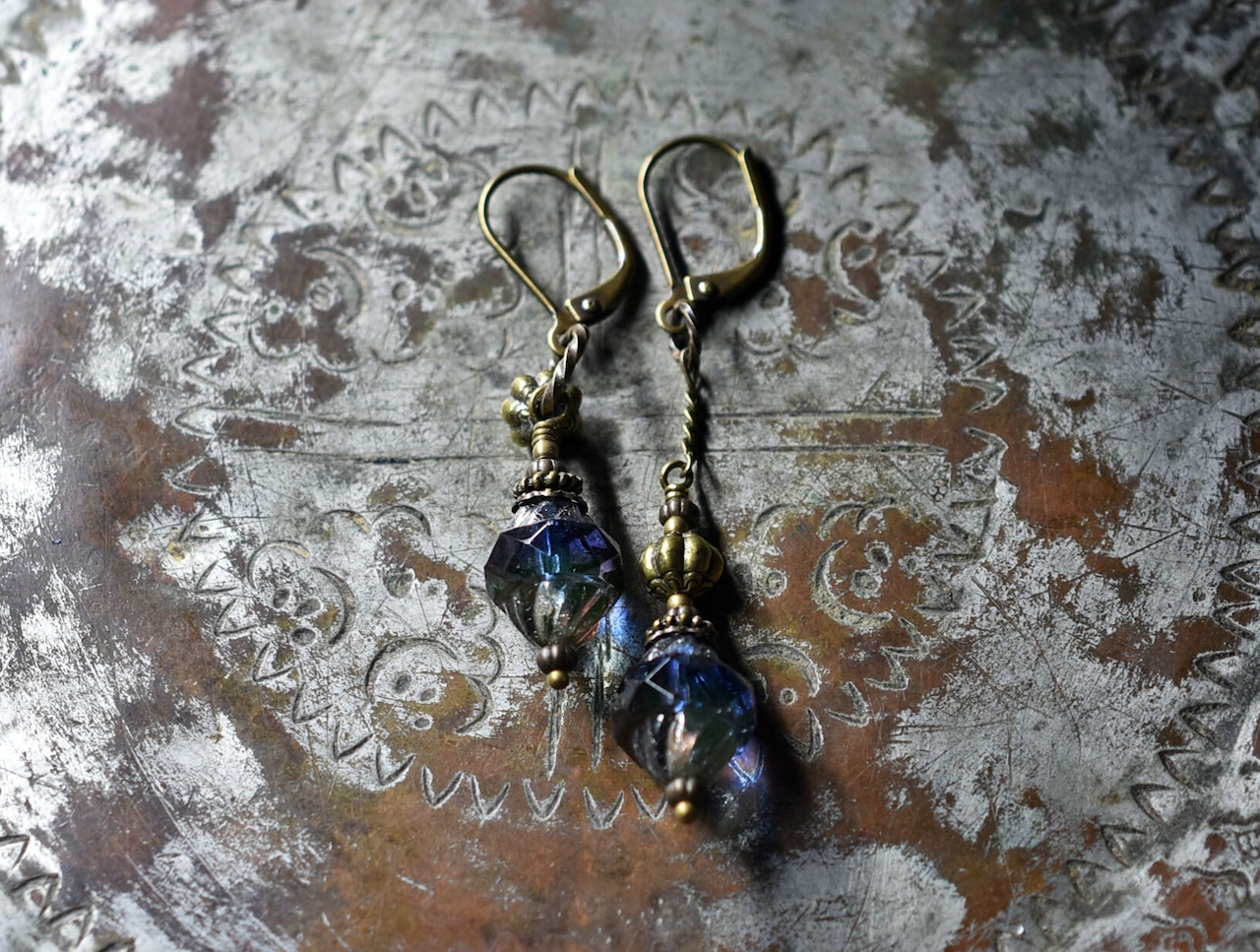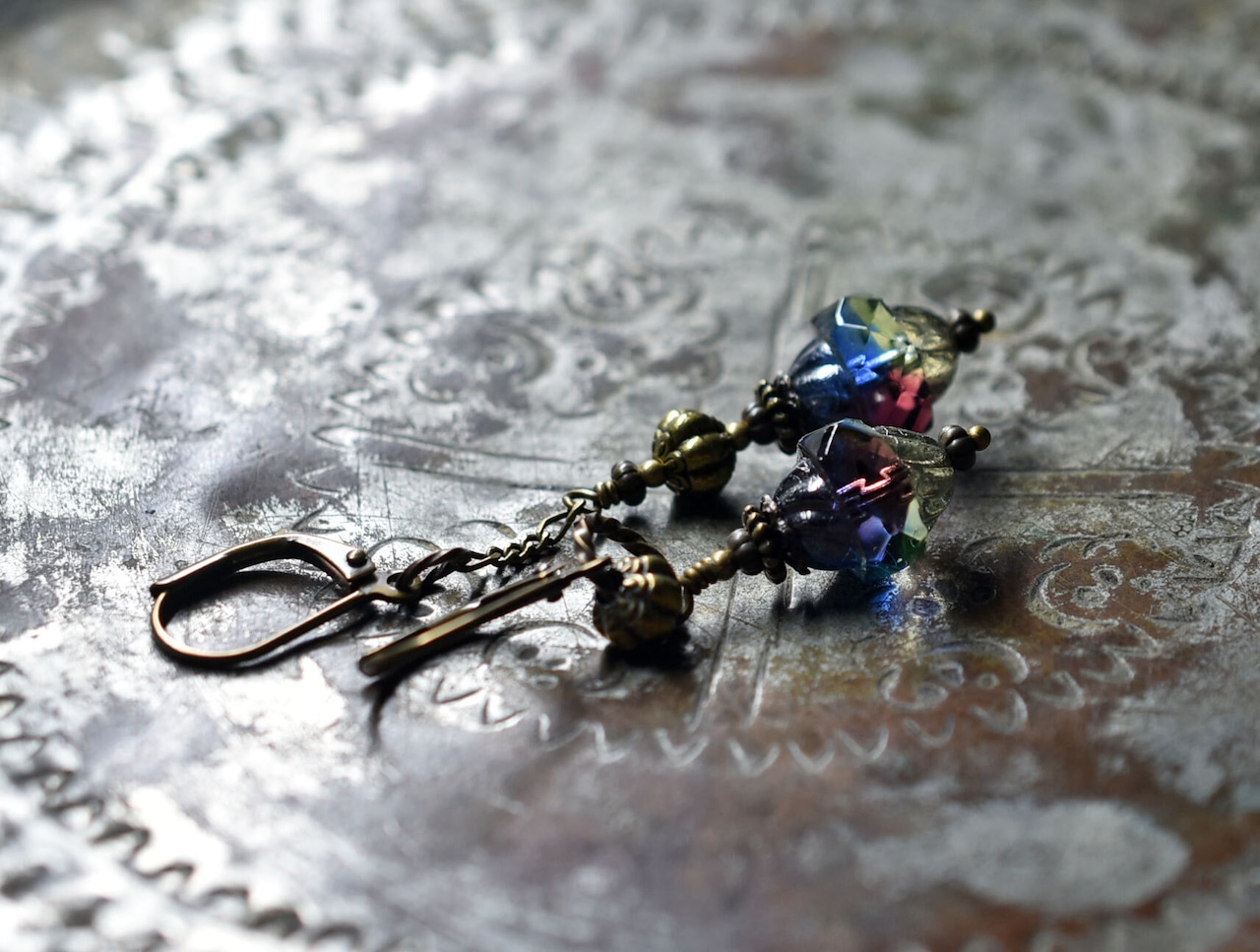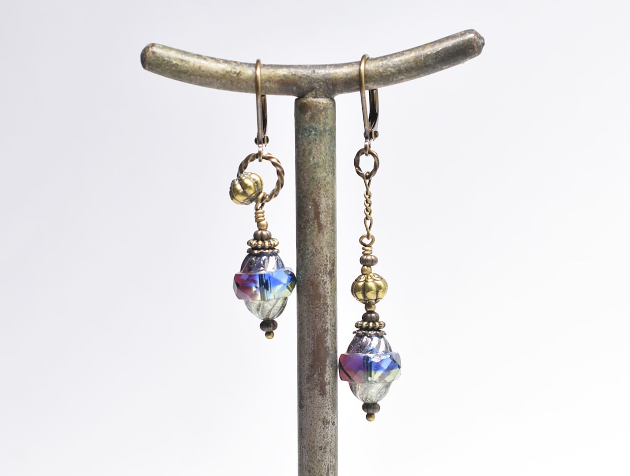 マジックアワーチェコビーズと手毬ブラスのリング&チェーンを繋いだアンシメトリーなピアスです。