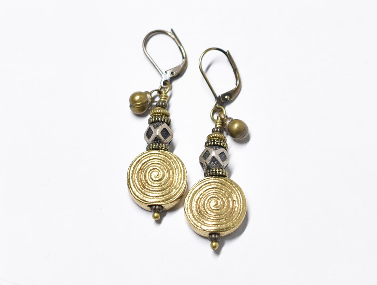 渦巻きアフリカンブラスとトゥアレグビーズ、民族鈴のピアス