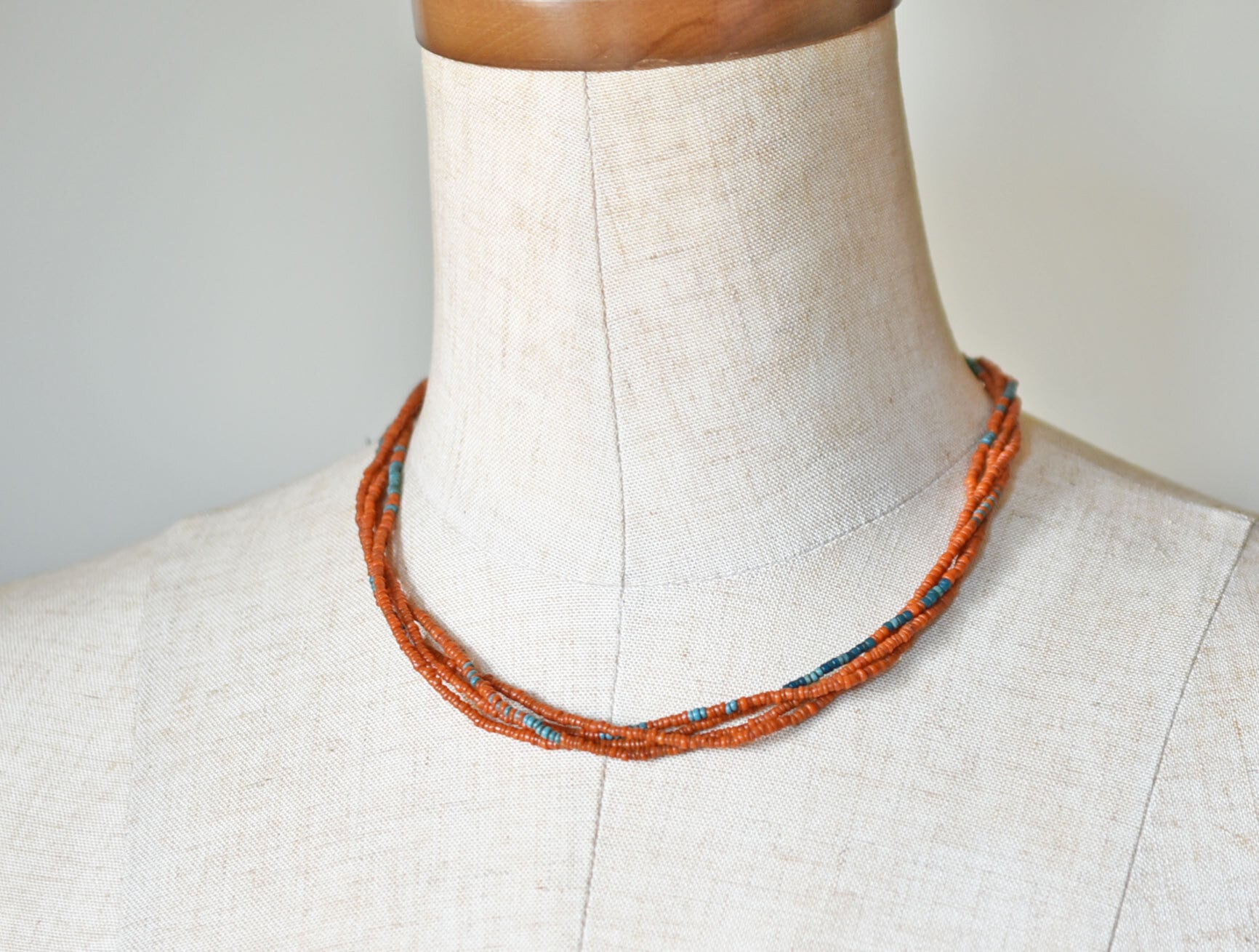 アンティークオレンジ色&水浅葱色シードビーズの4連ネックレス(ターコイズ留め金)