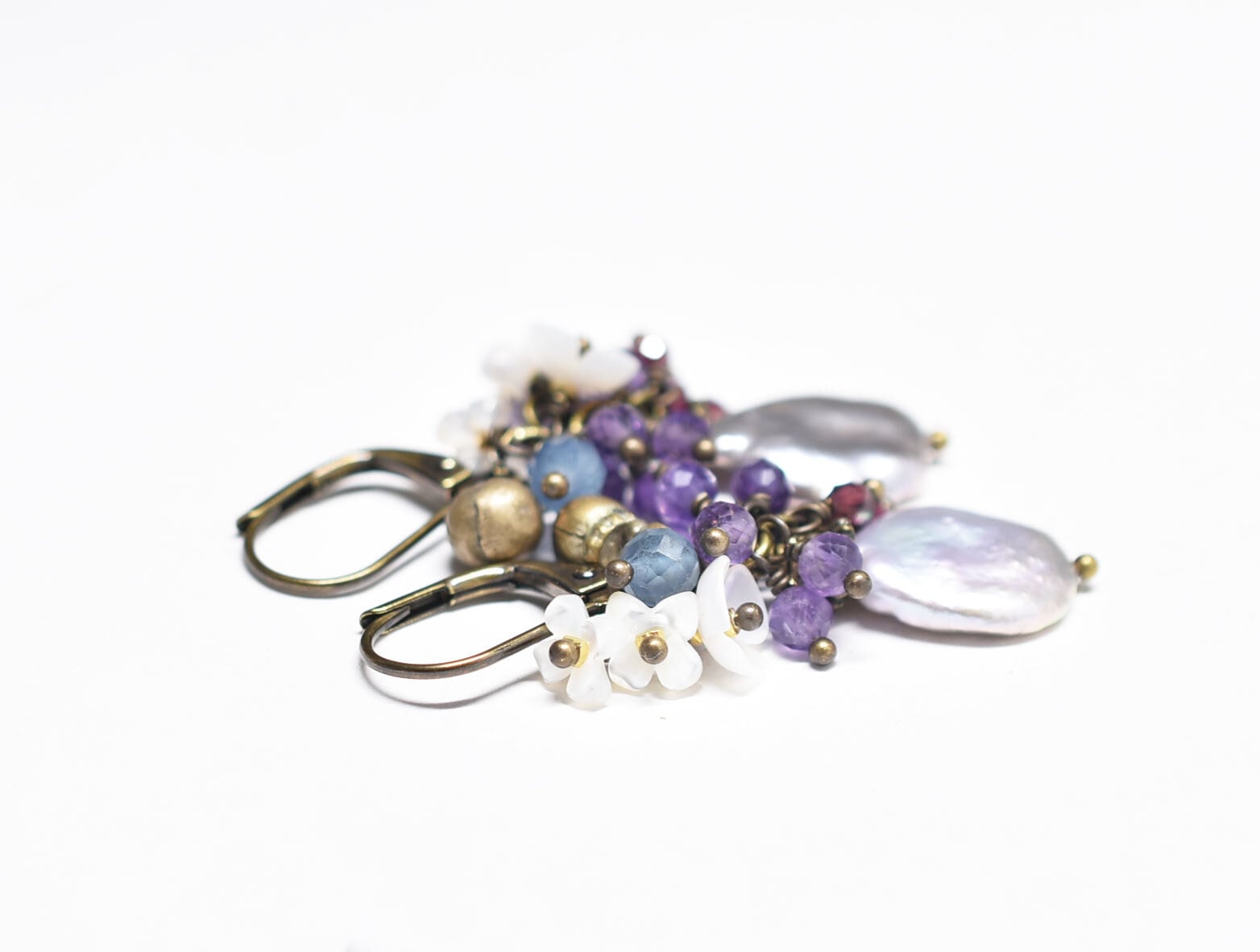 バロックパールとたわわなストーンビーズ、白蝶貝の小花、民族鈴を繋いだピアスです。