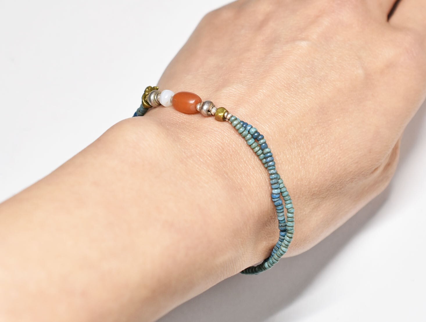 シャン族ヴィンテージカーネリアン、古代瑪瑙、oldチンシルバー&オリッサブラスのアンティーク水浅葱色mixシードビーズを繋いだ華奢なブレスです。