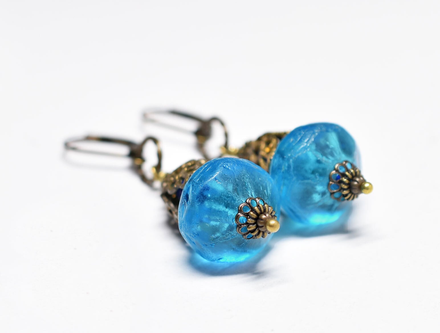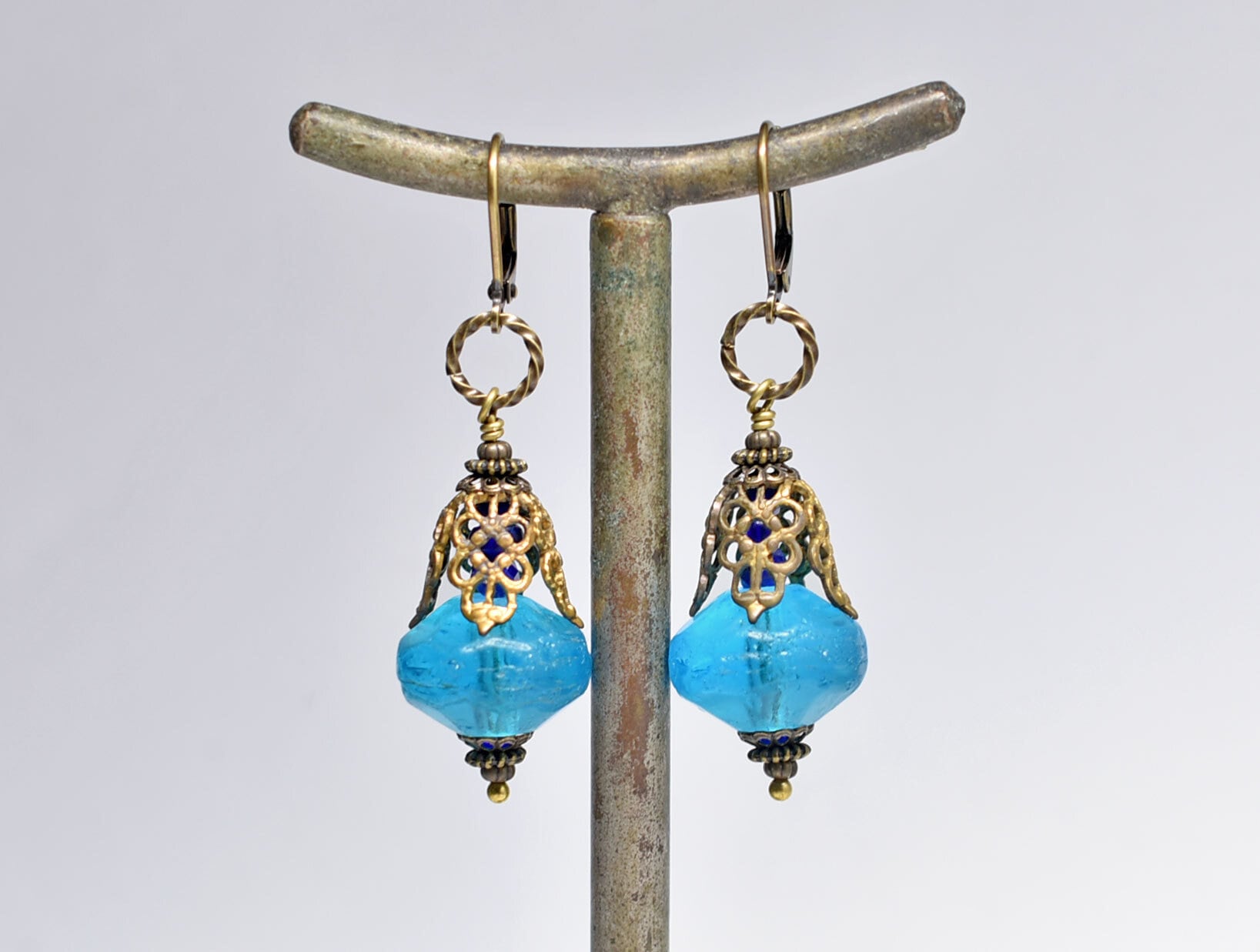 ブルー算盤型アンティークボヘミアビーズと繊細装飾ブラスキャップ、ラピスとブルービーズのピアス