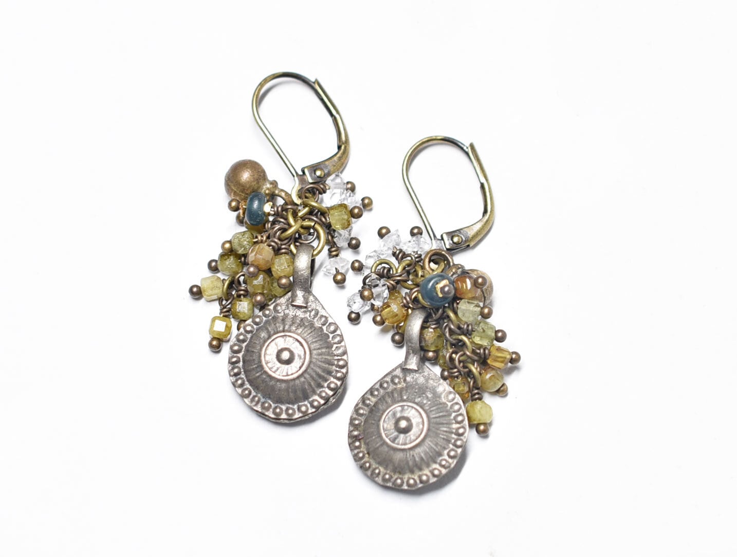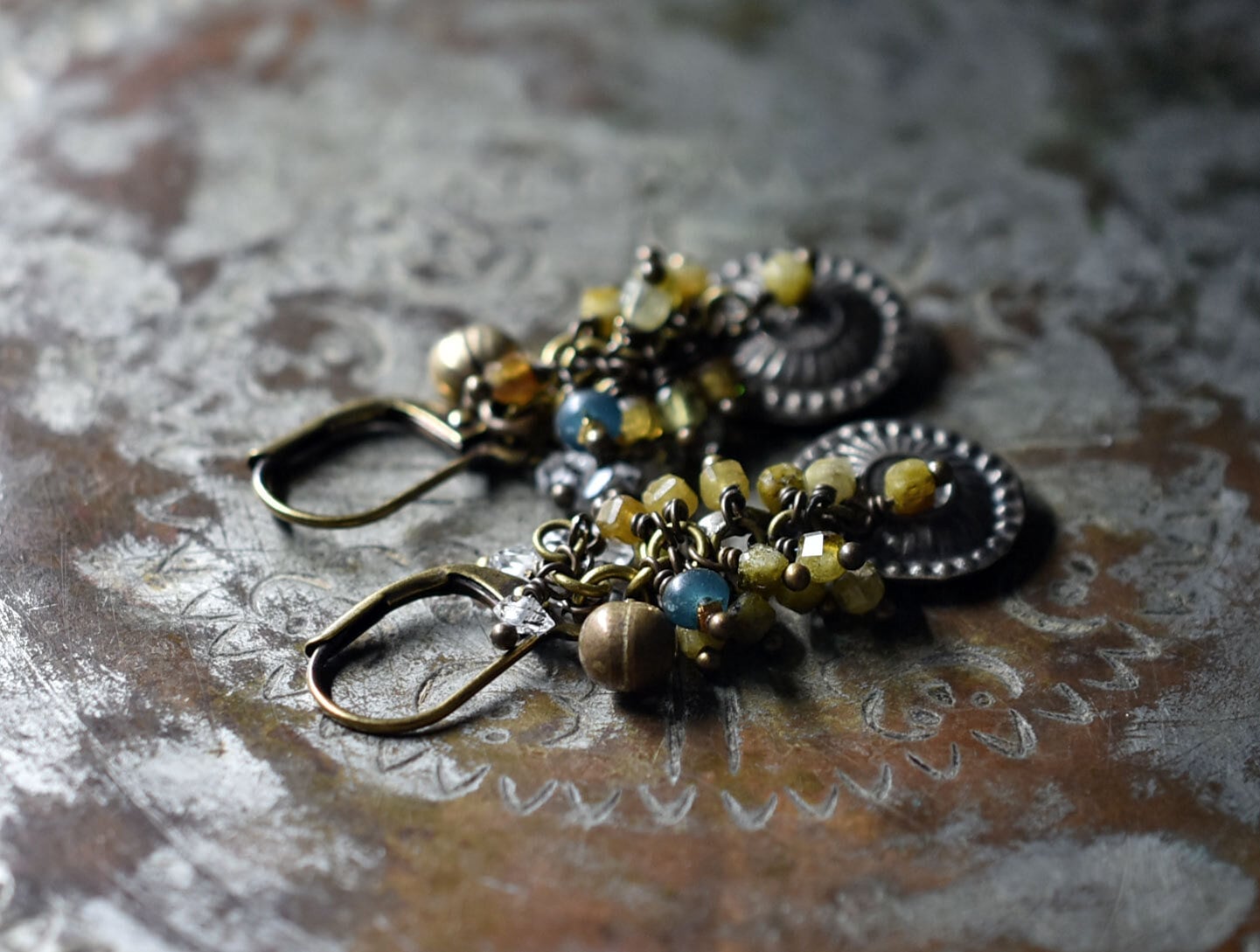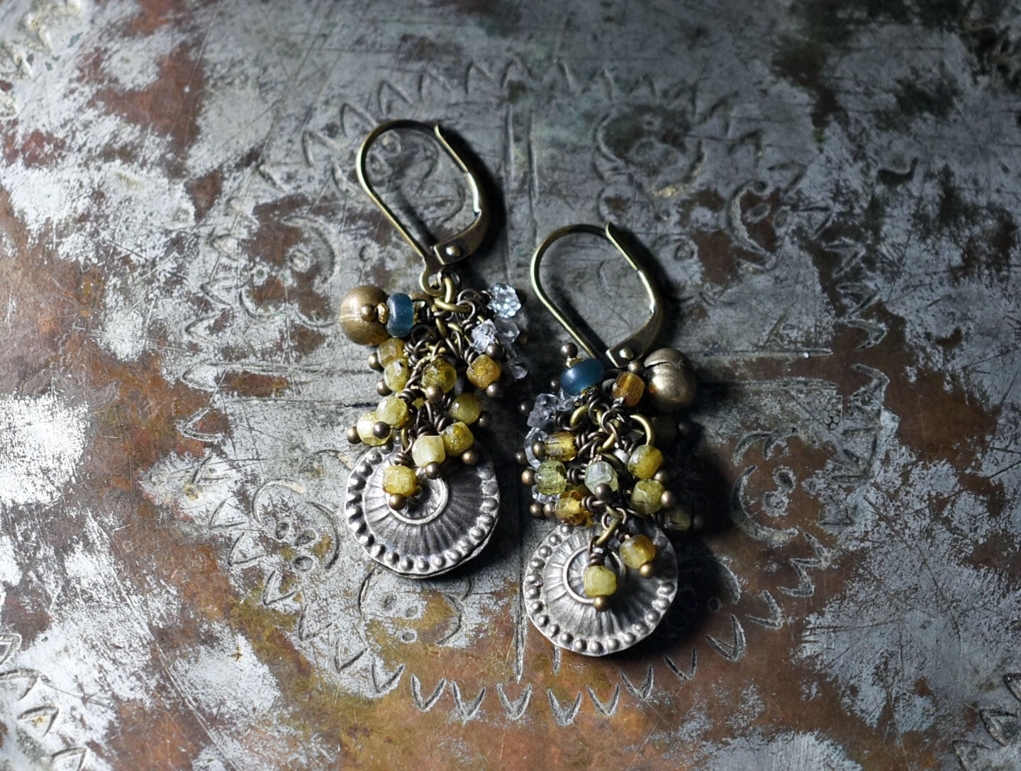 太陽の様なoldアフガンメタルパーツとたわわなトルマリン&ハーキマーダイヤモンド、インディゴブルービーズ、民族鈴のピアス