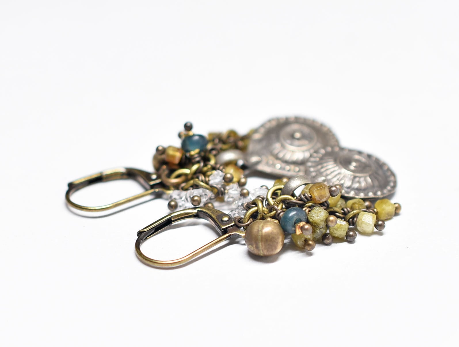 太陽の様なoldアフガンメタルパーツとたわわなトルマリン&ハーキマーダイヤモンド、インディゴブルービーズ、民族鈴を繋いだピアスです。