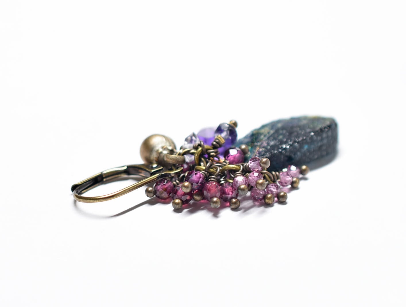 ブルーグリーン銀化のローマングラスとアメジスト、たわわなストーンビーズ、民族鈴の片耳ピアス