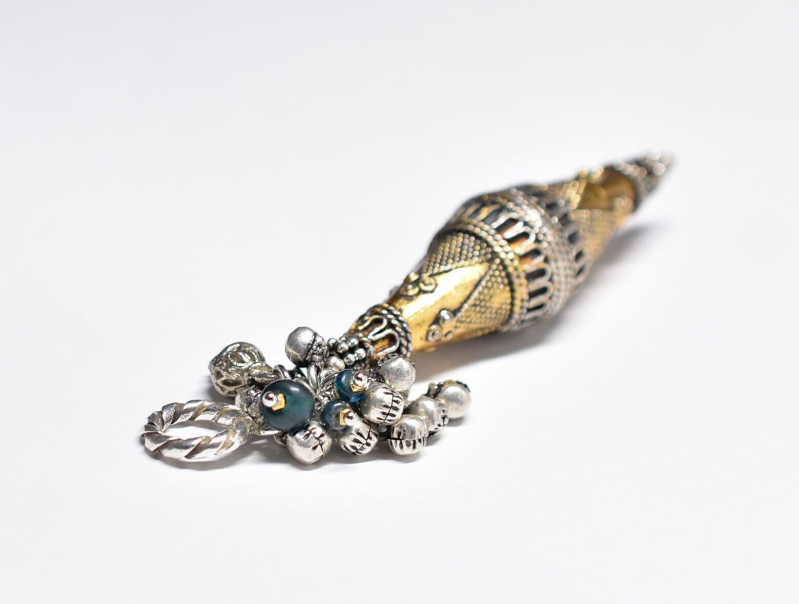 トルクメニスタン細工ビーズとたわわなインドシルバー鈴、インドピューター、インディゴブルービーズのペンダントトップ