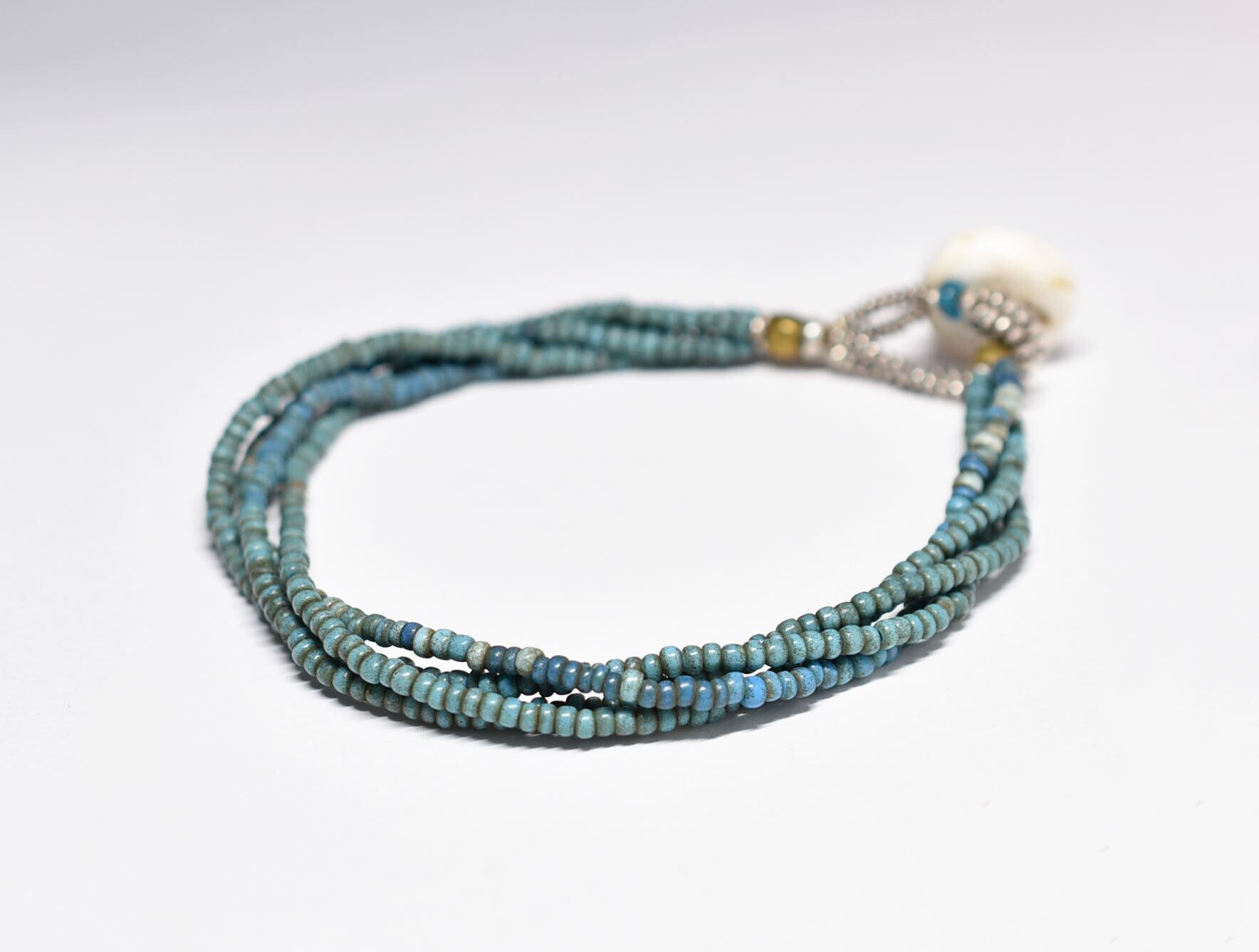 留め金部分のエメラルドブルービーズはインドパシフィックビーズと呼ばれるアンティークビーズです。インドパシフィックビーズの起源は、紀元前2世紀と言われています。こちらのビーズはインドネシアの出土品です。年代はなんと!10世紀頃なので1000年前以上のビーズです!