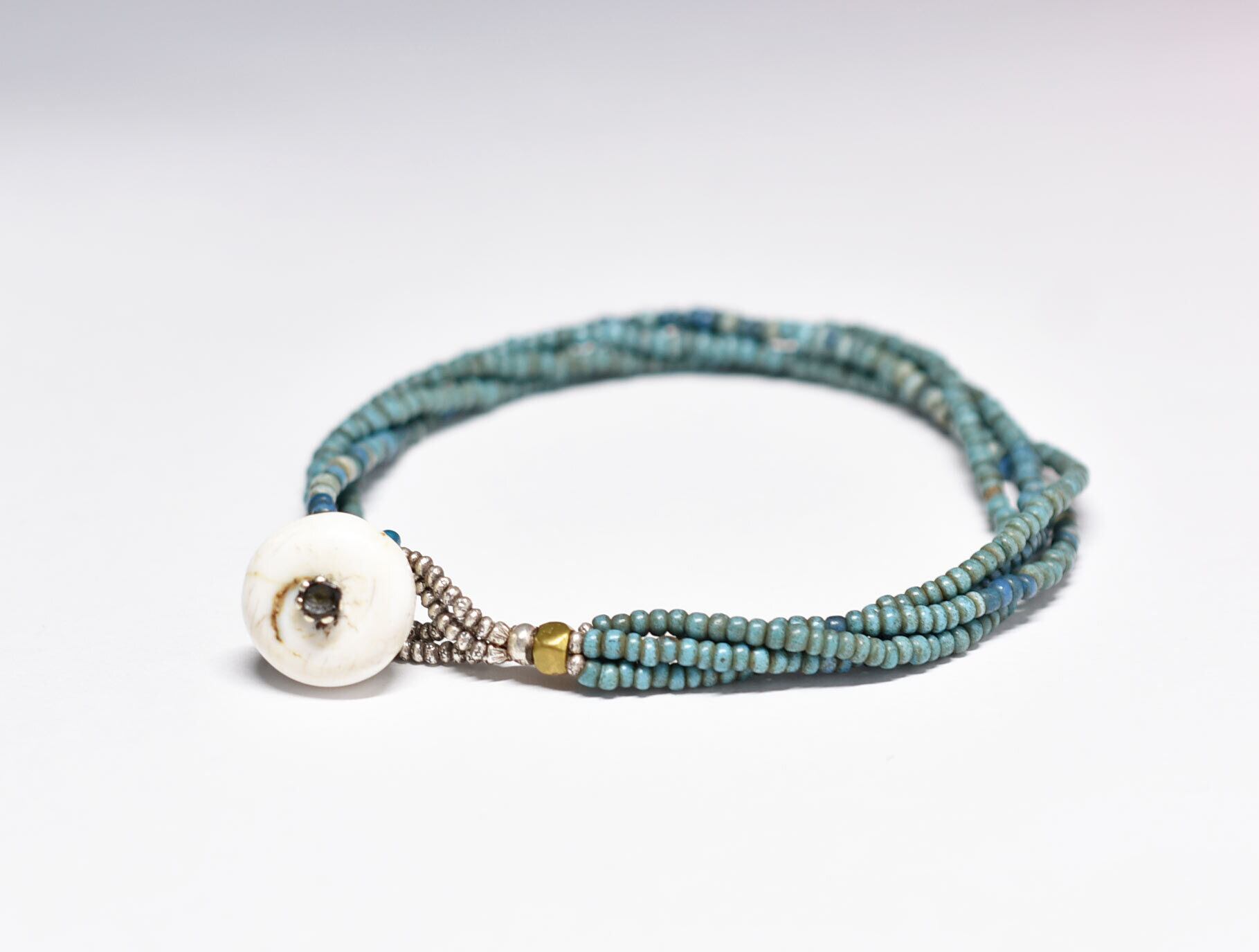 民族の古いネックレスの留め金に使われていた貝をこのブレスも留め金にしました。