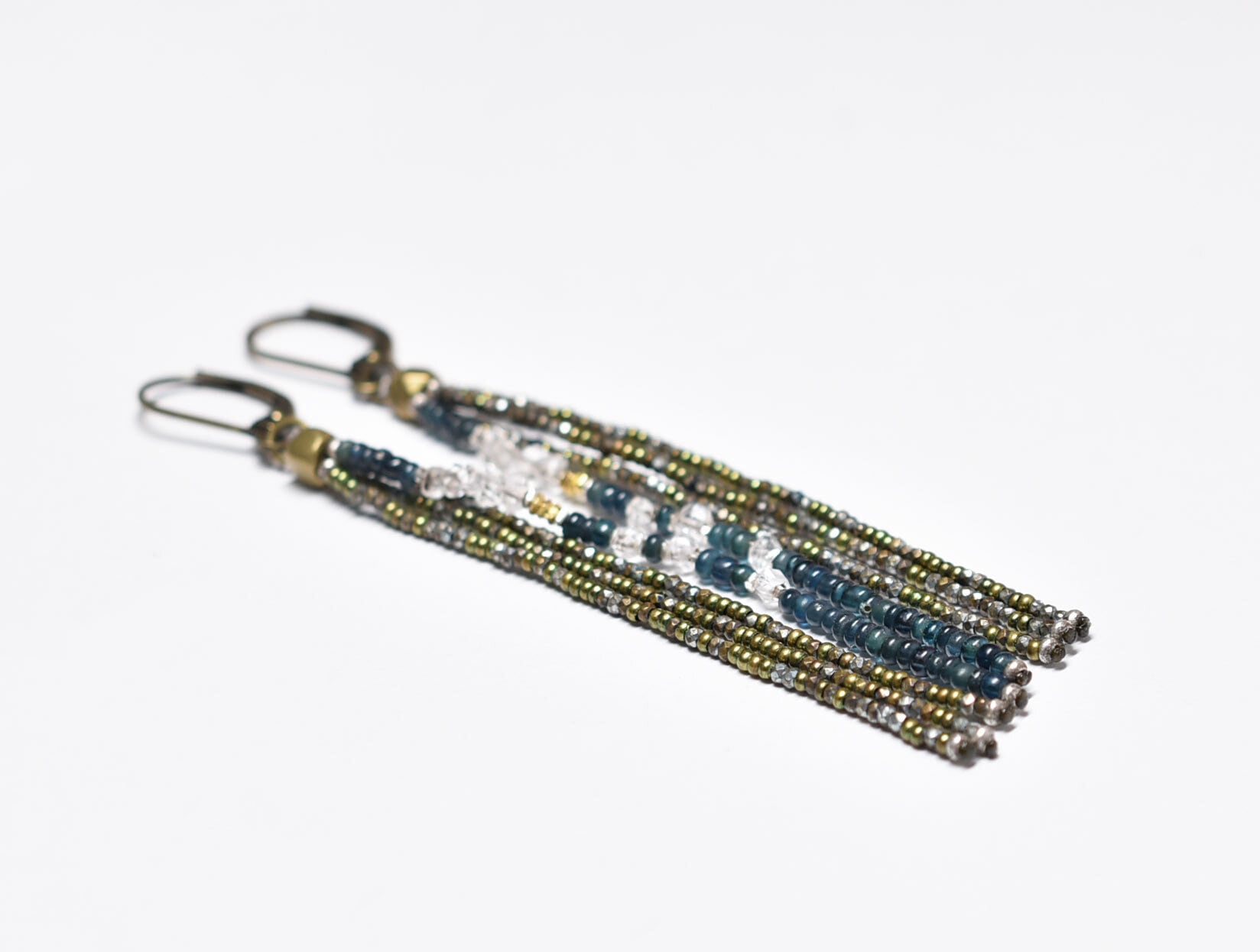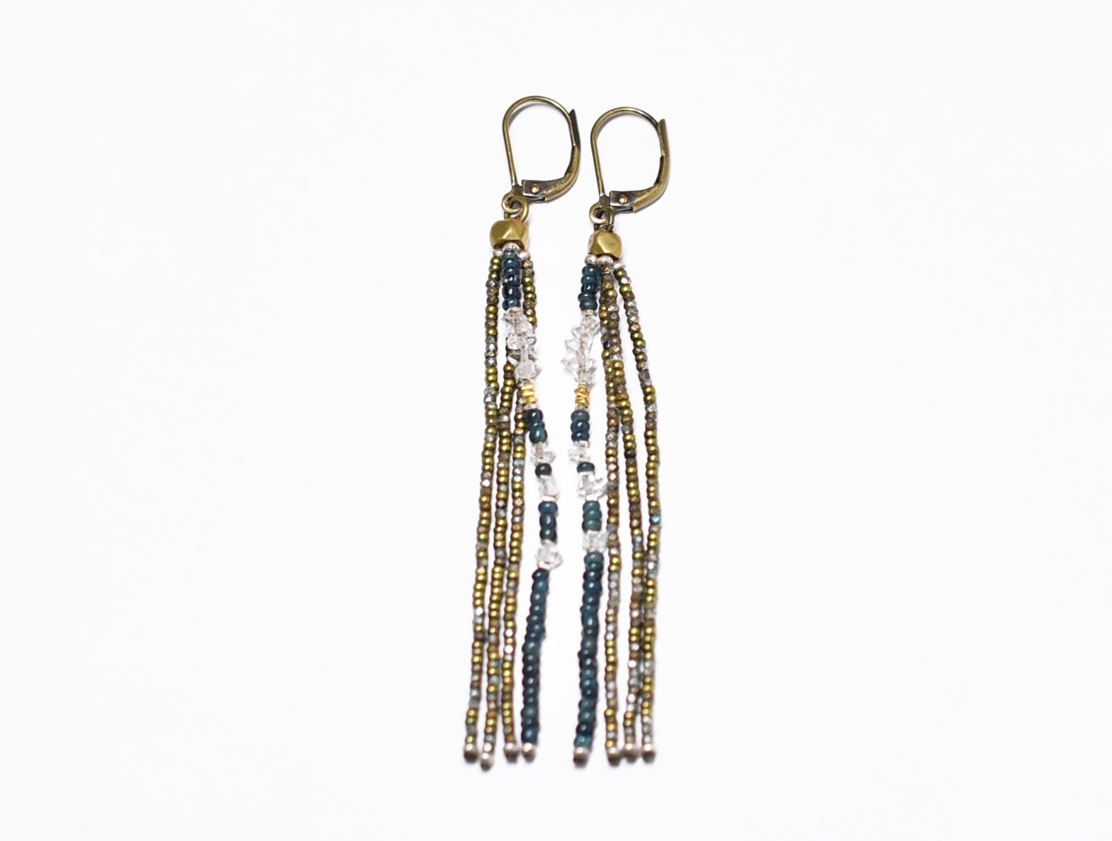 フランスアンティークカットメタルビーズとインディゴブルーアンティークビーズ、ハーキマーダイヤモンドを繋いだ4連ピアスです。