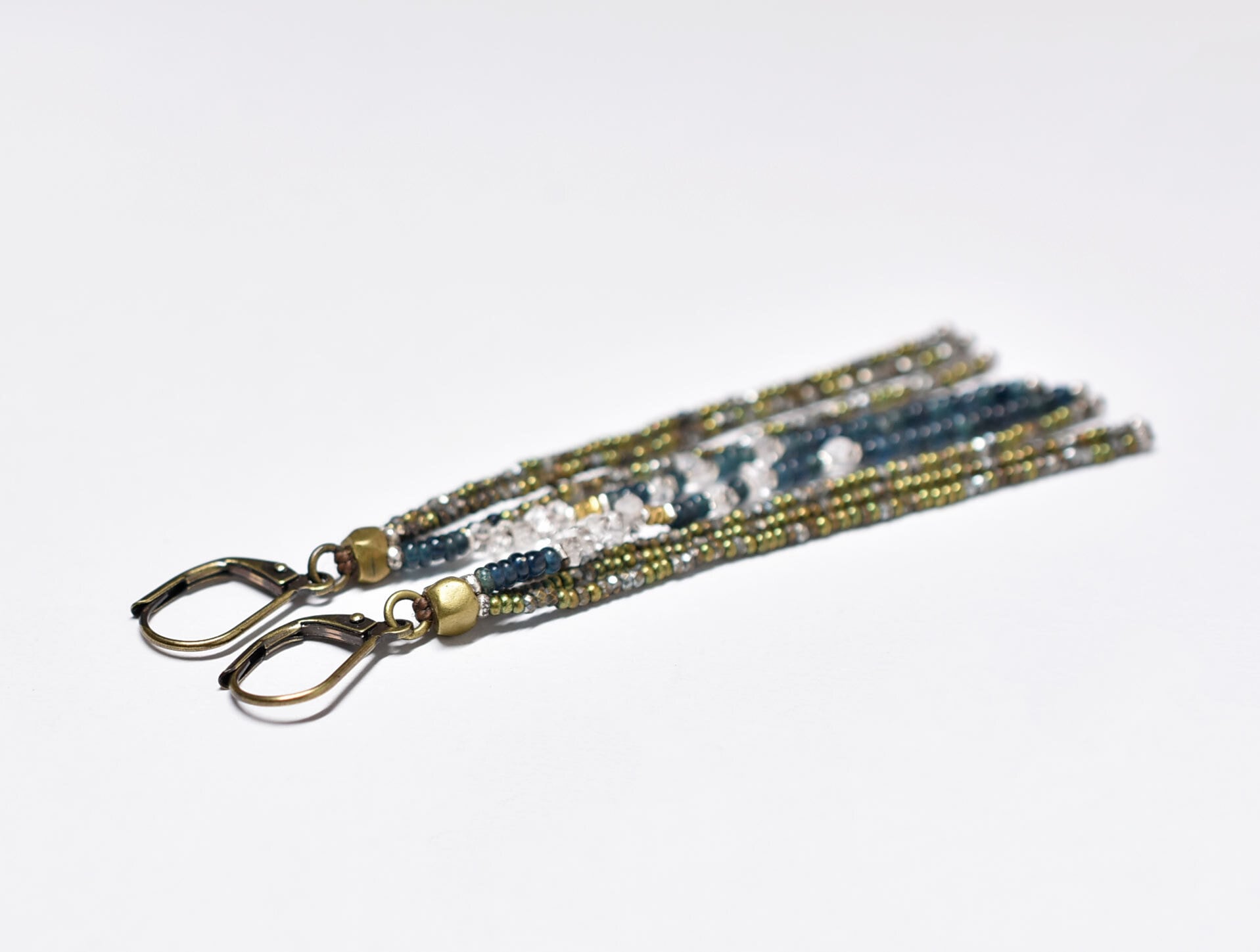 フランスアンティークカットメタルビーズとインディゴブルーアンティークビーズ、ハーキマーダイヤモンドの4連ピアス