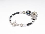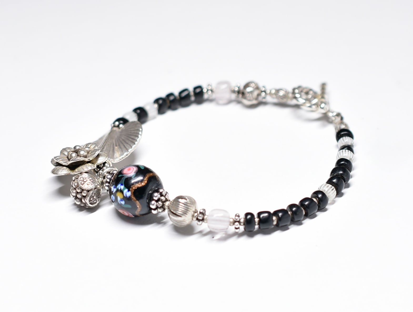 漆黒ヴェネチアアンティーク薔薇と勿忘草とカレンシルバー、グーズベリー、漆黒ビーズのブレス