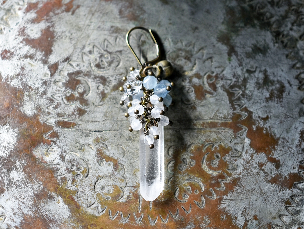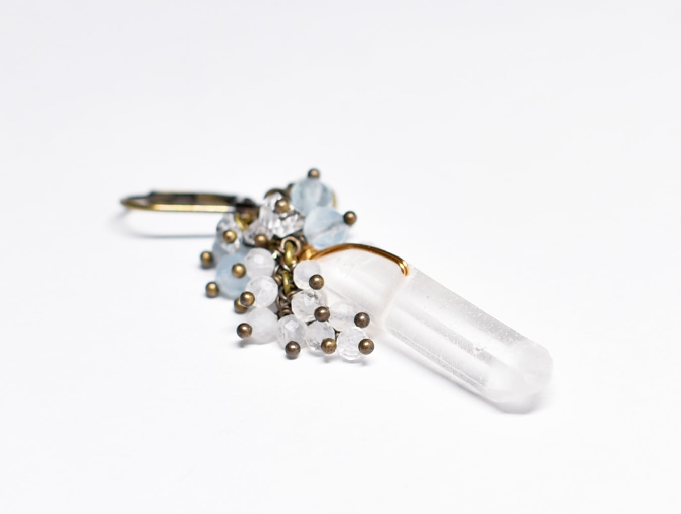 氷柱水晶とたわわなストーンビーズ、民族鈴の片耳ピアス